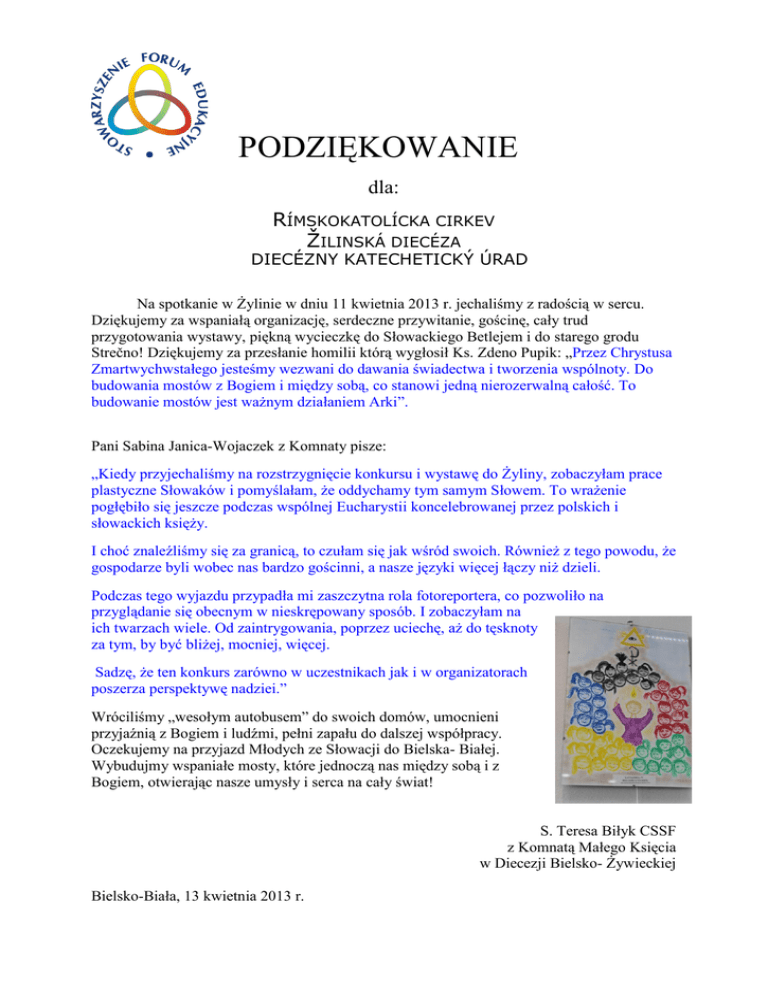 PODZIĘKOWANIE dla: RÍMSKOKATOLÍCKA CIRKEV ŽILINSKÁ DIECÉZA DIECÉZNY KATECHETICKÝ ÚRAD Na spotkanie w Żylinie w dniu 11 kwietnia 2013 r. jechaliśmy z radością w sercu. Dziękujemy za wspaniałą organizację, serdeczne przywitanie, gościnę, cały trud przygotowania wystawy, piękną wycieczkę do Słowackiego Betlejem i do starego grodu Strečno! Dziękujemy za przesłanie homilii którą wygłosił Ks. Zdeno Pupik: „Przez Chrystusa Zmartwychwstałego jesteśmy wezwani do dawania świadectwa i tworzenia wspólnoty. Do budowania mostów z Bogiem i między sobą, co stanowi jedną nierozerwalną całość. To budowanie mostów jest ważnym działaniem Arki”. Pani Sabina Janica-Wojaczek z Komnaty pisze: „Kiedy przyjechaliśmy na rozstrzygnięcie konkursu i wystawę do Żyliny, zobaczyłam prace plastyczne Słowaków i pomyślałam, że oddychamy tym samym Słowem. To wrażenie pogłębiło się jeszcze podczas wspólnej Eucharystii koncelebrowanej przez polskich i słowackich księży. I choć znaleźliśmy się za granicą, to czułam się jak wśród swoich. Również z tego powodu, że gospodarze byli wobec nas bardzo gościnni, a nasze języki więcej łączy niż dzieli. Podczas tego wyjazdu przypadła mi zaszczytna rola fotoreportera, co pozwoliło na przyglądanie się obecnym w nieskrępowany sposób. I zobaczyłam na ich twarzach wiele. Od zaintrygowania, poprzez uciechę, aż do tęsknoty za tym, by być bliżej, mocniej, więcej. Sadzę, że ten konkurs zarówno w uczestnikach jak i w organizatorach poszerza perspektywę nadziei.” Wróciliśmy „wesołym autobusem” do swoich domów, umocnieni przyjaźnią z Bogiem i ludźmi, pełni zapału do dalszej współpracy. Oczekujemy na przyjazd Młodych ze Słowacji do Bielska- Białej. Wybudujmy wspaniałe mosty, które jednoczą nas między sobą i z Bogiem, otwierając nasze umysły i serca na cały świat! S. Teresa Biłyk CSSF z Komnatą Małego Księcia w Diecezji Bielsko- Żywieckiej Bielsko-Biała, 13 kwietnia 2013 r.