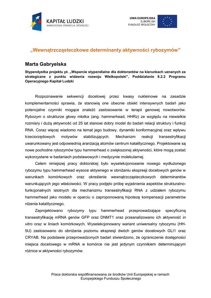 „Wewnątrzcząsteczkowe determinanty aktywności rybozymów” Marta Gabryelska Stypendystka projektu pt. „Wsparcie stypendialne dla doktorantów na kierunkach uznanych za strategiczne z punktu widzenia rozwoju Wielkopolski”, Poddziałanie 8.2.2 Programu Operacyjnego Kapitał Ludzki Rozpoznawanie sekwencji docelowej przez kwasy nukleinowe na zasadzie komplementarności sprawia, że stanowią one obecnie obiekt intensywnych badań jako potencjalne czynniki mogące znaleźć zastosowanie w terapii genowej nowotworów. Rybozym o strukturze głowy młotka (ang. hammerhead, HHRz) ze względu na niewielkie rozmiary i dużą aktywność od 25 lat stanowi dobry model do badań relacji struktury i funkcji RNA. Coraz więcej wiadomo na temat jego budowy, dynamiki konformacyjnej oraz wpływu trzeciorzędowych motywów stabilizujących. Mechanizm reakcji transestryfikacji uwarunkowany jest odpowiednią aranżacją atomów centrum katalitycznego. Projektowane są nowe pochodne rybozymów typu hammerhead o zwiększonej aktywności, które mogą zostać wykorzystane w badaniach podstawowych i medycynie molekularnej. Celem niniejszej pracy doktorskiej było wyselekcjonowanie nowego wydłużonego rybozymu typu hammerhead wysoce aktywnego w obniżaniu ekspresji docelowych genów w warunkach komórkowych oraz określenie wewnątrzcząsteczkowych determinantów warunkujących jego właściwości. W pracy podjęto próbę wyjaśnienia aspektów strukturalnofunkcjonalnych istotnych dla mechanizmu transestryfikacji RNA z udziałem rybozymu hammerhead jako modelu w oparciu o zaproponowaną hipotezę kompensacji parametrów rdzenia katalitycznego. Zaprojektowano rybozymy typu hammerhead przeprowadzające specyficzną transestryfikację mRNA genów GFP oraz DNMT1 oraz przeanalizowano ich aktywność in vitro oraz w liniach komórkowych. Wyselekcjonowany wariant uniwersalny rybozymu (HH5U) zastosowano do obniżania poziomu ekspresji dwóch genów docelowych GLI1 oraz CRYAB. Na podstawie przeprowadzonych badań stwierdzono, że ograniczenie dostępności miejsca docelowego w mRNA w komórce nie jest jedynym czynnikiem determinującym różnice w aktywności rybozymów. Praca doktorska współfinansowana ze środków Unii Europejskiej w ramach Europejskiego Funduszu Społecznego Przeprowadzono weryfikację struktury drugorzędowej badanych cząsteczek. Projektowanie RNA w oparciu o dowolne łączenie bloków o danej strukturze zostało wsparte modelowaniem struktury drugorzędowej w oparciu o minimalizację energii swobodnej oraz weryfikację metodami chemicznymi i enzymatycznymi. Wykorzystując symulacje komputerowe oraz analizy obliczeniowe rybozymów w kompleksie z substratami stwierdzono, że nawet najmniejsze różnice w sekwencji rybozymów (już od 1 nukleotydu) oddalonej od centrum katalitycznego mogą silnie wpływać na jego własności. Ustalono wewnątrzcząsteczkowe determinanty aktywności katalitycznych RNA na przykładzie rybozymów typu hammerhead, stanowiące zdefiniowane odległości oraz kąty pomiędzy zdefiniowanymi atomami centrum katalitycznego. Na podstawie obliczeń parametrów centrum katalitycznego oszacowano unikalny profil („odcisk palca”) geometrycznymi rybozymu. Oszacowano parametrami cząsteczek prawie oraz ich całkowitą korelację właściwościami pomiędzy katalitycznymi. Stwierdzono, że oddalenie G12(N1) od C17(2’O) oraz przybliżenie G8(2’O) do C1.1(5’O) jest parametrem umożliwiającym przewidywanie wewnątrzkomórkowej aktywności rybozymów (Rys.1.). Rys.1. Wykorzystanie unikalnego „odcisku palca” rybozymu do przewidywania wewnątrzkomórkowej aktywności cząsteczki. Praca doktorska współfinansowana ze środków Unii Europejskiej w ramach Europejskiego Funduszu Społecznego Istotnym osiągnięciem tej pracy jest zaproponowanie wysoce skutecznego w układzie zywym rybozymu hammerhead jako narzędzia terapii genowej. Opracowano metody projektowania rybozymów w oparciu o hipotezę kompensacji parametrów rdzenia katalitycznego. Szersze rozpatrywanie zagadnienia zależności struktury i funkcji oraz wzbogacenie jej o badanie wpływu elementu sekwencji i oparcie w metodach obliczeniowych umożliwia powrót do badań nad rybozymami w odświeżonym kontekście. Zaproponowana metoda obliczeniowa stanowi pierwsze podejście in silico do przewidywania wewnątrzkomórkowej aktywności RNA. Może ona znaleźć szerokie zastosowanie do projektowania innych RNA o sprecyzowanej funkcji. Praca doktorska współfinansowana ze środków Unii Europejskiej w ramach Europejskiego Funduszu Społecznego