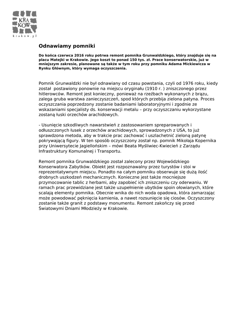 Odnawiamy pomniki Do końca czerwca 2016 roku potrwa remont pomnika Grunwaldzkiego, który znajduje się na placu Matejki w Krakowie. Jego koszt to ponad 150 tys. zł. Prace konserwatorskie, już w mniejszym zakresie, planowane są także w tym roku przy pomniku Adama Mickiewicza w Rynku Głównym, który wymaga oczyszczenia. Pomnik Grunwaldzki nie był odnawiany od czasu powstania, czyli od 1976 roku, kiedy został postawiony ponownie na miejscu oryginału (1910 r. ) zniszczonego przez hitlerowców. Remont jest konieczny, ponieważ na rzeźbach wykonanych z brązu, zalega gruba warstwa zanieczyszczeń, spod których przebija zielona patyna. Proces oczyszczania poprzedzony zostanie badaniami laboratoryjnymi i zgodnie ze wskazaniami specjalisty ds. konserwacji metalu – przy oczyszczaniu wykorzystane zostaną łuski orzechów arachidowych. - Usunięcie szkodliwych nawarstwień z zastosowaniem spreparowanych i odłuszczonych łusek z orzechów arachidowych, sprowadzonych z USA, to już sprawdzona metoda, aby w trakcie prac zachować i uszlachetnić zieloną patynę pokrywającą figury. W ten sposób oczyszczony został np. pomnik Mikołaja Kopernika przy Uniwersytecie Jagiellońskim – mówi Beata Myśliwiec-Kwiecień z Zarządu Infrastruktury Komunalnej i Transportu. Remont pomnika Grunwaldzkiego został zalecony przez Wojewódzkiego Konserwatora Zabytków. Obiekt jest rozpoznawalny przez turystów i stoi w reprezentatywnym miejscu. Ponadto na całym pomniku obserwuje się dużą ilość drobnych uszkodzeń mechanicznych. Konieczne jest także mocniejsze przymocowanie tablic z herbami, aby zapobieć ich zniszczeniu czy oderwaniu. W ramach prac przewidziane jest także uzupełnienie ubytków spoin ołowianych, które scalają elementy pomnika. Obecnie wnika do nich woda opadowa, która zamarzając może powodować pęknięcia kamienia, a nawet rozsunięcie się ciosów. Oczyszczony zostanie także granit z podstawy monumentu. Remont zakończy się przed Światowymi Dniami Młodzieży w Krakowie. Powered by TCPDF (www.tcpdf.org)
