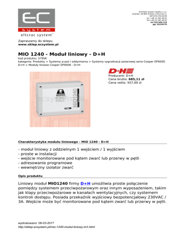 ELTCRAC System Spółka z o.o. siedziba: 30-803 Kraków ul.Ruciana 3, NIP 679-278-49-99 tel: +48 12 292 48 61 fax:+48 12 292 48 62 tel 535-999-116 gg: 35229170 Zapraszamy do sklepu www.sklep.ecsystem.pl MIO 1240 - Moduł liniowy - D+H kod produktu: 5795K kategoria: Produkty > Systemy p-poż i oddymiania > Systemy sygnalizacji pożarowej seria Cooper DF6000 D+H > Moduły liniowe Cooper DF6000 - D+H Producent: D+H Cena brutto: 685,11 zł Cena netto: 557,00 zł Charakterystyka modułu liniowego - MIO 1240 - D+H - moduł liniowy z oddzielnym 1 wejściem / 1 wyjściem proste w instalacji wejście monitorowane pod kątem zwarć lub przerwy w pętli adresowanie programowe wewnętrzny izolator zwarć Opis produktu Liniowy moduł MIO1240 firmy D+H umożliwia proste połączenie pomiędzy systemem przeciwpożarowym oraz innym wyposażeniem, takim jak klapy przeciwpożarowe w kanałach wentylacyjnych, czy systemem kontroli dostępu. Posiada przekaźnik wyjściowy bezpotencjałowy 230VAC / 3A. Wejście może być monitorowane pod kątem zwarć lub przerwy w pętli. wydrukowano: 09-03-2017 http://sklep-ecsystem.pl/mio-1240-modul-liniowy-d-h.html Zapraszamy do kontaktu: wydrukowano: 09-03-2017 http://sklep-ecsystem.pl/mio-1240-modul-liniowy-d-h.html