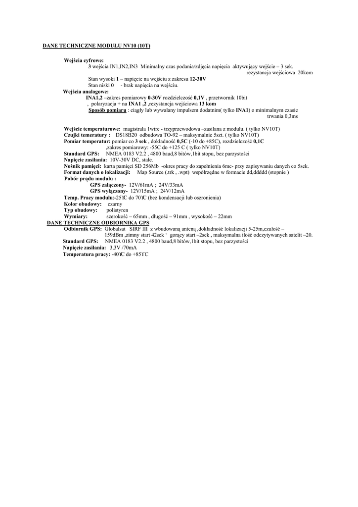 DANE TECHNICZNE MODUŁU NV10 (10T) Wejścia cyfrowe: 3 wejścia IN1,IN2,IN3 Minimalny czas podania/zdjęcia napięcia aktywujący wejście – 3 sek. rezystancja wejściowa 20kom Stan wysoki 1 – napięcie na wejściu z zakresu 12-30V Stan niski 0 - brak napięcia na wejściu. Wejścia analogowe: INA1,2 –zakres pomiarowy 0-30V rozdzielczość 0,1V , przetwornik 10bit , polaryzacja + na INA1 ,2 ,rezystancja wejściowa 13 kom Sposób pomiaru : ciągły lub wywalany impulsem dodatnim( tylko INA1) o minimalnym czasie trwania 0,3ms Wejście temperaturowe: magistrala 1wire - trzyprzewodowa –zasilana z modułu. ( tylko NV10T) Czujki temeratury : DS18B20 odbudowa TO-92 – maksymalnie 5szt. ( tylko NV10T) Pomiar temperatur: pomiar co 3 sek , dokładność 0,5C (-10 do +85C), rozdzielczość 0,1C ,zakres pomiarowy: -55C do +125 C ( tylko NV10T) Standard GPS: NMEA 0183 V2.2 , 4800 baud,8 bitów,1bit stopu, bez parzystości Napięcie zasilania: 10V-30V DC, stałe. Nośnik pamięci: karta pamięci SD 256Mb -okres pracy do zapełnienia 6mc- przy zapisywaniu danych co 5sek. Format danych o lokalizacji: Map Source (.trk , .wpt) współrzędne w formacie dd,ddddd (stopnie ) Pobór prądu modułu : GPS załączony- 12V/61mA ; 24V/33mA GPS wyłączony- 12V/15mA ; 24V/12mA Temp. Pracy modułu:-25°C do 70°C (bez kondensacji lub oszronienia) Kolor obudowy: czarny Typ obudowy: polistyren Wymiary: szerokość – 65mm , długość – 91mm , wysokość – 22mm DANE TECHNICZNE ODBIORNIKA GPS Odbiornik GPS: Globalsat SIRF III z wbudowaną anteną ,dokładność lokalizacji 5-25m,czułość – 159dBm ,zimny start 42sek ‘ gorący start –2sek , maksymalna ilość odczytywanych satelit –20. Standard GPS: NMEA 0183 V2.2 , 4800 baud,8 bitów,1bit stopu, bez parzystości Napięcie zasilania: 3,3V /70mA Temperatura pracy: -40°C do +85° C