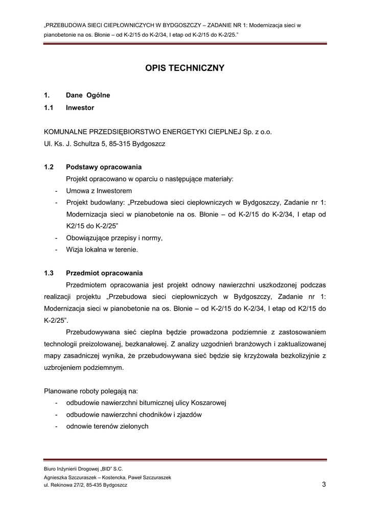 „PRZEBUDOWA SIECI CIEPŁOWNICZYCH W BYDGOSZCZY – ZADANIE NR 1: Modernizacja sieci w pianobetonie na os. Błonie – od K-2/15 do K-2/34, I etap od K-2/15 do K-2/25.” OPIS TECHNICZNY 1. Dane Ogólne 1.1 Inwestor KOMUNALNE PRZEDSIĘBIORSTWO ENERGETYKI CIEPLNEJ Sp. z o.o. Ul. Ks. J. Schultza 5, 85-315 Bydgoszcz 1.2 Podstawy opracowania Projekt opracowano w oparciu o następujące materiały: - Umowa z Inwestorem - Projekt budowlany: „Przebudowa sieci ciepłowniczych w Bydgoszczy, Zadanie nr 1: Modernizacja sieci w pianobetonie na os. Błonie – od K-2/15 do K-2/34, I etap od K2/15 do K-2/25” - Obowiązujące przepisy i normy, - Wizja lokalna w terenie. 1.3 Przedmiot opracowania Przedmiotem opracowania jest projekt odnowy nawierzchni uszkodzonej podczas realizacji projektu „Przebudowa sieci ciepłowniczych w Bydgoszczy, Zadanie nr 1: Modernizacja sieci w pianobetonie na os. Błonie – od K-2/15 do K-2/34, I etap od K2/15 do K-2/25”. Przebudowywana sieć cieplna będzie prowadzona podziemnie z zastosowaniem technologii preizolowanej, bezkanałowej. Z analizy uzgodnień branżowych i zaktualizowanej mapy zasadniczej wynika, że przebudowywana sieć będzie się krzyżowała bezkolizyjnie z uzbrojeniem podziemnym. Planowane roboty polegają na: - odbudowie nawierzchni bitumicznej ulicy Koszarowej - odbudowie nawierzchni chodników i zjazdów - odnowie terenów zielonych Biuro Inżynierii Drogowej „BID” S.C. Agnieszka Szczuraszek – Kostencka, Paweł Szczuraszek ul. Rekinowa 27/2, 85-435 Bydgoszcz 3 „PRZEBUDOWA SIECI CIEPŁOWNICZYCH W BYDGOSZCZY – ZADANIE NR 1: Modernizacja sieci w pianobetonie na os. Błonie – od K-2/15 do K-2/34, I etap od K-2/15 do K-2/25.” 1.4 Stan istniejący Przebudowywana sieć ciepłownicza zlokalizowana jest wzdłuż ul. Koszarowej na Osiedlu Błonie w Bydgoszczy. Teren jw. jest usytuowany w dzielnicy mieszkaniowej, jest gęsto zabudowany i posiada rozbudowaną infrastrukturę technicznego uzbrojenia podziemnego. Dla przedmiotowego terenu nie ma uchwalonego miejscowego planu zagospodarowania przestrzennego, jednak ze względu na fakt, iż przebudowa dotyczy sieci osiedlowej oraz nie występuje zmiana sposobu zagospodarowania terenu, zgodnie z obowiązującymi przepisami decyzja o ustaleniu lokalizacji inwestycji celu publicznego nie jest wymagana. Ulica Koszarowa na odcinku między ul. 16 Pułku Ułanów Wielkopolskich i ul. Połtyna ma nawierzchnię bitumiczną, o średniej szerokości 6,0m ograniczoną z obu stron krawężnikiem wyniesionym. Po obu stronach ulicy zlokalizowany jest chodnik o nawierzchni z płyt betonowych, miejscami oddzielony od jezdni pasem zieleni. Lokalnie występują zatoki postojowe oraz drogi dojazdowe do garaży i parkingów. 1.6 Roboty ziemne Roboty ziemne należy wykonać zgodnie z projektem przebudowy sieci ciepłowniczej, zasypkę wykopu należy zagęszczać warstwami grubości maksymalnie 30cm do Is=min1,0. Podłoże pod nawierzchnię należy przygotować zgodnie z PN-S-02205. Projekt odnowy nawierzchni nie obejmuje bilansu robót ziemnych. 2. Część technologiczna 2.1 Rozwiązania projektowe Projekt przewiduje odtworzenie istniejącej nawierzchni jezdni, chodników, zjazdów itd. oraz terenów zielonych zgodnie z załączonymi przekrojami konstrukcyjnymi. Kształt i kolor materiałów betonowych użytych przy rekonstrukcji nawierzchni (tj. płyt chodnikowych, kostki betonowej) należy dostosować do stanu sprzed wykonania robót i otaczającego zagospodarowania. Ze względu na wysoki stopień zużycia niektórych elementów infrastruktury oraz wiek tych elementów, przyjęto, że nie będzie możliwe odtworzenie istniejącego zagospodarowania terenu przy wykorzystaniu materiałów wyłącznie z rozbiórki. Założono wykorzystanie elementów pochodzących z rozbiórki: Biuro Inżynierii Drogowej „BID” S.C. Agnieszka Szczuraszek – Kostencka, Paweł Szczuraszek ul. Rekinowa 27/2, 85-435 Bydgoszcz 4 „PRZEBUDOWA SIECI CIEPŁOWNICZYCH W BYDGOSZCZY – ZADANIE NR 1: Modernizacja sieci w pianobetonie na os. Błonie – od K-2/15 do K-2/34, I etap od K-2/15 do K-2/25.” - krawężniki, oporniki – 0% - obrzeża chodnikowe – 25% - kostka betonowa – 90% - płyty chodnikowe – 25% - trylinka betonowa – 25% Spadki podłużne i poprzeczne oraz sposób odwodnienia nawierzchni należy przywrócić do stanu pierwotnego oraz dopasować do otaczających nawierzchni. Pełną konstrukcję nawierzchni jezdni należy odtworzyć na szerokości wykopu oraz w zasięgu klina odłamu gruntu, warstwę ścieralną natomiast na szerokości całego pasa ruchu objętego pracami. Nawierzchnia jezdni – pełna konstrukcja warstwa ścieralna z betonu asfaltowego AC11S 50/70 grub. 5 cm warstwa wiążąca z betonu asfaltowego AC22W 35/50 grub. 6 cm Podbudowa pomocnicza z kruszywa łamanego stabilizowanego mechanicznie 0/63 mm RAZEM grub. 32 cm grub. 43 cm Konstrukcja zjazdów z kostki betonowej warstwa ścieralna z kostki betonowej (kształt i kolor dopasowany do istniejącego) grub. 8 cm warstwa podsypki cementowo-piaskowej 1:4 grub. 3 cm podbudowa zasadnicza z betonu cementowego C12/15 grub. 15 cm RAZEM grub. 26 cm Konstrukcja zjazdów z trylinki betonowej warstwa ścieralna z trylinki betonowej grub. 12 cm warstwa podsypki cementowo-piaskowej 1:4 grub. 15 cm RAZEM grub. 27 cm Konstrukcja zjazdów z płyt chodnikowych betonowych warstwa ścieralna z płyt chodnikowych betonowych (wymiary i kształt dopasowany do istniejącego) grub. 7 cm Biuro Inżynierii Drogowej „BID” S.C. Agnieszka Szczuraszek – Kostencka, Paweł Szczuraszek ul. Rekinowa 27/2, 85-435 Bydgoszcz 5 „PRZEBUDOWA SIECI CIEPŁOWNICZYCH W BYDGOSZCZY – ZADANIE NR 1: Modernizacja sieci w pianobetonie na os. Błonie – od K-2/15 do K-2/34, I etap od K-2/15 do K-2/25.” warstwa podsypki cementowo-piaskowej 1:4 grub. 3 cm podbudowa zasadnicza z betonu cementowego C12/15 grub. 15 cm RAZEM grub. 25 cm Nawierzchnia chodnika – bitumiczna warstwa ścieralna 
