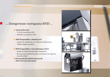 More Applications ... ... Zintegrowane rozwiʇzania RFID ... ■ System kodowania: - 13.56 Hz (czʒstotliwoʯʉ HF) - 868 MHz (czʒstotliwoʯʉ UHF) ■ RFID kompatybilne z drukarkʇ GLP - easyLink do drukowania oraz informacje elektroniczne - Szybka obsuga znaczników ■ RFID kompatybilne z seriʇ etykietujʇca GLM-I - Idealne dla etykiet skrzynek, palet i kontenerów - Rozwiʇzywanie problemów poprzez wyʯwietacz oraz optyczny znacznik etykiety ■ Rozwiʇzanie dla etykietowania paczek GLM-L/CCS Case Code System More Applications ... Wyzwanie ... ɭrodowisko naturalne RFID ... ■ Cechy, które przekonujƾ: W typowych rozwiʇzaniach produkcyjnych, kiedy systemy osiʇgajʇ limity wydajnoʯci, bardzo czʒsto wystʒpujʇ bʒdy w transmisji danych. Konwertery pracujʇ nieregularnie. Tym samym du˃o czasu poʯwiʒca siʒ na korygowanie bʒdów i usterek. Dodatkowo, produkty stajʇ siʒ nieu˃yteczne, kiedy nie mogʇ byʉ wystarczajʇco dokadnie zidentyfikowane przez odbioców - Czytnik RFID jest zintegrowany w etykieciarce Bezpieczeǝstwo ■ Korzyǧci dla uǻytkownika: - Jeden system z penʇ funkcjonalnoʯciʇ poprzez Zwarte dane poniewa˃ kodowanie RFID odbywa siʒ w jednym systemie zastosowanie zweryfikowanych kodów opakowaʤ - Wa˃enie i kontrola - Aplikacja kodów keskowych - Transponder RFID - Poaczenie z ERP/MES Ekonomiczny rachunek korzyǧci Procedury wprowadzenia i usuniʒcia danych mogʇ zostaʉ przyspieszone poprzez proces wielokrotnego odczytu. Wydatki zwiʇzane z zatrudnienie personelu dla procesów odczytu i zarzʇdzania danymi sʇ zredukowane ■ Zysk dla uǻytkownika: - Wysokie bezpieczeʤstwo, prosta obsuga, zwarte i zgodne dane - Bez koniecznoʯci dodatkowego miejsca na system RFID - Korzystanie zarówno z klasycznych systemów etykietujʇcych jak i technologi SmartLabel Elastycznoʯʉ Korzystanie zarówno z klasycznych systemów etykietujʇcych jak i technologi SmartLabel More Applications ... ... Aplikacje Bizerba RFID ... ■ Rejestracja na magazynie: - Poʇczenie zewnʒtrznych stacji odczytu poprzez systemowy interfejs Bizerba BCT Communication Tool - Racjonalizacja zarzʇdzania danymi w procesach intralogistyki i magazynowania More Applications ... ... Aplikacje Bizerba RFID ... ■ BCT jako interfejs wizualizacji danych ... - Bizerba BCT Communication Tool zapewnia komunikacjʒ pomiʒdzy stacjʇ odczytowʇ a systemem MES. - Uniformizacja systemu danych dla wszystkich procesów ... pomaga unikaǀ bNjdów