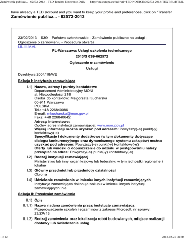 Zamówienie publicz... - 62572-2013 - TED Tenders Electronic Daily http://ted.europa.eu/udl?uri=TED:NOTICE:062572-2013:TEXT:PL:HTML If you have already a TED account and you want to keep your profile and preferences, click on "Transfer existing Zamówienie publicz... - 62572-2013 23/02/2013 S39 Państwa członkowskie - Zamówienie publiczne na usługi Ogłoszenie o zamówieniu - Procedura otwarta I.II.III.IV.VI. PL-Warszawa: Usługi szkolenia technicznego 2013/S 039-062572 Ogłoszenie o zamówieniu Usługi Dyrektywa 2004/18/WE Sekcja I: Instytucja zamawiająca I.1) Nazwa, adresy i punkty kontaktowe Departament Administracyjny MON al. Niepodległości 218 Osoba do kontaktów: Małgorzata Kucharska 00-911 Warszawa POLSKA Tel.: +48 226840086 E-mail: [email protected] Faks: +48 226840642 Adresy internetowe: Ogólny adres instytucji zamawiającej: www.mon.gov.pl Więcej informacji można uzyskać pod adresem: Powyższy(-e) punkt(-y) kontaktowy(-e) Specyfikacje i dokumenty dodatkowe (w tym dokumenty dotyczące dialogu konkurencyjnego oraz dynamicznego systemu zakupów) można uzyskać pod adresem: Powyższy(-e) punkt(-y) kontaktowy(-e) Oferty lub wnioski o dopuszczenie do udziału w postępowaniu należy przesyłać na adres: Powyższy(-e) punkt(-y) kontaktowy(-e) I.2) Rodzaj instytucji zamawiającej Ministerstwo lub inny organ krajowy lub federalny, w tym jednostki regionalne i lokalne I.3) Główny przedmiot lub przedmioty działalności Obrona I.4) Udzielenie zamówienia w imieniu innych instytucji zamawiających Instytucja zamawiająca dokonuje zakupu w imieniu innych instytucji zamawiających: nie Sekcja II: Przedmiot zamówienia II.1) Opis II.1.1) Nazwa nadana zamówieniu przez instytucję zamawiającą: Przeprowadzenie szkoleń i egzaminów z zakresu Microsoft, nr sprawy: 23/ZP/13 II.1.2) Rodzaj zamówienia oraz lokalizacja robót budowlanych, miejsce realizacji dostawy lub świadczenia usług 1 z 12 2013-02-25 08:50 Zamówienie publicz... - 62572-2013 - TED Tenders Electronic Daily 2 z 12 http://ted.europa.eu/udl?uri=TED:NOTICE:062572-2013:TEXT:PL:HTML Usługi Kategoria usług: nr 24: Usługi edukacyjne i szkoleniowe Kod NUTS PL II.1.3) Informacje na temat zamówienia publicznego, umowy ramowej lub dynamicznego systemu zakupów (DSZ) Ogłoszenie dotyczy zamówienia publicznego II.1.4) Informacje na temat umowy ramowej II.1.5) Krótki opis zamówienia lub zakupu Przedmiotem zamówienia jest przeprowadzenie szkoleń i egzaminów z zakresu Microsoft: 1. Microsoft Windows Server 2008 1.1. Configuring, Managing and Maintaining Windows Server 2008 Servers (MS-6419) 1.2. Configuring and Troubleshooting a Windows Server 2008 Network Infrastructure (MS-6421) 1.3. Configuring and Troubleshooting Windows Server 2008 Active Directory Domain Services (MS-6425) 1.4. Configuring and Troubleshooting Identity and Access Solutions with Windows Server 2008 Active Directory (MS-6426) 1.5. Planning and Implementing Windows Server 2008 (MS-6433) 1.6. Configuring and Troubleshooting Internet Information Services in Windows Server 2008 (MS-6427) 1.7. Implementing and Managing Microsoft Server Virtualization (MS-10215) 1.8. Implementing and Managing Microsoft Desktop Virtualization (MS-10324) 1.9. Implementing and Managing Windows Server 2008 Clustering (MS-6423) 1.10.Automating Windows Server 2008 Administration with Windows PowerShell (MS-6434) 1.11. Microsoft Windows PowerShell v2 For Administrators (MS-50414) 1.12.Managing, Maintaining, and Securing Your Networks Through Group Policy (MS-50255) 1.13.Wdrożenie i utrzymanie bezpieczeństwa w Microsoft Windows Server 2008 R2 (MS Security) 1.14. Egzaminy Windows Server 2008 Active Directory, Configuring; Windows Server 2008 Network Infrastructure, Configuring Windows Server 2008, Server Administrator 2. Microsoft Exchange Server 2010 2.1. Designing and Deploying Messaging Solutions with Microsoft Exchange Server 2010 (MS-10233) 2.2. Configuring, Managing and Troubleshooting Microsoft Exchange Server 2010 (MS-10135) 2.3. Egzaminy MS EXCHANGE 2010: Microsoft Exchange Server 2010, Configuring (Exam 70-662) Designing and Deploying Messaging Solutions with Microsoft Exchange Server 2010 (Exam 70-663) 3. Pozostałe szkolenia 3.1. Microsoft Office Project 2007, Managing Projects (MS-5927) 3.2. Designing a Microsoft SharePoint 2010 Infrastructure (MS-10231) 3.3. Configuring and Managing Microsoft SharePoint 2010 (MS-10174) 3.4. Troubleshooting and Supporting Windows 7 in the Enterprise (MS-6293) 3.5. Administering System Center 2012 Configuration Manager (MS-10747) 3.6. Deploying System Center 2012 Configuration Manager (MS-10748) 2013-02-25 08:50 Zamówienie publicz... - 62572-2013 - TED Tenders Electronic Daily 3 z 12 http://ted.europa.eu/udl?uri=TED:NOTICE:062572-2013:TEXT:PL:HTML 3.7. Monitoring and Operating a Private Cloud with System Center 2012 (MS-10750) 3.8 Maintaining a Microsoft SQL Server 2005 Database (MS-2780) 4. Warsztaty 4.1. Warsztaty z zakresu migracji środowiska Active Directory z wersji 2003 do wersji 2008R2 oraz z zakresu migracji środowiska pocztowego Exchange z wersji 2003/2007 do wersji 2010. Miejsce realizacji szkoleń – Warszawa, Kraków Szczegółowy opis przedmiotu umowy zawiera specyfikacja istotnych warunków zamówienia. II.1.6) Wspólny Słownik Zamówień (CPV) 80531200 II.1.7) Informacje na temat Porozumienia w sprawie zamówień rządowych (GPA) Zamówienie jest objęte Porozumieniem w sprawie zamówień rządowych (GPA): tak II.1.8) Części To zamówienie podzielone jest na części: nie II.1.9) Informacje o ofertach wariantowych Dopuszcza się składanie ofert wariantowych: nie II.2) Wielkość lub zakres zamówienia II.2.1) Całkowita wielkość lub zakres: II.2.2) Informacje o opcjach II.2.3) Informacje o wznowieniach II.3) Czas trwania zamówienia lub termin realizacji Sekcja III: Informacje o charakterze prawnym, ekonomicznym, finansowym i technicznym III.1) Warunki dotyczące zamówienia III.1.1) Wymagane wadia i gwaran