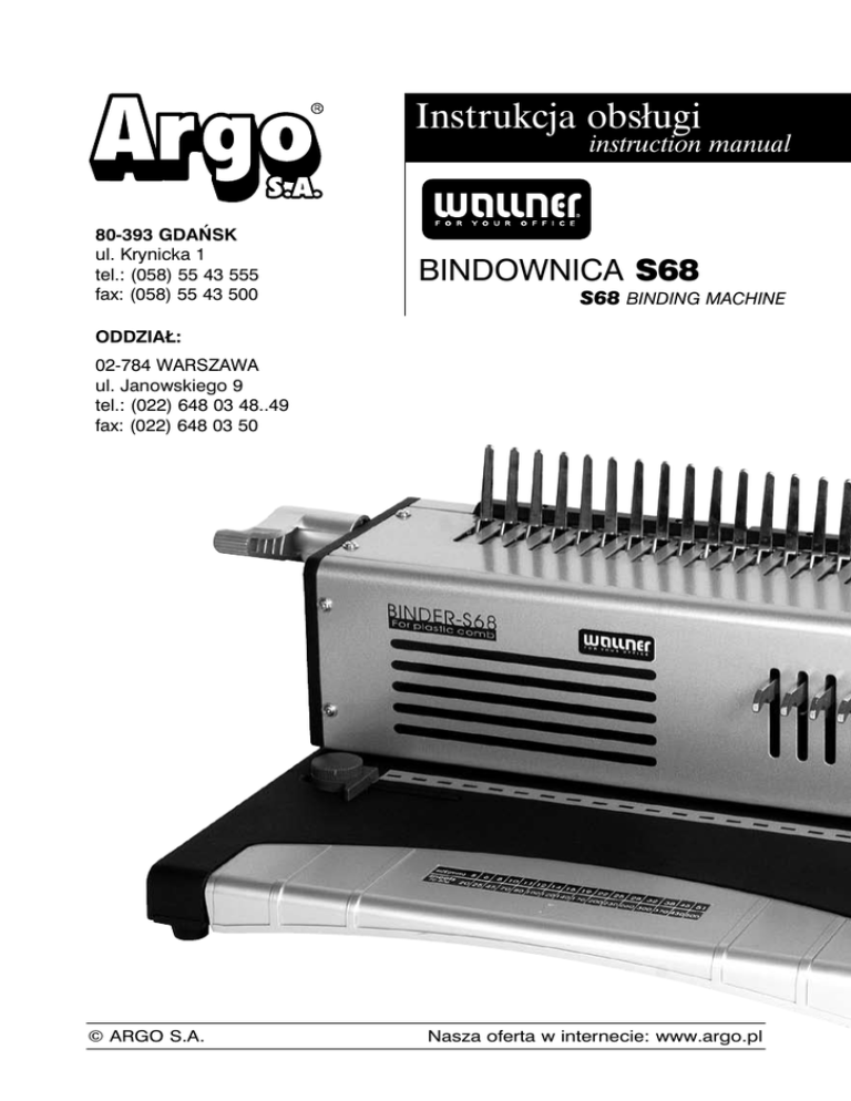 Instrukcja obsługi 80-393 GDAŃSK ul. Krynicka 1 tel.: (058) 55 43 555 fax: (058) 55 43 500 instruction manual Bindownica S68 S68 BINDING MACHINE ODDZIAŁ: 02-784 WARSZAWA ul. Janowskiego 9 tel.: (022) 648 03 48..49 fax: (022) 648 03 50 © ARGO S.A. Nasza oferta w internecie: www.argo.pl BINDOWNICA DO GRZEBIETÓW PLASTIKOWYCH S-68 Postępuj według poniższej instrukcji, zachowaj ją na przyszłość. MONTAŻ 1.Wyjmij urządzenie z pudełka 2.Ustaw bindownicę na blacie biurka, podłoże powinno być pewne i stabilne, by uniknąć zniszczenia urządzenia 3. Zamontuj dźwignię dziurkującą i bindującą przy pomocy śrub DANE TECHNICZNE Model S-68 Format oprawianego dokumentu A4(21 oczek), A4(20 oczek) Maksymalna ilość kartek dziurkowanych jednorazowo 20 (70-80 g/m2) Grubość oprawianych dokumentów 6 - 51 mm Ilość wyłączanych noży dziurkujących 7 Regulacja głębokości marginesu 3 - 8 mm Pojemnik na ścinki Posiada Wymiary urządzenia 497x353x235 mm Waga netto 8,50 kg Waga brutto 9,5 kg Objętość opakowania 0,095 m3 Dziękujemy za zakup naszej bindownicy do grzbietów plastikowych. Jesteśmy pewni, że nasze urządzenie okaże się niezbędnym wsparciem w prezentacji dokumentów. Prosimy o uważne przeczytanie tej instrukcji, by korzystać z możliwości bezawaryjnego użytkowania urządzenia przez wiele lat. ZAWARTOŚĆ OPAKOWANIA Bindownica 1 szt. Dźwignia dziurkująca 1 szt. Dźwignia bindująca 1 szt. Śruby mocujące 2 szt. Instrukcja obsługi 1 szt. CECHY URZĄDZENIA 1. Trwałe urządzenie o niewielkich rozmiarach 2. Łatwy i cichy system dziurkowania 3. Możliwość regulacji szerokości marginesu 4.Łatwość profesjonalnego bindowania ważnych dokumentów firmy, takich jak raporty, protokoły ze spotkań, broszury 5. Mechanizm wyłączania noży dziurkujących © ARGO S.A. Nasza oferta w internecie: www.argo.pl Polski UWAGA! 1.Urządzenie wykonane jest z metalu i plastiku, o wadze do 8,5 kg. Uważaj przy podnoszeniu go. 2.Urządzenie do obsługi ręcznej, prosimy o umieszczenie go na pewnym i stabilnym blacie 3.Usuń wszelkie metalowe elementy z dokumentów (papieru, PVC, PET), by w ten sposób ochronić noże dziurkujące przed zniszczeniem 4. Zachowaj instrukcję obsługi 5.Nie próbuj sam naprawiać urządzenia, zwróć się o pomoc do swojego lokalnego dostawcy 6.Regularnie opróżniaj pojemnik na ścinki, wycieraj urządzenie na sucho przy pomocy miękkiej tkaniny; chroń przed wilgocią BUDOWA URZĄDZENIA 1. Mechanizm bindujący 2.Dźwignia bindująca 3. Ogranicznik papieru 4.Dźwignia dziurkująca 5. Pokrywa 6. Podstawa 7. Regulator ustawiania marginesu 8.Wskaźnik ustawiania marginesu 9. Szczelina dziurkująca 10.Pojemnik na ścinki 11.Wyłączane noże 8 7 4 1 2 5 11 3 9 6 10 © ARGO S.A. Nasza oferta w internecie: www.argo.pl 3 INSTRUKCJA OBSŁUGI 1.Dopasuj głębokość marginesu do grubości dokumentu. (rys. A) 2.Ustaw ogranicznik papieru do formatu papieru, przesuwając go delikatnie w prawo lub lewo. Dokręć śrubę ogranicznika. (rys. B) 3.Włóż lub wyjmij 7 dodatkowych noży dziurkujących w zależności od niezbędnej liczby dziurek, np. aby zbindować dokumenty w formacie B5 (14 dziurek) należy wyjąć 7 noży. (rys. C) 4.Umieść papier płasko na podstawie bindownicy zgodnie z ustawieniem ogranicznika papieru, wsuwając go prostopadle w szczelinę bindującą. (rys. C) 5.Pociągnij dźwignię dziurkującą w dół do oporu tak, aby wszystkie kartki były przedziurkowane. (rys. D) Przed rozpoczęciem właściwego dziurkowania wypróbuj czy wszystkie ustawienia są poprawne. 6.Odciągnij dźwignię dziurkującą do pozycji początkowej i wyjmij przedziurkowany dokument.(rys. E) 7.Wybierz grzbiet odpowiedni do grubości dokumentu (patrz tabela rozmiarów grzbietów). Umieść grzbiet na grzebieniu tak, aby grzbiet otwierał się do góry. (rys. F) 8. Przesuń dźwignię bindującą, otwierając grzbiet. (rys .G) 9.Umieść przedziurkowane kartki w przygotowanym wcześniej grzbiecie (najpierw okładka). Kiedy wszystkie przedziurkowane kartki będą włożone do grzbietu, przesuń dźwignię bindującą do pozycji początkowej w celu zamknięcia grzbietu. (rys. H i I) 10.Wyjmij zbindowany dokument z grzebienia. Gotowe! (rys. J) © ARGO S.A. Nasza oferta w internecie: www.argo.pl Polski Tabela doboru wielkości grzbietu: Rozmiar grzbietu (mm) Max. ilość kartek 6 8 10 12,5 14 25 45 65 16 19 22 25 28,5 32 38 45 51 105 125 145 165 210 240 270 300 350 440 500 Ilość dziurkowanych jednorazowo arkuszy: PAPIER (70-80 g/m2) 20 KARTON (230 g/m2) 6 PVC (0,15 mm) 6 Zalecenia 1.Dziurkowanie maksymalnych ilości kartek dopuszczalnych dla danego modelu nie jest właściwym sposobem użytkowania bindownic. Eksploatacja każdego urządzania z maksymalnymi wartościami obciążeń prowadzi do zmniejszenia jego żywotności. 2.Nie należy wkładać większych ilości kartek niż maksymalna. Może to bowiem spowodować zablokowanie układów mechanicznych, znacznie zmniejszających trwałość, a nawet prowadzić do jego uszkodzenia. 3. Należy regularnie opróżniać pojemnik na ścinki. © ARGO S.A. Nasza oferta w internecie: www.argo.pl 5 UNPACKING AND ASSEMBLY 1.Remove the machine from the box and package; 2. Place the machine on top of a study-working table; make sure use a secure and stable table in order to prevent the machine from falling. 3. Assembly the punching handle and Binding handle firmly with the screws. PLASTIC COMB BINDING FEATURES Binding length Binding Capacity Punching Capacity Margin Depth Adjustment Adjustable Push-pull Pin Wastepaper Tray Overall Dimension Net Weight Gross Weight Volume (carton) A4 (21 rings) A4 (20 rings ) From 6 mm (1/4”) to 51 mm (2”) Up to 20 sheets one time Included (3 mm-8 mm) 7 pins disengaged Include 497x353x235 mm 8.50 kgs 9.50 kgs 0.0950 cbm THANKS: Thanks for purchasing our Plastic Comb Binding Machine; we are confident that ort Binding Machine will be a good assistance for your document presentation. Ple