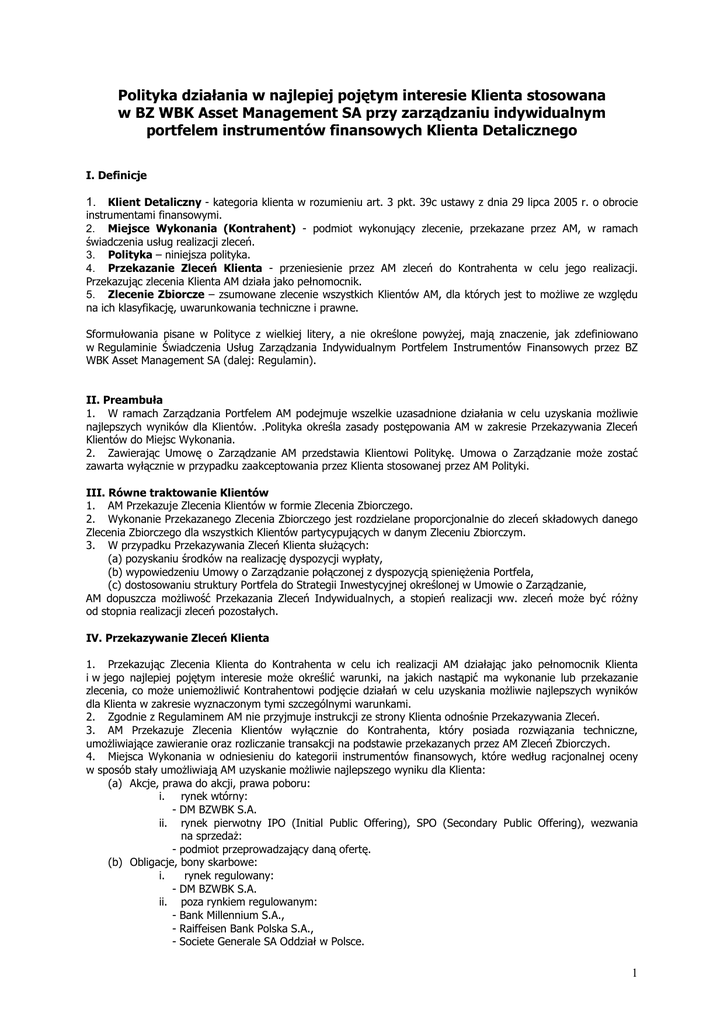 Polityka działania w najlepiej pojętym interesie Klienta stosowana w BZ WBK Asset Management SA przy zarządzaniu indywidualnym portfelem instrumentów finansowych Klienta Detalicznego I. Definicje 1. Klient Detaliczny - kategoria klienta w rozumieniu art. 3 pkt. 39c ustawy z dnia 29 lipca 2005 r. o obrocie instrumentami finansowymi. 2. Miejsce Wykonania (Kontrahent) - podmiot wykonujący zlecenie, przekazane przez AM, w ramach świadczenia usług realizacji zleceń. 3. Polityka – niniejsza polityka. 4. Przekazanie Zleceń Klienta - przeniesienie przez AM zleceń do Kontrahenta w celu jego realizacji. Przekazując zlecenia Klienta AM działa jako pełnomocnik. 5. Zlecenie Zbiorcze – zsumowane zlecenie wszystkich Klientów AM, dla których jest to moŜliwe ze względu na ich klasyfikację, uwarunkowania techniczne i prawne. Sformułowania pisane w Polityce z wielkiej litery, a nie określone powyŜej, mają znaczenie, jak zdefiniowano w Regulaminie Świadczenia Usług Zarządzania Indywidualnym Portfelem Instrumentów Finansowych przez BZ WBK Asset Management SA (dalej: Regulamin). II. Preambuła 1. W ramach Zarządzania Portfelem AM podejmuje wszelkie uzasadnione działania w celu uzyskania moŜliwie najlepszych wyników dla Klientów. .Polityka określa zasady postępowania AM w zakresie Przekazywania Zleceń Klientów do Miejsc Wykonania. 2. Zawierając Umowę o Zarządzanie AM przedstawia Klientowi Politykę. Umowa o Zarządzanie moŜe zostać zawarta wyłącznie w przypadku zaakceptowania przez Klienta stosowanej przez AM Polityki. III. Równe traktowanie Klientów 1. AM Przekazuje Zlecenia Klientów w formie Zlecenia Zbiorczego. 2. Wykonanie Przekazanego Zlecenia Zbiorczego jest rozdzielane proporcjonalnie do zleceń składowych danego Zlecenia Zbiorczego dla wszystkich Klientów partycypujących w danym Zleceniu Zbiorczym. 3. W przypadku Przekazywania Zleceń Klienta słuŜących: (a) pozyskaniu środków na realizację dyspozycji wypłaty, (b) wypowiedzeniu Umowy o Zarządzanie połączonej z dyspozycją spienięŜenia Portfela, (c) dostosowaniu struktury Portfela do Strategii Inwestycyjnej określonej w Umowie o Zarządzanie, AM dopuszcza moŜliwość Przekazania Zleceń Indywidualnych, a stopień realizacji ww. zleceń moŜe być róŜny od stopnia realizacji zleceń pozostałych. IV. Przekazywanie Zleceń Klienta 1. Przekazując Zlecenia Klienta do Kontrahenta w celu ich realizacji AM działając jako pełnomocnik Klienta i w jego najlepiej pojętym interesie moŜe określić warunki, na jakich nastąpić ma wykonanie lub przekazanie zlecenia, co moŜe uniemoŜliwić Kontrahentowi podjęcie działań w celu uzyskania moŜliwie najlepszych wyników dla Klienta w zakresie wyznaczonym tymi szczególnymi warunkami. 2. Zgodnie z Regulaminem AM nie przyjmuje instrukcji ze strony Klienta odnośnie Przekazywania Zleceń. 3. AM Przekazuje Zlecenia Klientów wyłącznie do Kontrahenta, który posiada rozwiązania techniczne, umoŜliwiające zawieranie oraz rozliczanie transakcji na podstawie przekazanych przez AM Zleceń Zbiorczych. 4. Miejsca Wykonania w odniesieniu do kategorii instrumentów finansowych, które według racjonalnej oceny w sposób stały umoŜliwiają AM uzyskanie moŜliwie najlepszego wyniku dla Klienta: (a) Akcje, prawa do akcji, prawa poboru: i. rynek wtórny: - DM BZWBK S.A. ii. rynek pierwotny IPO (Initial Public Offering), SPO (Secondary Public Offering), wezwania na sprzedaŜ: - podmiot przeprowadzający daną ofertę. (b) Obligacje, bony skarbowe: i. rynek regulowany: - DM BZWBK S.A. ii. poza rynkiem regulowanym: - Bank Millennium S.A., - Raiffeisen Bank Polska S.A., - Societe Generale SA Oddział w Polsce. 1 5. AM raz w roku przeprowadza weryfikację jakości i konkurencyjności usług prowadzenia rachunków i wykonywania zleceń świadczonych przez DM BZ WBK S.A. dla Klientów AM w porównaniu do ofert otrzymanych przez AM od innych niŜ DM BZWBK S.A. Kontrahentów. 6. Przy weryfikacji uwzględniane są koszty związane z wykonaniem przez Kontrahenta zlecenia obejmujące wszystkie koszty ponoszone przez Klienta bezpośrednio w związku z wykonaniem zlecenia, w tym opłaty pobierane przez Miejsce Wykonania (prowizja), opłaty z tytułu rozrachunku i rozliczenia transakcji oraz wszelkie inne opłaty związane z wykonaniem zlecenia. 7. AM podejmując działania, o których mowa w II pkt.1,odnośnie kategorii instrumentów finansowych, o których mowa w pkt. 4 (b) ii., uwzględnia następujące czynniki z przypisanymi im wagami względnymi: (a) cenę instrumentu finansowego - 51%, (b) prawdopodobieństwo zawarcia transakcji w wyniku Przekazania Zlecenia Zbiorczego o danej wielkości oraz rozliczenia tej transakcji - 25%, (c) czas zawarcia transakcji - 15%, (d) inne aspekty mające istotny wpływ na wykonanie zlecenia przez Kontrahenta - 9%. 2