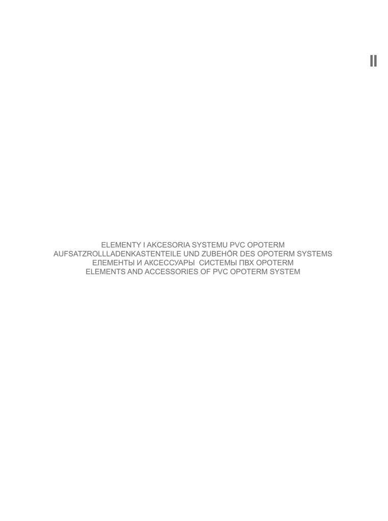 II ELEMENTY I AKCESORIA SYSTEMU PVC OPOTERM AUFSATZROLLLADENKASTENTEILE UND ZUBEHÖR DES OPOTERM SYSTEMS ЕЛЕМЕНТЫ И АКСЕССУАРЫ СИСТЕМЫ ПВХ OPOTERM ELEMENTS AND ACCESSORIES OF PVC OPOTERM SYSTEM Kod x = 03 Kolor: Artykuł nielakierowany Artikel biały Apтикyл szary Article grey 7038 x = 08 ciemnobrązowy dunkelbraun темно- коричневый dark brown 8019 x = 20 czarny schwarz черный black 9005 x = 23 szary antracyt anthrazitgrau серый антрацит anthracite grey 7016 x = 23R szary antracyt anthrazitgrau серый антрацит anthracite grey x = 26R mahoń mahagoni махагон mahogany x = 28R orzech nuss орех walnut x = 30R złoty dąb goldeiche золотой дуб golden oak x = 52R winchester winchester винхэстэр winchester x = 53R dąb ciemny eiche dunkel темный дуб dark oak x = 00 x = 02 Farbe: unlackiert weiss grau Цвет: Opis некрашеный Beschreibung белый Название Description серый Colour: RAL* Pakowanie Verpackung Упаковка Packing mill finish white 9016 x - Kolor / Farbe / Цвет / Colour R - Oklejane folią dekoracyjną / furniert mit einer Dekorfolie / покрытые декоративной пленкой / covered with a decorative foil Kod PB PBM PBW PBWM SP SPM PSB PSG PSRD PSD PSDW PSPD PSA PSAW PSZ + + + + + + + + + + + + + + + + + + + + + + + + + x = 23R + + + + + + x = 26R + + + + + + x = 28R + + + + + + x = 30R + + + + + + x = 52R + + + + + + x = 53R + + + + + + x = 00 x = 02 x = 03 x = 08 x = 20 x = 23 Kod PPD 60/12 PPD 60/17 PPDM 60/12 PPDM 60/17 PPD-P 60/12 PPD-P 60/17 PPDM-P 60/12 PPDM-P 60/17 PPDA 60/12 PPDA-P 60/12 PPDA 60/17 PPDA-P 60/17 + + + + + + + + + + + + + + + + + + + + + + + + + + + + x = 00 x = 02 x = 03 x = 08 x = 20 x = 23 x = 23R + + + + + + + + x = 26R + + + + + + + + x = 28R + + + + + + + + + + + + x = 30R + + + + + + + + + + + + x = 52R + + + + + + + + x = 53R + + + + + + + + Kod SLMI SLMA PP x = 00 NT ZPPD ZPPDM + + x = 02 + + x = 03 + x = 08 x = 20 U/PSD U/PSB/R U/PSB/M EAH SET + + + + + + + + + + + + x = 23 + x = 23R x = 26R + x = 28R + x = 30R + x = 52R + x = 53R + x - Kolor / Farbe / Цвет / Colour R - Oklejane folią dekoracyjną / furniert mit einer Dekorfolie / покрытые декоративной пленкой / covered with a decorative foil Zastrzegamy sobie prawo do zmian technicznych. Stan na dzień 2014.02.28 Technische Änderungen vorbehalten! Stand 2014.02.28 Оставляем за собой право до технических изменений. Состояние на день 2014.02.28 We reserve the right to any technical change. Valid on 2014.02.28 II / 1 Artykuł Artikel Apтикyл Article Opis Beschreibung Название Description Pakowanie Verpackung Упаковка Packing Kolory oklein / Dekorfolie / Цвета оклеечной фольги / Decorative foils colours Grupa 1 – kolory będące w stałej ofercie Gruppe 1 – Standardfarben 1 группа – цвета доступные в постоянном предложении 1st group – colours available in our standard offer Kod Kolor: x = 23R szary antracyt anthrazitgrau Farbe: серый антрацит Цвет: anthracite grey x = 26R mahoń mahagoni махагон mahogany x = 28R orzech nuss орех walnut x = 30R złoty dąb goldeiche золотой дуб golden oak x = 52R winchester winchester винхэстэр winchester x = 53R dąb ciemny eiche dunkel темный дуб dark oak Colour: Grupa 2 – kolory na zamówienie - czas oczekiwania 3 tygodnie Gruppe 2 – Sonderfarben auf Bestellung- Wartezeit beträgt 3 Wochen 2 группа – цвета по заказу – время ожидания 3 недели 2nd group – colours for extra order – lead time around 3 weeks Kod Kolor: Farbe: Цвет: Colour: x = 18RB stalowy niebieski stahlblau стальной голубой steel blue x = 27RB wiśnia kirsche вишня piedmont x = 50RB oregon oregon орэгон oregon pine 4 x = 54RB palisander schwarzbraun палисандр black brown x = 55RB czekoladowy brąz schokobraun шоколадная бронза chocolate brown x = 56RB dąb ST-G eiche ST-G дуб ST-G oak ST-G x = 57RB szary grau серый grey x = 58RB dąb bagienny mooreiche болотный дуб swamp oak x = 59RB dąb naturalny eiche natur натуральный дуб natural oak x = 60RB dąb rustykalny eiche rustikal рустикальный дуб rustic oak Grupa 3 – kolory na zamówienie - czas oczekiwania 4 tygodnie - cena wyższa o 15% Gruppe 3 – Sonderfarben auf Bestellung- Wartezeit beträgt 4 Wochen - Zuschlag 15% 3 группа – цвета по заказу – время ожидания 4 недели – цена выше на 15% 3rd group – colours for extra order – lead time around 4 weeks – prices higher additionally 15% Kod Kolor: Farbe: Цвет: Colour: x = 12RC ciemny czerwony dunkelrot темнный красный dark red x = 13RC zielony grün зеленый green x = 17RC ciemny zielony dunkelgrün темный зеленый dark green x = 31RC jasny szary hellgrau светлый серый light grey x = 61RC siena rosso siena PR сена россо siena PR x = 62RC siena noce siena PN сена ночи siena PN x = 63RC daglezja streifen-douglasie даглезья stripe douglas x = 64RC sosna górska bergkiefer горная сосна mountain pine x = 65RC macore macore макоре macore x = 66RC kremowy biały cremeweiβ кремовый белый cream white Grupa 4 – pozostałe kolory będące w ofercie producentów oklein – czas oczekiwania i cena podana zostanie po otrzymaniu zapytania Gruppe 4 – Andere Dekorfolien - Folienfarben im Angebot - Wartezeit und Preis auf Anfrage 4 группа – остальные цвета из предложения производителей оклеечной фольги – время ожидания и цен