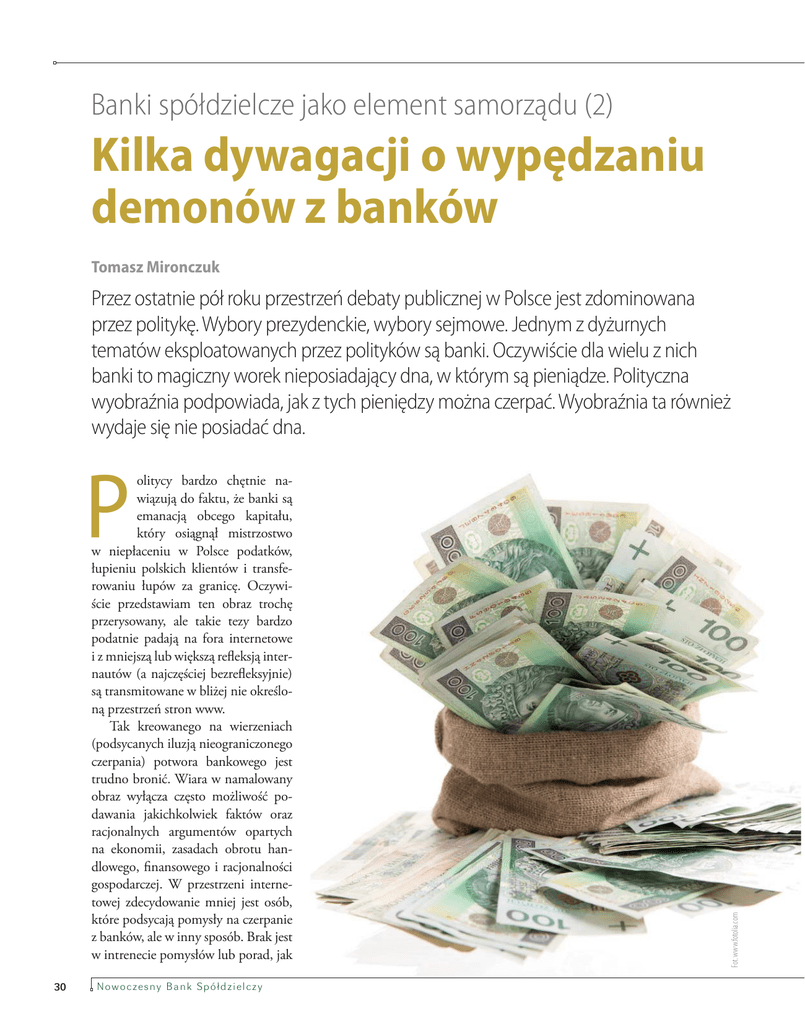 Banki spółdzielcze jako element samorządu (2) Kilka dywagacji o wypędzaniu demonów z banków Tomasz Mironczuk Przez ostatnie pół roku przestrzeń debaty publicznej w Polsce jest zdominowana przez politykę. Wybory prezydenckie, wybory sejmowe. Jednym z dyżurnych tematów eksploatowanych przez polityków są banki. Oczywiście dla wielu z nich banki to magiczny worek nieposiadający dna, w którym są pieniądze. Polityczna wyobraźnia podpowiada, jak z tych pieniędzy można czerpać. Wyobraźnia ta również wydaje się nie posiadać dna. 30 Nowo czesny B a n k Sp ó łd z ie lc z y Fot. www.fotolia.com P olitycy bardzo chętnie nawiązują do faktu, że banki są emanacją obcego kapitału, który osiągnął mistrzostwo w niepłaceniu w Polsce podatków, łupieniu polskich klientów i transferowaniu łupów za granicę. Oczywiście przedstawiam ten obraz trochę przerysowany, ale takie tezy bardzo podatnie padają na fora internetowe i z mniejszą lub większą refleksją internautów (a najczęściej bezrefleksyjnie) są transmitowane w bliżej nie określoną przestrzeń stron www. Tak kreowanego na wierzeniach (podsycanych iluzją nieograniczonego czerpania) potwora bankowego jest trudno bronić. Wiara w namalowany obraz wyłącza często możliwość podawania jakichkolwiek faktów oraz racjonalnych argumentów opartych na ekonomii, zasadach obrotu handlowego, finansowego i racjonalności gospodarczej. W przestrzeni internetowej zdecydowanie mniej jest osób, które podsycają pomysły na czerpanie z banków, ale w inny sposób. Brak jest w intrenecie pomysłów lub porad, jak infrastruktura banków, kompetencje, umiejscowienie społeczne służą i mogą jeszcze lepiej służyć nam, jako społeczności. Jak za pomocą banków, jako instytucji, czerpać z naszych zasobów i pomnażać, a nie grabić! Podejdźmy wobec tego do tego potwora, jakim się jawią banki sterowane przez zagraniczny kapitał, inaczej. Wyobraźmy sobie, że banki w Polsce są zbudowane na krajowym kapitale i ich centra decyzyjne są w Polsce, obok nas. Wyobraźmy sobie, że banki chcą i działają na rzecz polskiej gospodarki, bo są zarządzane przez patriotów, a często również przez patriotów lokalnych! Jak chcielibyśmy wtedy takie instytucje traktować? Jak chcielibyśmy korzystać z ich usług? Jak wyobrażamy ich sposób służenia społeczeństwu i naszej gospodarce? Aby przedstawić moją optykę możliwości korzystania z banków opartych na polskim kapitale, najpierw kilka refleksji o polityce gospodarczej szczebla gminno-powiatowego. Często w urzędach jednym z elementów, który zwracał moją uwagę w gabinetach lokalnych włodarzy była mapa. Czasami administracyjna Polski, jednak znacznie częściej lokalna – obrazująca obszar władania lokalnego urzędnika. Uważam to za bardzo pragmatyczne i słuszne podejście. Trzeba wiedzieć, ile jest miast i wsi na terenie podległym włodarzowi. Warto wiedzieć, jakimi drogami z miejscowości A do B można dojechać. Nie wspomnę o takich elementach, jak ukształtowanie terenu, lasy, rzeki, jeziora itp., itd. Słowem, mapa to rzecz ważna w życiu każdej gminy i powiatu. Od kilku lat jednakże nachodzi mnie inna myśl. Czy lokalni włodarze mają w swoich gabinetach mapę gospodarczą podległego regionu? Gdy zadawałem takie pytanie, budziło ono zaskoczenie, często zdziwienie, czasami refleksję. Przecież taka mapa nie istnieje, nie można jej kupić w żadnym urzędzie geodezyjnym. Poza tym wydawać się może, że każdy wójt przecież wie i ma to we własnej głowie, jak wygląda jego mapa gospodarcza. Wójt może wie… ale czy inni też wiedzą? Czy potrafimy zobrazować na mapie gospodarczej główne punkty? Kluczowe zakłady, które generują przychody gminy, dają zatrudnienie, wzbogacają gminę? Często tak. Przecież wiemy, kto jest głównym biznesmenem, co produkuje, ile osób zatrudnia. Przecież wiemy, jakie urzędy działają na poziomie lokalnym, ile osób zatrudniają. Pierwszy krok zrobiony. A teraz kolejne pytanie, mniej oczywiste. Jakie drogi gospodarcze łączą poszczególne punkty? W kategoriach ekonomii można dla uproszczenia powiedzieć, że drogi to połączenia: kto od kogo otrzymuje pieniądze, kto komu płaci. Nakreślenie tak zdefiniowanych dróg gospodarczych bywa już ćwiczeniem trudniejszym. Po zastanowieniu się okazuje się, że wiedza na ten temat jest już mniej oczywista. Oczywiście nie chodzi o to, aby – kreśląc mapę gospodarczą – prześwietlać kieszenie mieszkańców. Wystarczy oszacowanie kierunków strumieni pieniądza, masy i wartości towarowej, rzędu wielkości. Tak wyznaczone główne drogi gospodarcze zaczynają wypełniać mapę. Powoduje to, że nasza optyka na sprawy gospodarcze, istotne dla lokalnej społeczności, może się zmienić. Prawdopodobnie wielu zależności ekonomicznych – dróg, którymi krążą pieniądze – nie uświadamialiśmy sobie. Wielu nie potrafimy naszkicować, a wieloma po prostu nie ma sensu się zajmować, bo są nieistotne. Być może osoba, która zostanie poproszona o sporządzenie takiej mapy stwierdzi, że przecież to oczywiste. A nawet, jeżeli my z tego zda- Fot. Archiwum prywatne OPINIE Tomasz Mironczuk Manager z ponad 20-letnim doświadczeniem w bankowości. Sprawował funkcje prezesa zarządu Banku Polskiej Spółdzielczości oraz Banku Gospodarstwa Krajowego. Był wiceprezesem zarządu PKO Banku Polskiego. Może pochwalić się szczególnymi osiągnięciami w zakresie gospodarki pieniężnej i w obszarze rynków pieniężnych, instrumentów pochodnych i rynków kapitałowych. Jest absolwentem Central European University w Pradze. waliśmy sobie sprawę, to taka mapa gospodarcza może być pomocna do komunikacji z innymi. Warto, aby na tej mapie oprócz głównych zakładów produkcyjnych, urzędów były sklepy, podmioty usługowe, mieszkańcy w tym emeryci i renciści. I nie chodzi o wyrysowanie powiązań na poziomie pos