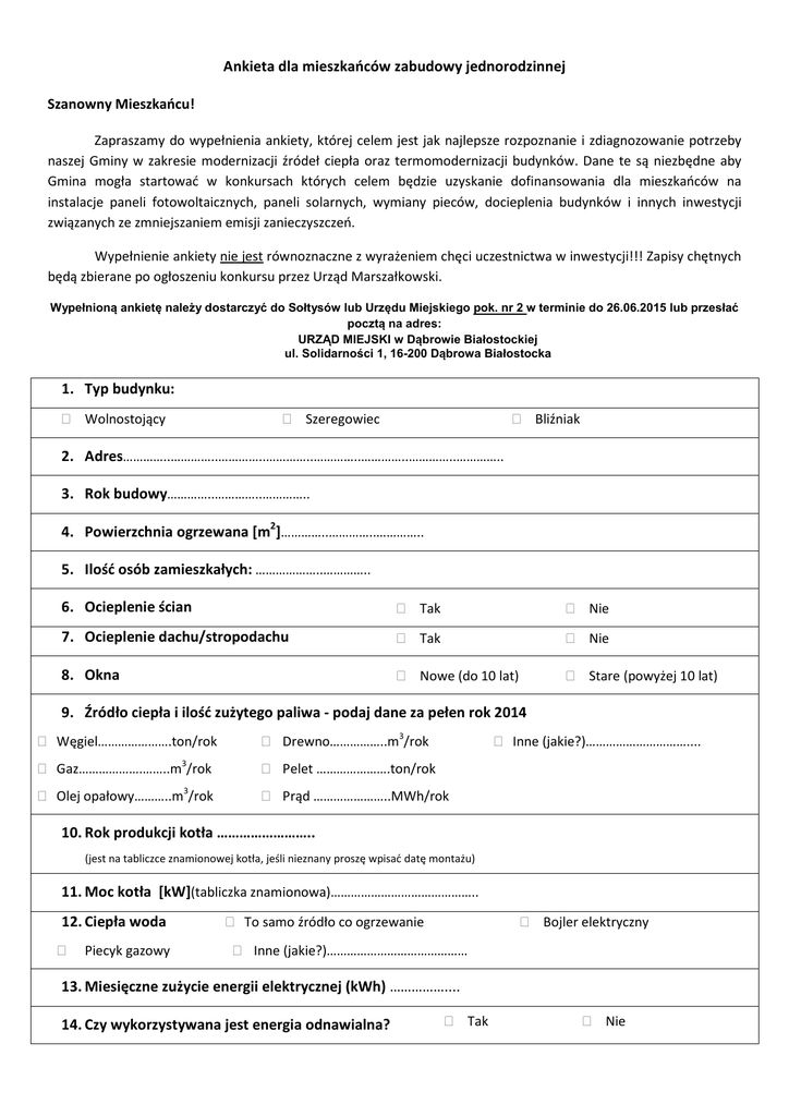 Ankieta dla mieszkańców zabudowy jednorodzinnej Szanowny Mieszkańcu! Zapraszamy do wypełnienia ankiety, której celem jest jak najlepsze rozpoznanie i zdiagnozowanie potrzeby naszej Gminy w zakresie modernizacji źródeł ciepła oraz termomodernizacji budynków. Dane te są niezbędne aby Gmina mogła startować w konkursach których celem będzie uzyskanie dofinansowania dla mieszkańców na instalacje paneli fotowoltaicznych, paneli solarnych, wymiany pieców, docieplenia budynków i innych inwestycji związanych ze zmniejszaniem emisji zanieczyszczeń. Wypełnienie ankiety nie jest równoznaczne z wyrażeniem chęci uczestnictwa w inwestycji!!! Zapisy chętnych będą zbierane po ogłoszeniu konkursu przez Urząd Marszałkowski. Wypełnioną ankietę należy dostarczyć do Sołtysów lub Urzędu Miejskiego pok. nr 2 w terminie do 26.06.2015 lub przesłać pocztą na adres: URZĄD MIEJSKI w Dąbrowie Białostockiej ul. Solidarności 1, 16-200 Dąbrowa Białostocka 1. Typ budynku: Wolnostojący Szeregowiec Bliźniak 2. Adres…………..…………..…………..…………..…………..…………..…………..………….. 3. Rok budowy…………..…………..………….. 4. Powierzchnia ogrzewana [m2]…………..…………..………….. 5. Ilość osób zamieszkałych: ………………..………….. 6. Ocieplenie ścian Tak Nie 7. Ocieplenie dachu/stropodachu Tak Nie 8. Okna Nowe (do 10 lat) Stare (powyżej 10 lat) 9. Źródło ciepła i ilość zużytego paliwa - podaj dane za pełen rok 2014 Węgiel………………….ton/rok Drewno……………..m3/rok Gaz……………….……..m3/rok Pelet ………………….ton/rok Olej opałowy………..m3/rok Prąd …………………..MWh/rok Inne (jakie?)………………………….... 10. Rok produkcji kotła …………………….. (jest na tabliczce znamionowej kotła, jeśli nieznany proszę wpisać datę montażu) 11. Moc kotła [kW](tabliczka znamionowa)…………………………………….. 12. Ciepła woda Piecyk gazowy To samo źródło co ogrzewanie Bojler elektryczny Inne (jakie?)…………………………………… 13. Miesięczne zużycie energii elektrycznej (kWh) …………….... 14. Czy wykorzystywana jest energia odnawialna? Tak Nie 15. Jeśli tak, wskaż typ Ogniwa fotowoltaiczne Kolektory słoneczne Wiatrak przydomowy Pompa ciepła Gruntowy wymiennik ciepła 16. Czy planujesz wymianę źródła ciepła lub inwestycje w odnawialne źródła energii? Tak 17. Jeśli tak, wskaż typ Nie Nie wiem Kocioł gazowy Kocioł olejowy Nowoczesny kocioł węglowy Kolektory słoneczne Wiatrak przydomowy Ogniwa fotowoltaiczne Pompa ciepła Gruntowy wymiennik ciepła 18. Proszę podać datę planowanej inwestycji……………………………………….. 19. Czy planujesz wykonanie ocieplenia budynku mieszkalnego? Tak Nie 20. Jeśli tak, wskaż grubość: ……………..…… Nie wiem i typ: wełna styropian 21. Proszę podać datę planowanej inwestycji ……………………………………….. 22. Czy ogrzewane są budynki gospodarcze? Tak Nie 23. Jeżeli tak, to podaj łączną powierzchnię ogrzewana budynków [m2]…………..…………..………….. 24. Podaj liczbę ogrzewanych budynków gospodarczych: ………………………………. 25. Moc zainstalowanych kotłów w budynkach gospodarczych [kW](tabliczka znamionowa) ……………. 26. Źródło ciepła i ilość zużytego paliwa - podaj dane za pełen rok 2014 Węgiel………………….ton/rok Drewno……………..m3/rok Gaz……………….……..m3/rok Pelet ………………….ton/rok Olej opałowy………..m3/rok Prąd …………………..MWh/rok Inne (jakie?)………………………….... Wszystkie przekazane informacje zostaną wykorzystane do oszacowania wielkości emisji zanieczyszczeń w Gminie Dąbrowa Białostocka (dane statystyczne dotyczące ilości źródeł niskiej emisji) i nie będą udostępniane publicznie.