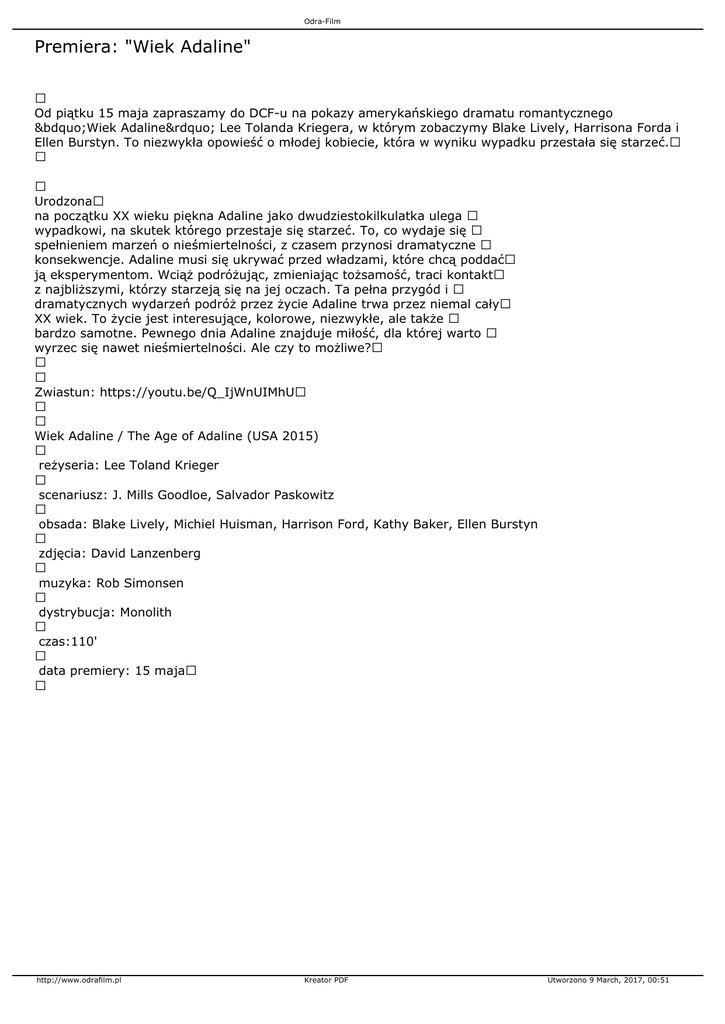 Odra-Film Premiera: "Wiek Adaline" Od piątku 15 maja zapraszamy do DCF-u na pokazy amerykańskiego dramatu romantycznego „Wiek Adaline” Lee Tolanda Kriegera, w którym zobaczymy Blake Lively, Harrisona Forda i Ellen Burstyn. To niezwykła opowieść o młodej kobiecie, która w wyniku wypadku przestała się starzeć. Urodzona na początku XX wieku piękna Adaline jako dwudziestokilkulatka ulega wypadkowi, na skutek którego przestaje się starzeć. To, co wydaje się spełnieniem marzeń o nieśmiertelności, z czasem przynosi dramatyczne konsekwencje. Adaline musi się ukrywać przed władzami, które chcą poddać ją eksperymentom. Wciąż podróżując, zmieniając tożsamość, traci kontakt z najbliższymi, którzy starzeją się na jej oczach. Ta pełna przygód i dramatycznych wydarzeń podróż przez życie Adaline trwa przez niemal cały XX wiek. To życie jest interesujące, kolorowe, niezwykłe, ale także bardzo samotne. Pewnego dnia Adaline znajduje miłość, dla której warto wyrzec się nawet nieśmiertelności. Ale czy to możliwe? Zwiastun: https://youtu.be/Q_IjWnUIMhU Wiek Adaline / The Age of Adaline (USA 2015) reżyseria: Lee Toland Krieger scenariusz: J. Mills Goodloe, Salvador Paskowitz obsada: Blake Lively, Michiel Huisman, Harrison Ford, Kathy Baker, Ellen Burstyn zdjęcia: David Lanzenberg muzyka: Rob Simonsen dystrybucja: Monolith czas:110' data premiery: 15 maja http://www.odrafilm.pl Kreator PDF Utworzono 9 March, 2017, 00:51