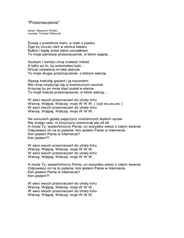 "Przeznaczenia" słowa: Sławomir Wolski, muzyka: Tomasz Steńczyk Duszę z powietrza mam, a ciało z piasku Żyję by rzucać cień w słońca blasku Byłem i będę znów ziemi szczątkiem To moje pierwsze przeznaczenie, w które wątpię… Szukam i bardzo chcę znaleźć miłość A tylko po to, by potomstwo było… Wnuki uświetnią mi lata starcze To moje drugie przeznaczenie, z którym walczę Słyszę melodię gwiazd i ją rozumiem Nie chcę rozpłynąć się w kosmicznym szumie Krzyczę by po mnie ślad został w eterze To moje trzecie przeznaczenie, w które wierzę… W sieci swych przeznaczeń do utraty tchu Wierzę, Wątpię, Walczę: moje W W W. ( czyt.wu,wu,wu ) W sieci swych przeznaczeń do utraty tchu Wierzę, Wątpię, Walczę: moje W W W. Na sznurach gęstej pajęczyny codziennych lepkich spraw Nie znając celu, ni przyczyny szamoczę się od lat A może Ty, wszechmocny Panie, co wszystko wiesz o całym świecie Odpowiesz mi na to pytanie: kim jestem Panie w Internecie, Kim jestem Panie w Internecie? Kim jestem?! W sieci swych przeznaczeń do utraty tchu Wierzę, Wątpię, Walczę: moje W W W. W sieci swych przeznaczeń do utraty tchu Wierzę, Wątpię, Walczę: moje W W W. A może Ty, wszechmocny Panie, co wszystko wiesz o całym świecie Odpowiesz mi na to pytanie: kim jestem Panie w Internecie, Kim jestem Panie w Internecie? Kim jestem?! W sieci swych przeznaczeń do utraty tchu Wierzę, Wątpię, Walczę: moje W W W. W sieci swych przeznaczeń do utraty tchu Wierzę, Wątpię, Walczę: moje W W W.