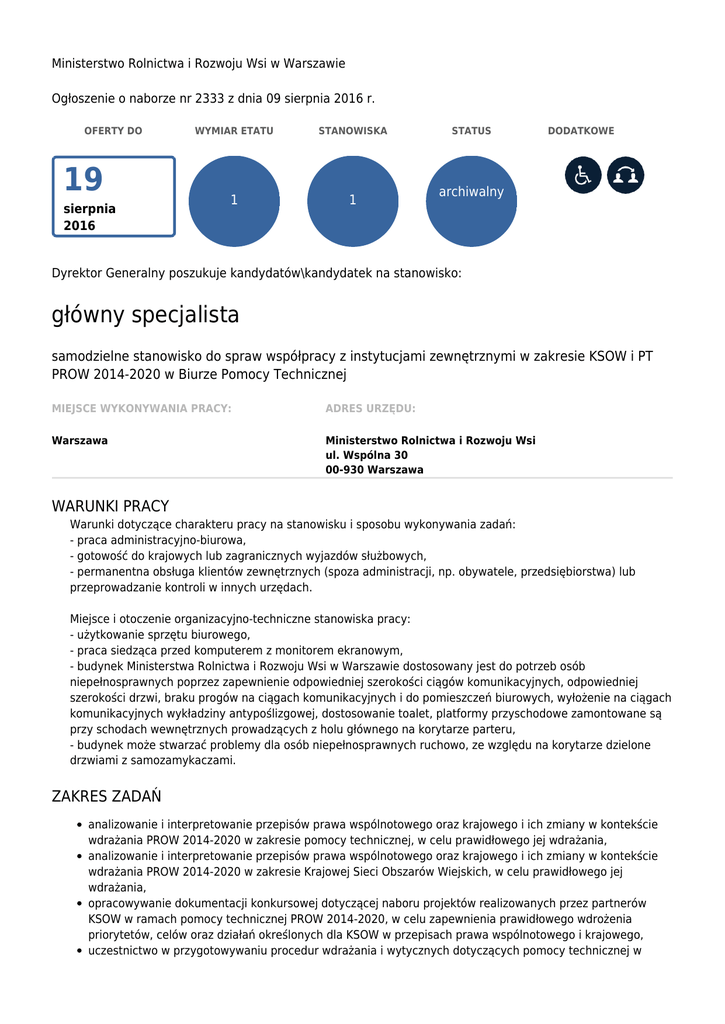 Ministerstwo Rolnictwa i Rozwoju Wsi w Warszawie Ogłoszenie o naborze nr 2333 z dnia 09 sierpnia 2016 r. OFERTY DO 19 sierpnia 2016 WYMIAR ETATU STANOWISKA 1 1 STATUS DODATKOWE archiwalny Dyrektor Generalny poszukuje kandydatów\kandydatek na stanowisko: główny specjalista samodzielne stanowisko do spraw współpracy z instytucjami zewnętrznymi w zakresie KSOW i PT PROW 2014-2020 w Biurze Pomocy Technicznej MIEJSCE WYKONYWANIA PRACY: ADRES URZĘDU: Warszawa Ministerstwo Rolnictwa i Rozwoju Wsi ul. Wspólna 30 00-930 Warszawa WARUNKI PRACY Warunki dotyczące charakteru pracy na stanowisku i sposobu wykonywania zadań: - praca administracyjno-biurowa, - gotowość do krajowych lub zagranicznych wyjazdów służbowych, - permanentna obsługa klientów zewnętrznych (spoza administracji, np. obywatele, przedsiębiorstwa) lub przeprowadzanie kontroli w innych urzędach. Miejsce i otoczenie organizacyjno-techniczne stanowiska pracy: - użytkowanie sprzętu biurowego, - praca siedząca przed komputerem z monitorem ekranowym, - budynek Ministerstwa Rolnictwa i Rozwoju Wsi w Warszawie dostosowany jest do potrzeb osób niepełnosprawnych poprzez zapewnienie odpowiedniej szerokości ciągów komunikacyjnych, odpowiedniej szerokości drzwi, braku progów na ciągach komunikacyjnych i do pomieszczeń biurowych, wyłożenie na ciągach komunikacyjnych wykładziny antypoślizgowej, dostosowanie toalet, platformy przyschodowe zamontowane są przy schodach wewnętrznych prowadzących z holu głównego na korytarze parteru, - budynek może stwarzać problemy dla osób niepełnosprawnych ruchowo, ze względu na korytarze dzielone drzwiami z samozamykaczami. ZAKRES ZADAŃ analizowanie i interpretowanie przepisów prawa wspólnotowego oraz krajowego i ich zmiany w kontekście wdrażania PROW 2014-2020 w zakresie pomocy technicznej, w celu prawidłowego jej wdrażania, analizowanie i interpretowanie przepisów prawa wspólnotowego oraz krajowego i ich zmiany w kontekście wdrażania PROW 2014-2020 w zakresie Krajowej Sieci Obszarów Wiejskich, w celu prawidłowego jej wdrażania, opracowywanie dokumentacji konkursowej dotyczącej naboru projektów realizowanych przez partnerów KSOW w ramach pomocy technicznej PROW 2014-2020, w celu zapewnienia prawidłowego wdrożenia priorytetów, celów oraz działań określonych dla KSOW w przepisach prawa wspólnotowego i krajowego, uczestnictwo w przygotowywaniu procedur wdrażania i wytycznych dotyczących pomocy technicznej w ramach PROW 2014-2020, w szczególności dotyczących sprawozdawczości i monitoringu, w celu prawidłowego jej wdrażania, uczestnictwo w przygotowywaniu oraz aktualizacji monitoringu prowadzonego w ramach pomocy technicznej PROW 2014-2020, w celu zapewnienie rzeczowej i finansowej kontroli stanu realizacji operacji. WYMAGANIA NIEZBĘDNE Wykształcenie: wyższe o kierunku ekonomia, 3-letni staż pracy, znajomość języka angielskiego na poziomie komunikatywnym, znajomość zagadnień związanych z Unią Europejską, znajomość Programu Rozwoju Obszarów Wiejskich na lata 2014-2020 i dokumentów związanych z ich realizacją, znajomość ustawy o finansach publicznych, znajomość ustawy prawo zamówień publicznych, Posiadanie obywatelstwa polskiego Korzystanie z pełni praw publicznych Nieskazanie prawomocnym wyrokiem za umyślne przestępstwo lub umyślne przestępstwo skarbowe WYMAGANIA DODATKOWE roczne doświadczenie w zakresie kontroli projektów współfinansowanych ze środków publicznych, studia podyplomowe z zakresu audytu wewnętrznego, znajomość języka angielskiego na poziomie bardzo dobrym, znajomość zasad procedur finansowo-księgowych, znajomość procedur legislacyjnych (legislacja krajowa). DOKUMENTY I OŚWIADCZENIA NIEZBĘDNE Życiorys/CV i list motywacyjny Kopie dokumentów potwierdzających spełnienie wymagania niezbędnego w zakresie wykształcenia kopie świadectw pracy, zaświadczeń lub innych dokumentów potwierdzających wymagany w ogłoszeniu 3letni staż pracy, Oświadczenie o posiadaniu obywatelstwa polskiego albo kopia dokumentu potwierdzającego posiadanie polskiego obywatelstwa Oświadczenie o wyrażeniu zgody na przetwarzanie danych osobowych do celów naboru Oświadczenie o korzystaniu z pełni praw publicznych Oświadczenie o nieskazaniu prawomocnym wyrokiem za umyślne przestępstwo lub umyślne przestępstwo skarbowe DOKUMENTY I OŚWIADCZENIA DODATKOWE kopia dokumentu potwierdzającego niepełnosprawność - w przypadku kandydatek/kandydatów, zamierzających skorzystać z pierwszeństwa w zatrudnieniu w przypadku, gdy znajdą się w gronie najlepszych kandydatek/kandydatów kopie świadectw pracy, zaświadczeń lub innych dokumentów potwierdzających wymagane w ogłoszeniu roczne doświadczenie w zakresie kontroli projektów współfinansowanych ze środków publicznych, kopia dokumentu potwierdzającego studia podyplomowe z zakresu audytu wewnętrznego. TERMINY I MIEJSCE SKŁADANIA DOKUMENTÓW Dokumenty należy złożyć do: 19 sierpnia 2016 r. Decyduje data: wpływu oferty do urzędu Miejsce składania dokumentów: Ministerstwo Rolnictwo i Rozwoju Wsi Biuro Dyrektora Generalnego ul. Wspólna 30, 00-930 Warszawa lub w MRiRW, pok. 139 (pn.-pt., 8.15-16.15) z dopiskiem: „oferta pracy – Główny Specjalista w PT-zastępstwo”. INNE INFORMACJE: W miesiącu poprzedzającym datę upublicznienia ogłoszenia wskaźnik zatrudnienia osób niepełnosprawnych w urzędzie, w rozumieniu przepisów o rehabilitacji zawodowej i społecznej oraz zatrudnianiu osób niepełnosprawnych, nie wynosi co najmniej 6%. Ogłoszenie o naborze w celu zastępstwa. Do składania dokumentów zachęcamy osoby niepełnosprawne. Wszystkie wymagane oświadczenia należy własnoręcznie podpisać. Ogłoszenie o naborze w celu zastępstwa. Kandydatki/kandydaci zakwalifikowani zostaną powiadomieni o terminie sprawdzianu wiedzy lub umiejętności (który odbędzie się, jeżeli liczba ofert pracy spełniających wymagania forma