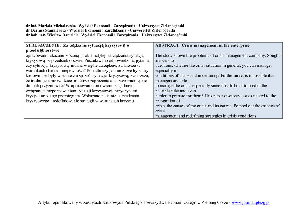 dr inż. Mariola Michałowska- Wydział Ekonomii i Zarządzania - Uniwersytet Zielonogórski dr Dariusz Stankiewicz - Wydział Ekonomii i Zarządzania - Uniwersytet Zielonogórski dr hab. inż. Wiesław Danielak - Wydział Ekonomii i Zarządzania - Uniwersytet Zielonogórski STRESZCZENIE: Zarządzanie sytuacją kryzysową w przedsiębiorstwie opracowaniu ukazano złożoną problematykę zarządzania sytuacją kryzysową w przedsiębiorstwie. Poszukiwano odpowiedzi na pytania: czy sytuacją kryzysową można w ogóle zarządzać, zwłaszcza w warunkach chaosu i niepewności? Ponadto czy jest możliwe by kadry kierownicze były w stanie zarządzać sytuacją kryzysową, zwłaszcza, że trudno jest przewidzieć możliwe zagrożenia a jeszcze trudniej się do nich przygotować? W opracowaniu omówiono zagadnienia związane z rozpoznawaniem sytuacji kryzysowej, przyczynami kryzysu oraz jego przebiegiem. Wskazano na istotę zarządzania kryzysowego i redefiniowanie strategii w warunkach kryzysu. ABSTRACT: Crisis management in the enterprise The study shown the problems of crisis management company. Sought answers to questions: whether the crisis situation in general, you can manage, especially in conditions of chaos and uncertainty? Furthermore, is it possible that managers are able to manage the crisis, especially since it is difficult to predict the possible risks and even harder to prepare for them? This paper discusses issues related to the recognition of crisis, the causes of the crisis and its course. Pointed out the essence of crisis management and redefining strategies in crisis conditions. Artykuł opublikowany w Zeszytach Naukowych Polskiego Towarzystwa Ekonomicznego w Zielonej Górze - www.journal.ptezg.pl