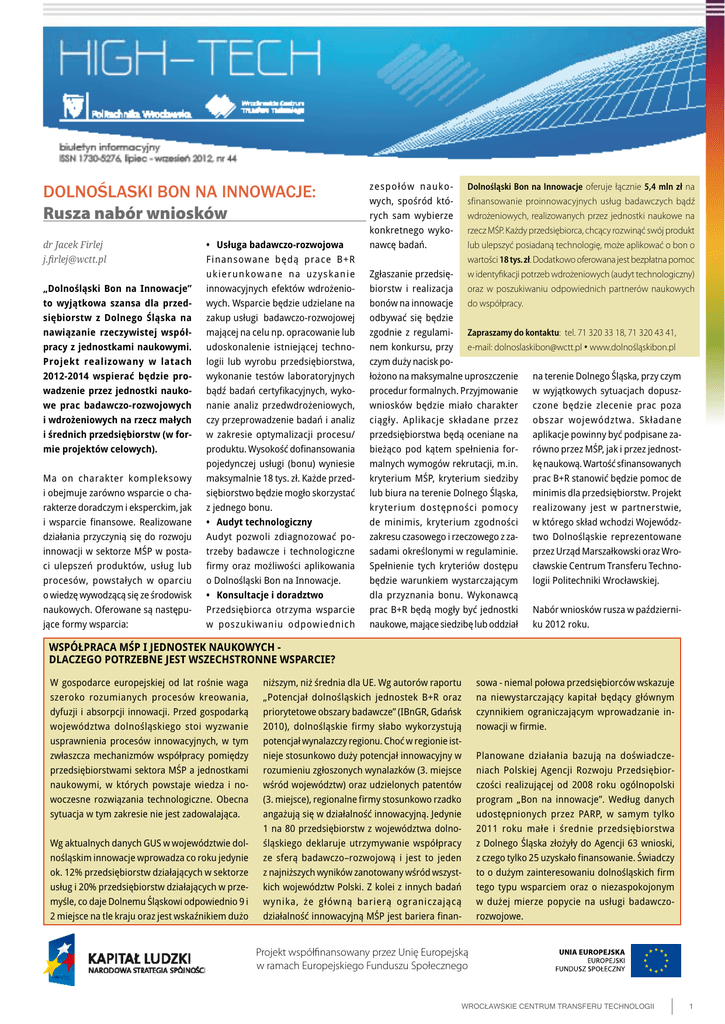 DOLNOŚLASKI BON NA INNOWACJE: Rusza nabór wniosków dr Jacek Firlej [email protected] „Dolnośląski Bon na Innowacje” to wyjątkowa szansa dla przedsiębiorstw z Dolnego Śląska na nawiązanie rzeczywistej współpracy z jednostkami naukowymi. Projekt realizowany w latach 2012-2014 wspierać będzie prowadzenie przez jednostki naukowe prac badawczo-rozwojowych i wdrożeniowych na rzecz małych i średnich przedsiębiorstw (w formie projektów celowych). Ma on charakter kompleksowy i obejmuje zarówno wsparcie o charakterze doradczym i eksperckim, jak i wsparcie finansowe. Realizowane działania przyczynią się do rozwoju innowacji w sektorze MŚP w postaci ulepszeń produktów, usług lub procesów, powstałych w oparciu o wiedzę wywodzącą się ze środowisk naukowych. Oferowane są następujące formy wsparcia: • Usługa badawczo-rozwojowa Finansowane będą prace B+R ukierunkowane na uzyskanie innowacyjnych efektów wdrożeniowych. Wsparcie będzie udzielane na zakup usługi badawczo-rozwojowej mającej na celu np. opracowanie lub udoskonalenie istniejącej technologii lub wyrobu przedsiębiorstwa, wykonanie testów laboratoryjnych bądź badań certyfikacyjnych, wykonanie analiz przedwdrożeniowych, czy przeprowadzenie badań i analiz w zakresie optymalizacji procesu/ produktu. Wysokość dofinansowania pojedynczej usługi (bonu) wyniesie maksymalnie 18 tys. zł. Każde przedsiębiorstwo będzie mogło skorzystać z jednego bonu. • Audyt technologiczny Audyt pozwoli zdiagnozować potrzeby badawcze i technologiczne firmy oraz możliwości aplikowania o Dolnośląski Bon na Innowacje. • Konsultacje i doradztwo Przedsiębiorca otrzyma wsparcie w poszukiwaniu odpowiednich zespołów naukowych, spośród których sam wybierze konkretnego wykonawcę badań. Dolnośląski Bon na Innowacje oferuje łącznie 5,4 mln zł na sfinansowanie proinnowacyjnych usług badawczych bądź wdrożeniowych, realizowanych przez jednostki naukowe na rzecz MŚP. Każdy przedsiębiorca, chcący rozwinąć swój produkt lub ulepszyć posiadaną technologię, może aplikować o bon o wartości 18 tys. zł. Dodatkowo oferowana jest bezpłatna pomoc w identyfikacji potrzeb wdrożeniowych (audyt technologiczny) oraz w poszukiwaniu odpowiednich partnerów naukowych do współpracy. Zgłaszanie przedsiębiorstw i realizacja bonów na innowacje odbywać się będzie zgodnie z regulami- Zapraszamy do kontaktu: tel. 71 320 33 18, 71 320 43 41, nem konkursu, przy e-mail: [email protected] • www.dolnośląskibon.pl czym duży nacisk położono na maksymalne uproszczenie na terenie Dolnego Śląska, przy czym procedur formalnych. Przyjmowanie w wyjątkowych sytuacjach dopuszwniosków będzie miało charakter czone będzie zlecenie prac poza ciągły. Aplikacje składane przez obszar województwa. Składane przedsiębiorstwa będą oceniane na aplikacje powinny być podpisane zabieżąco pod kątem spełnienia for- równo przez MŚP, jak i przez jednostmalnych wymogów rekrutacji, m.in. kę naukową. Wartość sfinansowanych kryterium MŚP, kryterium siedziby prac B+R stanowić będzie pomoc de lub biura na terenie Dolnego Śląska, minimis dla przedsiębiorstw. Projekt kryterium dostępności pomocy realizowany jest w partnerstwie, de minimis, kryterium zgodności w którego skład wchodzi Wojewódzzakresu czasowego i rzeczowego z zatwo Dolnośląskie reprezentowane sadami określonymi w regulaminie. przez Urząd Marszałkowski oraz WroSpełnienie tych kryteriów dostępu cławskie Centrum Transferu Technobędzie warunkiem wystarczającym logii Politechniki Wrocławskiej. dla przyznania bonu. Wykonawcą prac B+R będą mogły być jednostki Nabór wniosków rusza w październinaukowe, mające siedzibę lub oddział ku 2012 roku. WSPÓŁPRACA MŚP I JEDNOSTEK NAUKOWYCH DLACZEGO POTRZEBNE JEST WSZECHSTRONNE WSPARCIE? W gospodarce europejskiej od lat rośnie waga szeroko rozumianych procesów kreowania, dyfuzji i absorpcji innowacji. Przed gospodarką województwa dolnośląskiego stoi wyzwanie usprawnienia procesów innowacyjnych, w tym zwłaszcza mechanizmów współpracy pomiędzy przedsiębiorstwami sektora MŚP a jednostkami naukowymi, w których powstaje wiedza i nowoczesne rozwiązania technologiczne. Obecna sytuacja w tym zakresie nie jest zadowalająca. Wg aktualnych danych GUS w województwie dolnośląskim innowacje wprowadza co roku jedynie ok. 12% przedsiębiorstw działających w sektorze usług i 20% przedsiębiorstw działających w przemyśle, co daje Dolnemu Śląskowi odpowiednio 9 i 2 miejsce na tle kraju oraz jest wskaźnikiem dużo niższym, niż średnia dla UE. Wg autorów raportu „Potencjał dolnośląskich jednostek B+R oraz priorytetowe obszary badawcze” (IBnGR, Gdańsk 2010), dolnośląskie firmy słabo wykorzystują potencjał wynalazczy regionu. Choć w regionie istnieje stosunkowo duży potencjał innowacyjny w rozumieniu zgłoszonych wynalazków (3. miejsce wśród województw) oraz udzielonych patentów (3. miejsce), regionalne firmy stosunkowo rzadko angażują się w działalność innowacyjną. Jedynie 1 na 80 przedsiębiorstw z województwa dolnośląskiego deklaruje utrzymywanie współpracy ze sferą badawczo–rozwojową i jest to jeden z najniższych wyników zanotowany wśród wszystkich województw Polski. Z kolei z innych badań wynika, że główną barierą ograniczającą działalność innowacyjną MŚP jest bariera finan- sowa - niemal połowa przedsiębiorców wskazuje na niewystarczający kapitał będący głównym czynnikiem ograniczającym wprowadzanie innowacji w firmie. Planowane działania bazują na doświadczeniach Polskiej Agencji Rozwoju Przedsiębiorczości realizującej od 2008 roku ogólnopolski program „Bon na innowacje”. Według danych udostępnionych przez PARP, w samym tylko 2011 roku małe i średnie przedsiębiorstwa z Dolnego Śląska złożyły do Agencji 63 wnioski, z czego tylko 25 uzyskało finansowanie. Świadczy to o dużym