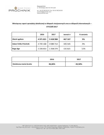 Próchnik S.A. ul. Kilińskiego 228, 93-124 Łódź tel. +48 42 683 66 05, fax +48 42 683 66 06 [email protected] www.prochnik.com Miesięczny raport sprzedaży detalicznej w sklepach stacjonarnych oraz w sklepach internetowych – STYCZEŃ 2017 2016 2017 wzrost o % wzrostu Obrót ogółem 4 971 821 5 438 988 467 167 9% Adam Feliks Próchnik 3 745 168 4 080 713 335 545 9% Rage Age 1 226 653 1 358 274 131 621 11% Detaliczna marża brutto 2016 2017 46,06% 43,50% NIP 728-013-21-71, REGON 004311429, KRS 0000079261, Kapitał Zakładowy: 47 025 389 ZŁ., Sąd Rejonowy dla Łodzi – Śródmieścia w Łodzi, XX Wydział Krajowego Rejestru Sądowego, Rejestr Przedsiębiorców, mBank S.A.: 66 1140 1010 0000 2897 2700 1002