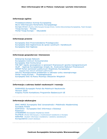 Sieci informacyjne UE w Polsce: instytucje i portale internetowe Informacje ogólne Przedstawicielstwo Komisji Europejskiej Biuro Informacyjne Parlamentu Europejskiego Europe Direct (Punkty Informacyjne Europe Direct, Centra Dokumentacji Europejskiej, Team Europe) Twoja Europa – Porady Portal Twoja Europa – Obywatele -------------------------------------------------------Informacje prawne Europejska Sieć Przeciwdziałania Przestępczości Europejska Sieć Sądownicza do spraw cywilnych i handlowych Europejska Sieć Sądowa -------------------------------------------------------Informacje gospodarcze i biznesowe Enterprise Europe Network Europejskie Centrum Konsumenckie Europejska Sieć Konkurencji FIN-NET Ugody pozasądowe w sprawach finansowych sporów transgranicznych OLAF – Agencja Europejskiego Urzędu ds. Zwalczania Nadużyć Finansowych SIMAP Portal zamówień publicznych Wspólnoty Europejskiej (Krajowe bazy danych zamówień publicznych) SOLVIT Rozwiązywanie problemów w zakresie rynku wewnętrznego Portal Twoja Europa – Przedsiębiorstwa Europejska Sieć na Rzecz Rozwoju Obszarów Wiejskich -------------------------------------------------------Informacje z zakresu badań naukowych i rozwoju EURAXESS Europejski Portal dla Mobilnych Naukowców Horizon 2020 Krajowy Punkt Kontaktowy Programów Badawczych UE -------------------------------------------------------Informacje edukacyjne ENIC-NARIC Europejska Sieć Uznawalności i Mobilności Akademickiej Eurodesk Polska EURYDICE - Europejska Sieć Informacji o Edukacji Erasmus+ eTWINNING (Europejska Współpraca Szkół) PLOTEUS (Portal informacyjny o możliwościach kształcenia w Europie) ReferNet (System informacji o kształceniu i szkoleniu zawodowym) Euroguidance (resort edukacji) -------------------------------------------------------- Centrum Europejskie Uniwersytetu Warszawskiego 1 Sieci informacyjne UE w Polsce: instytucje i portale internetowe Informacje o ochronie środowiska Europejska Sieć Ekologiczna Natura 2000 Green Spider Network -------------------------------------------------------Informacje kulturalne Kreatywna Europa Program Kontaktowy Europa dla Obywateli -------------------------------------------------------Informacje o zatrudnieniu, szkoleniach zawodowych, polityce społecznej EURES Europejski Portal Mobilności Zawodowej Euroguidance (resort pracy) Europejska Sieć Całożyciowego Poradnictwa Zawodowego Europass Europejska Sieć Migracyjna aktualizacja: październik 2016 Centrum Europejskie Uniwersytetu Warszawskiego 2
