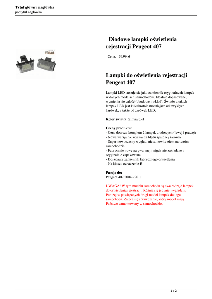 Tytuł główny nagłówka podtytuł nagłówka Diodowe lampki oświetlenia rejestracji Peugeot 407 Cena: 79.99 zł Lampki do oświetlenia rejestracji Peugeot 407 Lampki LED stosuje się jako zamiennik oryginalnych lampek w danych modelach samochodów. Idealnie dopasowane, wymienia się całość (obudowę i wkład). Światło z takich lampek LED jest kilkukrotnie mocniejsze od zwykłych żarówek, a także od żarówek LED. Kolor światła: Zimna biel Cechy produktu: - Cena dotyczy kompletu 2 lampek diodowych (lewej i prawej) - Nowa wersja nie wyświetla błędu spalonej żarówki - Super-nowoczesny wygląd, niesamowity efekt na twoim samochodzie - Fabrycznie nowe na gwarancji, nigdy nie zakładane i oryginalnie zapakowane - Doskonały zamiennik fabrycznego oświetlenia - Na kloszu oznaczenie E Pasują do: Peugeot 407 2004 - 2011 UWAGA! W tym modelu samochodu są dwa rodzaje lampek do oświetlenia rejestracji. Różnią się jedynie wyglądem. Poniżej w powiązanych drugi model lampek do tego samochodu. Zaleca się sprawdzenie, który model mają Państwo zamontowany w samochodzie. 1/2 Tytuł główny nagłówka podtytuł nagłówka 2/2 Powered by TCPDF (www.tcpdf.org)