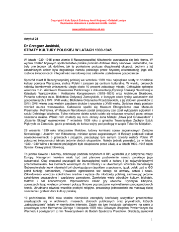 Copyright © Koło Byłych Żołnierzy Armii Krajowej - Oddział Londyn Kopiowanie dozwolone z podaniem źródła i autora www.polishresistance-ak.org Artykuł 28 Dr Grzegorz Jasiński, STRATY KULTURY POLSKIEJ W LATACH 1939-1945 W latach 1939–1945 przez ziemie II Rzeczypospolitej kilkukrotnie przetaczała się linia frontu. W wyniku działań bojowych społeczeństwo polskie poniosło dotkliwe straty osobowe i materialne, nie były one jednak tak dotkliwe, jak te poniesione podczas długotrwałej okupacji. Jednym z jej zasadniczych celów była degradacja narodu polskiego przez fizyczną eksterminację jego elit, rozbicie świadomości i integralności narodowej oraz całkowite uzależnienie gospodarcze. Spośród miast II Rzeczypospolitej polskiej we wrześniu 1939 roku największe straty w dziedzinie kultury poniosła Warszawa, stolica Polski i zarazem jej centrum kulturalne. W wyniku celowych nalotów bombowych zniszczeniu uległo około 10 procent zabudowy miasta. Całkowicie spłonęło wówczas m.in. Archiwum Oświecenia Publicznego z dokumentacją Dyrekcji Edukacji Narodowej w Księstwie Warszawskim i Królestwie Kongresowym (1815–1831) oraz Archiwum Skarbowe. Ponadto spłonęła m.in. Biblioteka Ordynacji Zamoyskich, z liczącym około tysiąc woluminów akt gospodarczych z XVI i XVII wieku; Biblioteka Ordynacka Przeździeckich, z jej zbiorem poloników z XVII i XVIII wieku oraz wielkim zasobem druków i rysunków z XVIII wieku. Dotkliwe straty poniosły również muzea warszawskie. Całkowicie spaliło się Muzeum Etnograficzne oraz Muzeum Przemysłu i Rolnictwa. W Muzeum Narodowym został zniszczony zaś dział wykopalisk egipskich i sztuki Dalekiego Wschodu. Tylko nieliczne dzieła sztuki udało się wówczas wywieźć poza celowo niszczone miasto. Wśród nich znalazły się m.in. obrazy Jana Matejki „Bitwa pod Grunwaldem” i „Kazanie Skargi” ewakuowane 7 września 1939 roku z gmachu Towarzystwa Zachęty Sztuk Pięknych do Zamościa, gdzie przeleżały do końca wojny pod podłogą w szopie Taborów Miejskich. 29 września 1939 roku Wiaczesław Mołotow, ludowy komisarz spraw zagranicznych Związku Sowieckiego i Joachim von Ribbentrop, minister spraw zagranicznych III Rzeszy podpisali traktat sowiecko-niemiecki o granicach i przyjaźni, pieczętując tym samym czwarty rozbiór Polski. W potocznej świadomości istniało jedynie dwóch okupantów. Należy jednak pamiętać, że w latach 1939–1940 Wilno z terenami przyległymi było okupowane przez Litwę, a w latach 1939–1945 rejon Spisza i Orawy przez Słowację. To jednak Sowieci i Niemcy, dokonując podziału terytorium II RP, wykreślili ją z politycznej mapy Europy. Następnym krokiem miało być zaś planowe pozbawienie narodu polskiego jego tożsamości. Obaj okupanci przystąpili do bezwzględnej walki z kulturą i jej najwybitniejszymi przedstawicielami. Na ziemiach wcielonych do III Rzeszy i w utworzonym wówczas Generalnym Gubernatorstwie język niemiecki był obowiązującym językiem urzędowym, język polski zaś w GG pełnił funkcję pomocniczą. Poważnie ograniczono też dostęp do oświaty, sztuki i nauki. Zlikwidowano wówczas szkolnictwo średnie i wyższe dla młodzieży polskiej, zachowując jedynie szkolnictwo powszechne i częściowo zawodowe. Zamknięto wiele ośrodków kultury, bibliotek, teatrów i sal koncertowych. Wprowadzono zakaz gry utworów Fryderyka Chopina, upowszechniając występy cyrkowe i pokazy filmowe poprzedzane wyświetlaniem propagandowych kronik. Utrudniano również wszelkie praktyki religijne, prowadząc jednocześnie na masową skalę niszczenie i grabież dóbr kultury polskiej. 19 października 1939 roku władze niemieckie zarządziły konfiskatę wszystkich przedmiotów znajdujących się w archiwach, muzeach, zbiorach publicznych oraz prywatnych, których „zabezpieczenie” leżało w niemieckim interesie. Zajęły się tym instytucje państwowe na czele z powołanym przez Hermanna Göringa 1 listopada 1939 roku Głównym Urzędem Powierniczym dla Wschodu i powiązanym z nim Towarzystwem do Badań Spuścizny Przodków. Grabieżą zajmował 1 się także Urząd Generalnego Powiernika dla Zabezpieczenia Niemieckich Dóbr Kultury we Wschodnich Ziemiach Przyłączonych oraz specjalni pełnomocnicy m.in. dr Kaj Mühlmann oraz Hans Posse, specjalny wysłannik Hitlera, „z prawem pierwszeństwa w wyborze najcenniejszych dzieł sztuki”. Zarządzeniem Arthura Greisera, niemieckiego namiestnika w Kraju Warty z 13 grudnia 1939 roku zostały skonfiskowane zbiory archiwalne, muzealne i biblioteczne, w tym m.in. muzeum etnograficznego w Poznaniu, muzeów w Głuchowie i Rogalinie oraz zamku w Kórniku, a następnie wywiezione do III Rzeszy. Skarby kultury polskiej rabowane na terenie Generalnego Gubernatorstwa gromadzono w piwnicach Biblioteki Uniwersytetu Jagiellońskiego w Krakowie. Wśród zebranych tam do połowy 1940 roku dzieł znalazło się 521 przedmiotów o tzw. wartości międzynarodowej. Wśród nich były obrazy z Muzeum Czartoryskich w Krakowie (w tym: Rafaela Santi „Portret młodzieńca”, Leonarda da Vinci „Dama z gronostajem”, Rembrandta „Pejzaż z miłosiernym Samarytaninem”), 25 obrazów Bernardo Bellotta zwanego Canalettem oraz 55 przedmiotów ze Skarbca Katedry Wawelskiej. Po zajęciu kresów wschodnich również sowiecka administracja cywilna i wojskowa przystąpiła do niszczenia wszelkich przejawów polskości. 29 listopada zmuszono do przyjęcia obywatelstwa sowieckiego wszystkie osoby, które po 2 listopada 1939 roku znalazły się na terenach inkorporowanych przez Związek Sowiecki. Zlikwidowano polską administrację, a liczne świątynie wszystkich wyznań zamknięto i przekształcono w magazyny, składy, „muzea ateizmu” itp. Język polski utracił rangę języka urzędowego. Zlikwidowano liczne muzea i galerie. Powierzchnia wystawiennicza zajmowana przez zbiory kultury polskiej zmniejszyła się w stosunku do stanu z 1939 ro
