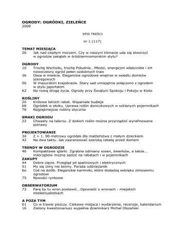 OGRODY: OGRÓDKI, ZIELEŃCE 2009 SPIS TREŚCI nr 1 (117) TEMAT MIESIĄCA 26 Jak nad ciepłym morzem. Czy w naszym klimacie uda się stworzyć w ogrodzie zakątek w śródziemnomorskim stylu? OGRODY 10 Trochę Wschodu, trochę Południa...Młodzi, energiczni właściciele i ich nowoczesny ogród pełen ozdobnych traw 36 Oaza w mieście. Eleganckie ogrodowe wnętrze w osiedlu domków szeregowych 56 W mazurskim krajobrazie. Stary sad umiejętnie połączono z ogrodem w stylu japońskim 62 Na nową drogę Ŝycia. Ogrody przy Świątyni Spokoju i Pokoju w Kioto ROŚLINY 20 Królowe letnich rabat. Wspaniałe budleje 68 Ogródek w słoiku. Uprawa roślin doniczkowych w szklanych pojemnikach 76 Najpiękniejsze rośliny stycznia SMAKI OGRODU 22 Chwasty na talerzu. Z dzikich roślin moŜna przyrządzić wyrafinowane potrawy PROJEKTOWANIE 34 2 + 1. 90-metrowy ogródek dla małŜeństwa z małym dzieckiem 42 Na dwa takty. Jak zaaranŜować szeroką rabatę przed domem TRENDY W OGRODZIE 46 Kompaktowe iglarki. Zgrabne odmiany sosen, świerków, a takŜe... miłorzębów moŜna sadzić na rabatach i w pojemnikach ZAKUPY 44 Dobre cięcie. Przegląd pił spalinowych i elektrycznych 51 My się zimy nie boimy. Parada odśnieŜarek 6o Coś na dziób. Eleganckie karmniki, które dodadzą wdzięku zimowemu ogrodowi 75 Nowości rynkowe OBSERWATORIUM 72 Parę by tu wron postawić...Opowieść o wronach - miejskich intelektualistkach A POZA TYM 61 Co w trawie piszczy. Ciekawe miejsca i wydarzenia, recenzje, kalendarium 16 Zielony kwestionariusz wypełnia dziennikarz Michał Olszański 52 78 82 Eksperci radzą Czytelnikom. Dobre miejsce na skalniak. Bielenie pni drzew. Blednące liście oleandra. Cięcie wierzby 'Hakuro-Nishiki'. UciąŜliwy chrzan. Uprawa boŜodrzewu gruczołkowatego. Kalendarz ogrodnika na styczeń Felieton "Prosto z ogrodu" nr 2 (118) TEMAT MIESIĄCA 26 Feng shui — akupunktura ogrodu. StaroŜytną wiedzę Chińczyków o kształtowaniu przestrzeni moŜna przenieść do współczesnych zielonych zakątków OGRODY 10 Matematycy wśród róŜ. Ukwiecony ogród pod Warszawą 36 Rendez-vous z ogrodem. O tym, jak informatyczka pokochała rośliny 42 Za kurtyną. Ogród w stylu angielskich parków krajobrazowych 54 Palmy w cieniu dębów. Źródliska w Łodzi - najpiękniejszy polski park A.D. 2007 76 Historia Hoserów. Losy trzech pokoleń słynnych warszawskich ogrodników ROŚLINY 18 Swojskie sosny. Strzeliste drzewa i zgrabne krzewy o igłach nie tylko zielonych 48 Kwiaty z baśni. W karnawałowych bukietach królują subtelne kwiaty, pastelowe barwy i wyrafinowane dodatki 62 Kwitnący luty. O ranniku zimowym, śnieŜyczce Elwesa i ciekawych drzewach SMAKI OGRODU 22 By Ŝądz moc móc wzmóc. Roślinne afrodyzjaki z polskich grządek PROJEKTOWANIE 34 Na wąskiej skarpie. Tarasowy ogród znakomicie wpisany w otaczający krajobraz 40 Jak tu ładnie przed domem! Pomagamy Czytelniczce w zaaranŜowaniu przedogródka TRENDY W OGRODZIE 68 śelazne drewno. Drewniane tarasy, mostki, ścieŜki i schody pasują do ogrodowych wnętrz w róŜnych stylach. A projektanci proponują łączenie drewna z róŜnymi materiałami OBSERWATORIUM 64 Ogrodowa krzyŜówka. Urodziwa i niepłochliwa kaczka, prawdziwa miejska rezydentka A POZA TYM 6 Co w trawie piszczy. Ciekawe miejsca i wydarzenia, nowości rynkowe, kalendarium 16 Zielony kwestionariusz wypełnia architekt Czesław Bielecki 50 Eksperci radzą Czytelnikom. Czy krzewy ozdobne wymagają cięcia? Jak wyleczyć rozmaryn? Na co choruje sosna górska? Jak pobudzić falenopsis do kwitnienia? Czy moŜna uprawiać w Polsce magnolię parasolowatą? Jak uratować zdeformowane jałowce? 60 Arsenał bonsaisty. Zestaw przydatnych narzędzi 67 Poczta do redakcji 74 Kalendarz ogrodnika na luty 82 Felieton "Prosto z ogrodu" nr 3 (119) TEMAT MIESIĄCA 28 Budować ogród światłem. Nowoczesne technologie oświetleniowe są energooszczędne i bezpieczne. Pomogą podkreślić szczególny nastrój ogrodu OGRODY 10 Pośród łąk. Z wizytą w podwarszawskiej Kobyłce u laureata konkursu "Najpiękniejszy ogród naszych Czytelników" 40 Z ojca na syna. Formalny ogród pokazowy przy szkółce pana Karola Piątkowskiego, reprezentującego trzecie pokolenie wielkopolskich ogrodników 48 Ogród globtroterów. Tutaj harmonijnie współistnieją swojskie gatunki i rośliny przywiezione z dalekich podróŜy 54 Rektorzy u króla. W miejscu zabytkowego terenu Uniwersytetu Warszawskiego w XVII w. rozciągały się królewskie ogrody 80 Zajrzeć do nieba. Co roku holenderskie miasteczko Vlodorp przyjmuje gości z całego świata na Festiwalu Wiedzy Wedyjskiej ROŚLINY 18 Wiśnie do podziwiana. Cudownie kwitnące wiśnie ozdobne 72 Wiosna w kolorze wrzośców. Przegląd najpopularniejszych odmian, wskazówki pielęgnacyjne 84 Najpiękniejsze rośliny marca SMAKI OGRODU 24 Cytryniec w pięciu smakach. Oryginalne pnącze o wielu walorach zdrowotnych PROJEKTOWANIE 38 Cztery piętra nad ziemią. Elegancki ogród na duŜym tarasie 46 Miejska klasyka. Wąski, cienisty przedogródek przy krakowskiej kamienicy TRENDY W OGRODZIE 64 Zieleń na wysokości. Same zalety zielonych dachów OBSERWATORIUM 76 Srebrne głosy. Dr Andrzej Kruszewicz opowiada o skowronkach A POZA TYM 6 Co w trawie piszczy. Ciekawe miejsca i wydarzenia, nowości rynkowe, kalendarium 16 Zielony kwestionariusz wypełnia pisarka Krystyna Kofta 52 Cięcie z zacięciem. Przegląd nowoczesnych sekatorów 60 Eksperci radzą Czytelnikom. Wszystko o nawoŜeniu mineralnym. Uprawa śniegowca wirginijskiego. Czy ogród moŜe pachnieć igliwiem. Choroba juki. Wymagania szczawika trójkątnego. Jak stworzyć niebanalne kompozycje w donicach. 70 Poczta do redakcji 86 Kalendarz ogrodnika na marzec 90 Felieton "Prosto z ogrodu" nr 4 (120) TEMAT MIESIĄCA 26 Najpiękniej kwitnące. Drzewa, krzewy, pnącza, byliny i rośliny jednoroczne o najpiękniejszych kwiatach OGRODY 10 Nowa legenda Wuppertalu. Nowoczesny ogród doskonale wpisany w otaczający p