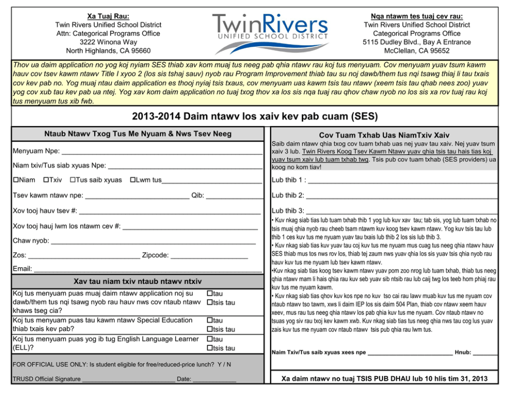 Xa Tuaj Rau: Twin Rivers Unified School District Attn: Categorical Programs Office 3222 Winona Way North Highlands, CA 95660 Nqa ntawm tes tuaj cev rau: Twin Rivers Unified School District Categorical Programs Office 5115 Dudley Blvd., Bay A Entrance McClellan, CA 95652 Thov ua daim application no yog koj nyiam SES thiab xav kom muaj tus neeg pab qhia ntawv rau koj tus menyuam. Cov menyuam yuav tsum kawm hauv cov tsev kawm ntawv Title I xyoo 2 (los sis tshaj sauv) nyob rau Program Improvement thiab tau su noj dawb/them tus nqi tsawg thiaj li tau txais cov kev pab no. Yog muaj ntau daim application es thooj nyiaj tsis txaus, cov menyuam uas kawm tsis tau ntawv (xeem tsis tau qhab nees zoo) yuav yog cov xub tau kev pab ua ntej. Yog xav kom daim application no tuaj txog thov xa los sis nqa tuaj rau qhov chaw nyob no los sis xa rov tuaj rau koj tus menyuam tus xib fwb. 2013-2014 Daim ntawv los xaiv kev pab cuam (SES) Ntaub Ntawv Txog Tus Me Nyuam & Nws Tsev Neeg Cov Tuam Txhab Uas NiamTxiv Xaiv Niam txiv/Tus siab xyuas Npe: ________________________________________ Saib daim ntawv qhia txog cov tuam txhab uas nej yuav tau xaiv. Nej yuav tsum xaiv 3 lub. Twin Rivers Koog Tsev Kawm Ntawv yuav qhia tsis tau hais tias koj yuav tsum xaiv lub tuam txhab twg. Tsis pub cov tuam txhab (SES providers) ua koog no kom tiav! oNiam oLwm tus__________________________ Lub thib 1 : __________________________________________________ Tsev kawm ntawv npe: ___________________________ Qib: _______________ Lub thib 2: __________________________________________________ Xov tooj hauv tsev #: _______________________________________________ Lub thib 3: __________________________________________________ • Kuv nkag siab tias lub tuam txhab thib 1 yog lub kuv xav tau; tab sis, yog lub tuam txhab no tsis muaj qhia nyob rau cheeb tsam ntawm kuv koog tsev kawm ntawv. Yog kuv tsis tau lub thib 1 ces kuv tus me nyuam yuav tau txais lub thib 2 los sis lub thib 3. • Kuv nkag siab tias kuv yuav tau coj kuv tus me nyuam mus cuag tus neeg qhia ntawv hauv SES thiab mus tos nws rov los, thiab tej zaum nws yuav qhia los sis yuav tsis qhia nyob rau hauv kuv tus me nyuam lub tsev kawm ntawv. •Kuv nkag siab tias koog tsev kawm ntawv yuav pom zoo nrog lub tuam txhab, thiab tus neeg qhia ntawv mam li hais qhia rau kuv seb yuav sib ntsib rau lub caij twg los teeb hom phiaj rau kuv tus me nyuam kawm. • Kuv nkag siab tias qhov kuv kos npe no kuv tso cai rau lawv muab kuv tus me nyuam cov ntaub ntawv tso tawm, xws li daim IEP los sis daim 504 Plan, thiab cov ntawv xeem hauv xeev, mus rau tus neeg qhia ntawv los pab qhia kuv tus me nyuam. Cov ntaub ntawv no tsuas yog siv rau txoj kev kawm xwb. Kuv nkag siab tias tus neeg qhia nws tau cog lus yuav zais kuv tus me nyuam cov ntaub ntawv tsis pub qhia rau lwm tus. Menyuam Npe: ____________________________________________________ oTxiv Tus saib xyuas Xov tooj hauj lwm los ntawm cev #: ___________________________________ Chaw nyob: _____________________________________________________ Zos: _____________________________ Zipcode: ____________________ Email: ___________________________________________________________ Xav tau niam txiv ntaub ntawv ntxiv Koj tus menyuam puas muaj daim ntawv application noj su dawb/them tus nqi tsawg nyob rau hauv nws cov ntaub ntawv khaws tseg cia? Koj tus menyuam puas tau kawm ntawv Special Education thiab txais kev pab? Koj tus menyuam puas yog ib tug English Language Learner (ELL)? otau otsis tau otau otsis tau otau otsis tau Naim Txiv/Tus saib xyuas xees npe ________________________ Hnub: __________ FOR OFFICIAL USE ONLY: Is student eligible for free/reduced-price lunch? Y / N TRUSD Official Signature ____________________________ Date: _____________ Xa daim ntawv no tuaj TSIS PUB DHAU lub 10 hlis tim 31, 2013