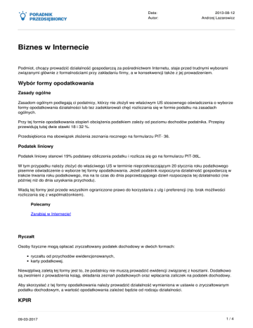 Data: Autor: 2013-08-12 Andrzej Lazarowicz Biznes w Internecie Podmiot, chcący prowadzić działalność gospodarczą za pośrednictwem Internetu, staje przed trudnymi wyborami związanymi głównie z formalnościami przy zakładaniu firmy, a w konsekwencji także z jej prowadzeniem. Wybór formy opodatkowania Zasady ogólne Zasadom ogólnym podlegają ci podatnicy, którzy nie złożyli we właściwym US stosownego oświadczenia o wyborze formy opodatkowania działalności lub tez zadeklarowali chęć rozliczania się w formie podatku na zasadach ogólnych. Przy tej formie opodatkowania stopień obciążenia podatkiem zależy od poziomu dochodów podatnika. Przepisy przewidują tutaj dwie stawki 18 i 32 %. Przedsiębiorca ma obowiązek złożenia zeznania rocznego na formularzu PIT- 36. Podatek liniowy Podatek liniowy stanowi 19% podstawy obliczenia podatku i rozlicza się go na formularzu PIT-36L. W tym przypadku należy złożyć do właściwego US w terminie nieprzekraczającym 20 stycznia roku podatkowego pisemne oświadczenie o wyborze tej formy opodatkowania. Jeżeli podatnik rozpoczyna działalność gospodarczą w trakcie trwania roku podatkowego, ma na to czas do dnia poprzedzającego dzień rozpoczęcia tej działalności (nie później niż do dnia uzyskania przychodu). Wadą tej formy jest przede wszystkim ograniczone prawo do korzystania z ulg i preferencji (np. brak możliwości rozliczania się z współmałżonkiem). Polecamy Zarabiaj w Internecie! Ryczałt Osoby fizyczne mogą opłacać zryczałtowany podatek dochodowy w dwóch formach: ryczałtu od przychodów ewidencjonowanych, karty podatkowej. Niewątpliwą zaletą tej formy jest to, że podatnicy nie muszą prowadzić ewidencji związanej z kosztami. Dodatkowo są zwolnieni z prowadzenia ksiąg, składania zeznań podatkowych oraz wpłacania zaliczek na podatek dochodowy. Aby skorzystać z tej formy opodatkowania należy prowadzić działalność wymieniona w ustawie o zryczałtowanym podatku dochodowym, a wartość opodatkowania zależeć będzie od rodzaju działalności. KPIR 09-03-2017 1/4 Data: Autor: 2013-08-12 Andrzej Lazarowicz Forma prowadzenia ewidencji księgowej jest równie ważna jak wybór opodatkowania podatkiem dochodowym. Wyróżnić tutaj można następujące przypadki: podatnicy opodatkowani podatkiem dochodowym od osób fizycznych według zasad ogólnych i podatkiem liniowym maja obowiązek prowadzenia ksiąg rachunkowych albo podatkowej księgi przychodów i rozchodów, osoby fizyczne, spółki cywilne osób fizycznych, spółki jawne osób fizycznych oraz spółki partnerskie, wykonujące działalność gospodarczą, muszą prowadzić podatkową księgę przychodów rozchodów lub księgi rachunkowe w sposób zapewniający m.in. ustalenie dochodu (straty), podstawy opodatkowania i wysokości należnego podatku za poprzedni rok podatkowy. Polecamy Ewidencjonowanie przychodów bezrachunkowych Siedziba firmy Rozpoczynając działalność gospodarczą we własnym mieszkaniu należy sprawdzić, czy nie doprowadzi to zmiany sposobu jego użytkowania. Rozumie się przez to przekształcenie obiektu budowlanego lub jego części poprzez podjęcie działalności zmieniającej warunki m. in.: bezpieczeństwa pożarowego, powodziowego, pracy, zdrowotne, higieniczno- sanitarne, ochrony środowiska. W przypadku firm funkcjonujących w Internecie charakter nieruchomości wykorzystywanej do tej pory na potrzeby mieszkalne może zmienić przeznaczenie jej części na magazyn. Zmianę sposobu użytkowania obiektu budowlanego lub jego części należy zgłosić właściwemu organowi. Z wykorzystaniem lokalu mieszkalnego w działalności gospodarczej wiążą się również opłaty z tytułu podatku od nieruchomości. W przypadku, kiedy lokal mieszkalny lub jego część został zajęty na cele prowadzenie działalności, ale powierzchnie te służą jednocześnie celom mieszkalnym, to będą one podlegały stawce podatku jak dla budynków mieszkalnych. W pozostałych przypadkach stawka ta jest określana dla lokali związanych z działalnością gospodarczą- podatek jest wówczas kosztem uzyskania przychodu. W sytuacji, kiedy przedsiębiorca zdecyduje się na prowadzenie działalności we własnym mieszkaniu, może za koszt uzyskania przychodu uznać czynsz, opłaty za energię, wodę lub odsetki od kredytu mieszkalnego. Należy pamiętać, że kwoty te uwzględnia się jedynie do wielkości odpowiadającej proporcjonalnemu udziałowi wykorzystywanej w działalności powierzchni do powierzchni mieszkaniowej ogółem. E-faktura E- faktury mogą być znaczącym udogodnieniem w realizacji transakcji sprzedaży, zwłaszcza gdy realizowana jest ona za pośrednictwem Internetu. Faktury elektroniczne muszą spełnić przede wszystkim warunek autentyczności pochodzenia oraz integralności treści. Oznacza to, że należy mieć pewność co do tożsamości dokonującego dostawy towarów lub usługodawcy czy tez wystawcy faktury. Poza tym w szczególności trzeba wykorzystać w fakturze podpis elektroniczny (weryfikowany za pomocą ważnego kwalifikowanego certyfikatu) oraz elektroniczna wymianę danych EDI. Dodatkowo konieczne jest, aby były przechowywane w takiej formie, aby możliwy był łatwy i szybki dostęp do nich (np. w przypadku kontroli skarbowej). Ważne jest, że faktury mogą być przesyłane droga elektroniczną tylko i wyłącznie za zgodą obu stron transakcji. Podpis elektroniczny Przy wystawianiu e-faktur niezbędnym elementem jest podpis elektroniczny. Są to dane w postaci elektronicznej, które wraz z innymi danymi, do których zostały dołączone lub z którymi są logicznie powiązane, służą do identyfikacji osoby składającej podpis elektroniczny. Faktury opatrzone bezpiecznym podpisem elektronicznym weryfikowanym za pomocą kwalifikowanego certyfikatu, co do zasady posiadają taką samą ważność pod względem skutków 09-03-2017 2/4 Data: Autor: 2013-08-12 Andrzej Lazarowicz prawnych