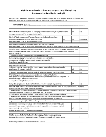 Opinia o studencie odbywającym praktykę filologiczną i potwierdzenia odbycia praktyki Poniższa karta oceny oraz dziennik praktyki stanowi podstawę zaliczenia studentowi praktyki filologicznej. Prosimy o przekazanie wypełnionego arkusza studentowi odbywającemu praktykę. KARTA OCENY studenta ………………………………………………………………………………………………………………….. Student/Studentka stawił/a się na praktykę w terminie określonym w porozumieniu Proszę wstawić znak "X" w odpowiednim polu Student/Studentka uzgodnił/uzgodniła wcześniej z Zakładem zmianę terminu praktyki określonego w porozumieniu Proszę wstawić znak "X" w odpowiednim polu tak tak nie nie nie dotyczy Ocena zaangażowania studenta/studentki w realizację praktyki Proszę wstawić znak "X" przy opisie sytuacji najlepiej charakteryzującej postawę studenta/studentki 1. wykazywanie szczególnego zainteresowania powierzonymi w ramach praktyki zadaniami i chęć poszerzania wiedzy poprzez występowanie z własną inicjatywą dotycząca zakresu i sposobu realizacji praktyki 2. chętne i staranne wykonywanie powierzonych zadań 3. niechętne, ale poprawne wykonywanie powierzonych zadań 4. niechętne i niedbałe wykonywanie powierzonych zadań 5. unikanie wszelkich prac Ocena wiedzy studenta: 1. Student nabył w czasie studiów wiedzę wystarczającą do wykonywania zadań powierzonych podczas praktyki tak nie 2. Student wykorzystywał podczas praktyki wiedzę zdobytą w trakcie studiów tak nie tak nie Ocena kompetencji językowych (umiejętności) studenta/studentki: Proszę wpisać ocenę kompetencji w momencie rozpoczecia praktyki od 1-6, gdzie 1 to niewystarczające umiejętności językowe a 6 wyjątkowa biegłość językowa Kompetencje językowe studenta/studentki na koniec praktyki poprawiły się Ocena kompetencji społecznych studenta/studentki (proszę wstawić znak "X" przy opisie sytuacji najlepiej charakteryzującej postawę studenta/studentki) 1. wykazywanie szczególnych predyspozycji do współpracy z innymi uczestnikami realizowanego zadania (inicjatywa, umiejętność organizacji pracy w grupie) 2. zachowanie poprawnych relacji z innymi uczestnikami realizowanego zadania 3. wykazywanie rezerwy w stosunku do pozostałych uczestników zadania, podejmowanie się realizacji elementów zadania nie wymagających bezpośredniej współpracy 4. generowanie sytuacji konfliktowych w grupie realizującej zadanie Zakładając, że Zakład przewiduje zatrudnienie dodatkowych pracowników, czy uczestnik/uczestniczka praktyki otrzymałby/otrzymałaby od opiekuna praktyki rekomendację zatrudnienia (proszę wstawić znak "X" w odpowiednim polu) tak nie Ogólna ocena studenta/studentki odbywającego/odbywającej praktykę Proszę wpisać ocenę: 2-niedostateczna, 3 dostateczna, 4 dobra, 5 bardzo dobra. Data i podpis opiekuna praktyki z ramienia Zakładu ………………………………………………………………………………… Potwierdzamy, że Imię i nazwisko studenta odbył praktykę w naszym Zakładzie w dniach od …………………………. do …………………...……… Pieczątka firmowa i podpis
