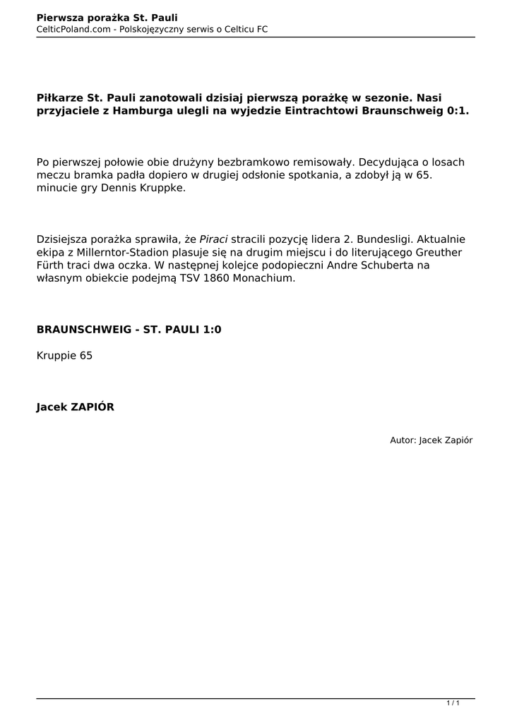 Pierwsza porażka St. Pauli CelticPoland.com - Polskojęzyczny serwis o Celticu FC Piłkarze St. Pauli zanotowali dzisiaj pierwszą porażkę w sezonie. Nasi przyjaciele z Hamburga ulegli na wyjedzie Eintrachtowi Braunschweig 0:1. Po pierwszej połowie obie drużyny bezbramkowo remisowały. Decydująca o losach meczu bramka padła dopiero w drugiej odsłonie spotkania, a zdobył ją w 65. minucie gry Dennis Kruppke. Dzisiejsza porażka sprawiła, że Piraci stracili pozycję lidera 2. Bundesligi. Aktualnie ekipa z Millerntor-Stadion plasuje się na drugim miejscu i do literującego Greuther Fürth traci dwa oczka. W następnej kolejce podopieczni Andre Schuberta na własnym obiekcie podejmą TSV 1860 Monachium. BRAUNSCHWEIG - ST. PAULI 1:0 Kruppie 65 Jacek ZAPIÓR Autor: Jacek Zapiór 1/1 Powered by TCPDF (www.tcpdf.org)