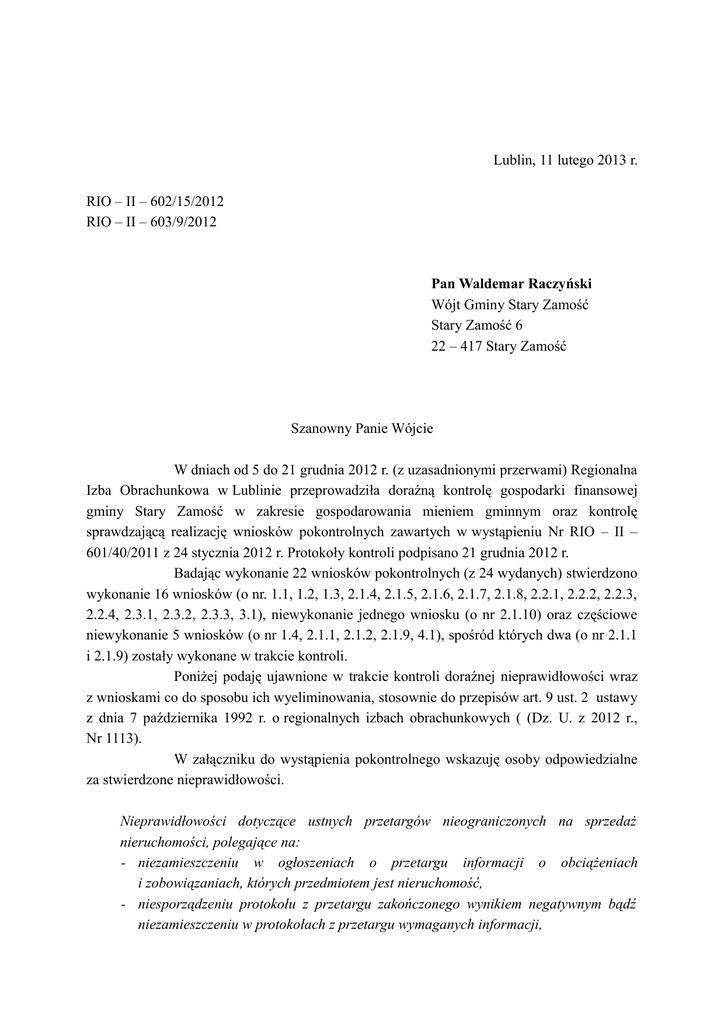 Lublin, 11 lutego 2013 r. RIO – II – 602/15/2012 RIO – II – 603/9/2012 Pan Waldemar Raczyński Wójt Gminy Stary Zamość Stary Zamość 6 22 – 417 Stary Zamość Szanowny Panie Wójcie W dniach od 5 do 21 grudnia 2012 r. (z uzasadnionymi przerwami) Regionalna Izba Obrachunkowa w Lublinie przeprowadziła doraźną kontrolę gospodarki finansowej gminy Stary Zamość w zakresie gospodarowania mieniem gminnym oraz kontrolę sprawdzającą realizację wniosków pokontrolnych zawartych w wystąpieniu Nr RIO – II – 601/40/2011 z 24 stycznia 2012 r. Protokoły kontroli podpisano 21 grudnia 2012 r. Badając wykonanie 22 wniosków pokontrolnych (z 24 wydanych) stwierdzono wykonanie 16 wniosków (o nr. 1.1, 1.2, 1.3, 2.1.4, 2.1.5, 2.1.6, 2.1.7, 2.1.8, 2.2.1, 2.2.2, 2.2.3, 2.2.4, 2.3.1, 2.3.2, 2.3.3, 3.1), niewykonanie jednego wniosku (o nr 2.1.10) oraz częściowe niewykonanie 5 wniosków (o nr 1.4, 2.1.1, 2.1.2, 2.1.9, 4.1), spośród których dwa (o nr 2.1.1 i 2.1.9) zostały wykonane w trakcie kontroli. Poniżej podaję ujawnione w trakcie kontroli doraźnej nieprawidłowości wraz z wnioskami co do sposobu ich wyeliminowania, stosownie do przepisów art. 9 ust. 2 ustawy z dnia 7 października 1992 r. o regionalnych izbach obrachunkowych ( (Dz. U. z 2012 r., Nr 1113). W załączniku do wystąpienia pokontrolnego wskazuję osoby odpowiedzialne za stwierdzone nieprawidłowości. Nieprawidłowości dotyczące ustnych przetargów nieograniczonych na sprzedaż nieruchomości, polegające na: - niezamieszczeniu w ogłoszeniach o przetargu informacji o obciążeniach i zobowiązaniach, których przedmiotem jest nieruchomość, - niesporządzeniu protokołu z przetargu zakończonego wynikiem negatywnym bądź niezamieszczeniu w protokołach z przetargu wymaganych informacji, - niezamieszczaniu w ogłoszeniach o drugim przetargu informacji o terminie przeprowadzenia pierwszego przetargu – str. 3, 4 protokołu kontroli doraźnej. W ogłoszeniu o przetargu ustnym nieograniczonym na sprzedaż nieruchomości podawać informacje wymagane przepisami § 13 rozporządzenia Rady Ministrów z dnia 14 września 2004 r. w sprawie sposobu i trybu przeprowadzania przetargów oraz rokowań na zbycie nieruchomości (Dz. U. Nr 207, poz. 2108 z późn. zm.), w tym o obciążeniach nieruchomości i zobowiązaniach, których przedmiotem jest nieruchomość (§ 13 pkt 2 i 3) rozporządzenia. Z przeprowadzonego przetargu – również zakończonego wynikiem negatywnym – sporządzać protokół, w którym zamieszczać informacje wskazane w przepisach § 10 ust. 1 rozporządzenia w sprawie sposobu i trybu przeprowadzania przetargów oraz rokowań na zbycie nieruchomości w związku z art. 40 ust. 4 ustawy z dnia 21 sierpnia 1997 r. o gospodarce nieruchomościami (Dz. U. z 2010 r. Nr 102, poz. 651 z późn. zm.). W ogłoszeniu – o kolejnym przetargu na zbycie nieruchomości – podawać terminy przeprowadzenia poprzednich przetargów, stosownie do przepisów art. 38 ust. 2 ustawy o gospodarce nieruchomościami. Jeżeli uważa Pan, że wnioski te naruszają prawo przez błędną ich wykładnię lub niewłaściwe zastosowanie, przysługuje Panu – zgodnie z art. 9 ust. 3 i 4 ustawy o regionalnych izbach obrachunkowych – prawo zgłoszenia zastrzeżeń do Kolegium Regionalnej Izby Obrachunkowej w Lublinie w ciągu 14 dni od otrzymania tego wystąpienia. Jednocześnie informuję, że – stosownie do przepisu art. 9 ust. 3 ustawy o regionalnych izbach obrachunkowych – jest Pan zobowiązany zawiadomić Izbę o wykonaniu wniosków pokontrolnych lub o przyczynach ich niewykonania – także w odniesieniu do wniosków niewykonanych lub częściowo niewykonanych, zawartych w wystąpieniu pokontrolnym Nr RIO – II – 601/40/2011 w formie pisemnej i elektronicznej (plik w formacie Microsoft Word (*.doc) lub Rich Text Format (*.rtf) na adres: [email protected]) – w terminie 30 dni od daty doręczenia Panu tego wystąpienia, mając na uwadze przepisy art. 27 tej ustawy. Jacek Grządka Do wiadomości: Rada Gminy Stary Zamość