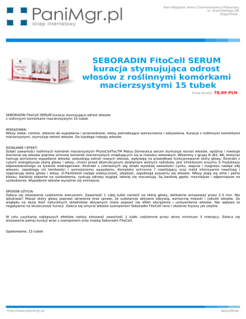Pani Magister Anna Czerniachowicz-Piskorska ul. Krasińskiego 2B Stąporków SEBORADIN FitoCell SERUM kuracja stymujująca odrost włosów z roślinnymi komórkami macierzsystymi 15 tubek Cena brutto: 78,99 PLN SEBORADIN FitoCell SERUM kuracja stymujująca odrost włosów z roślinnymi komórkami macierzsystymi 15 tubek WSKAZANIA: Włosy słabe, cienkie, skłonne do wypadania i przerzedzone, włosy potrzebujące wzmocnienia i odżywienia. Kuracja z roślinnymi komórkami macierzystymi, stymuluje odrost włosów. Do każdego rodzaju włosów. DZIAŁANIE I EFEKT: Dzięki zawartości roślinnych komórek macierzystych PhytoCellTecTM Malus Domestica serum stymuluje wzrost włosów, opóźnia i niweluje starzenie się włosów poprzez ochronę komórek macierzystych znajdujących się w mieszku włosowym. Witaminy z grupy B (B3, B6, biotyna) hamują wzmożone wypadanie włosów, pobudzają odrost nowych włosów, wpływają na prawidłowe funkcjonowanie skóry głowy. Ekstrakt z cykorii energetyzuje skórę głowy i włosy, chroni przed destrukcyjnym działaniem wolnych rodników, jest inhibitorem enzymu 5-?reduktazy odpowiedzialnego za łysienie androgenowe. Ekstrakt z czerwonych alg dzięki wysokiej zawartości cynku, wapnia i magnezu nadaje siłę włosom, zapobiega ich łamliwości i wzmożonemu wypadaniu. Kompleks ochronno ? nawilżający oraz miód intensywnie nawilżają i regenerują skórę głowy i włosy. D-Panthenol nadaje elastyczność, objętość, zapobiega puszeniu się włosów. Włosy stają się silne i pełne blasku, bardziej odporne na uszkodzenia, zyskują zdrowy wygląd, łatwiej się rozczesują. Są bardziej gęste, mocniejsze i odporniejsze na uszkodzenia. Wypadanie włosów wyraźnie się zmniejsza. SPOSÓB UŻYCIA: Zaleca się stosowanie codziennie wieczorem. Zawartość 1 całej tubki nanieść na skórę głowy, delikatnie wmasować przez 2-3 min. Nie spłukiwać! Masaż skóry głowy poprawi ukrwienie oraz sprawi, że substancje aktywne odżywią, wzmocnią mieszki i cebulki włosów. Ze względu na dużą ilość naturalnych składników aktywnych może pojawić się efekt obciążenia i usztywnienia włosów. Nie wpływa to negatywnie na skuteczność kuracji. Zaleca się umycie włosów szamponem Seboradin FitoCell rano i ułożenie fryzury jak zwykle. W celu uzyskania najlepszych efektów należy stosować zawartość 1 tubki codziennie przez okres minimum 3 miesięcy. Zaleca się stosowanie pełnej kuracji wraz z szamponem oraz maską Seboradin FitoCell. Opakowanie: 15 tubek http://www.panimgr.pl AptusShop