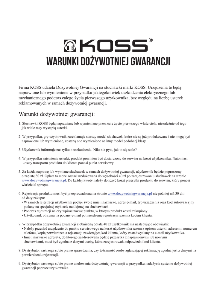 WARUNKI DOŻYWOTNIEJ GWARANCJI Firma KOSS udziela Dożywotniej Gwarancji na słuchawki marki KOSS. Urządzenia te będą naprawione lub wymienione w przypadku jakiegokolwiek uszkodzenia elektrycznego lub mechanicznego podczas całego życia pierwszego użytkownika, bez względu na liczbę usterek reklamowanych w ramach dożywotniej gwarancji. Warunki dożywotniej gwarancji: 1. Słuchawki KOSS będą naprawiane lub wymieniane przez całe życie pierwszego właściciela, niezależnie od tego jak wiele razy wystąpią usterki. 2. W przypadku, gry użytkownik zareklamuje starszy model słuchawek, które nie są już produkowane i nie mogą być naprawione lub wymienione, zostaną one wymienione na inny model podobnej klasy. 3. Użytkownik informuje nas tylko o uszkodzeniu. Nikt nie pyta, jak to się stało? 4. W przypadku zaistnienia usterki, produkt powinien być dostarczony do serwisu na koszt użytkownika. Natomiast koszty transportu produktu do klienta ponosi punkt serwisowy. 5. Za każdą naprawę lub wymianę słuchawek w ramach dożywotniej gwarancji, użytkownik będzie poproszony o zapłatę 80 zł. Opłata ta może zostać zredukowana do wysokości 40 zł po zarejestrowaniu słuchawek na stronie www.dozywotniagwarancja.pl. Do każdej kwoty należy doliczyć koszt przesyłki produktu do serwisu, który ponosi właściciel sprzętu. 6. Rejestracja produktu musi być przeprowadzona na stronie www.dozywotniagwarancja.pl nie później niż 30 dni od daty zakupu: • W ramach rejestracji użytkownik podaje swoje imię i nazwisko, adres e-mail, typ urządzenia oraz kod autoryzacyjny podany na specjalnej etykiecie naklejonej na słuchawkach. • Podczas rejestracji należy wpisać nazwę punktu, w którym produkt został zakupiony. • Użytkownik otrzyma na podany e-mail potwierdzenie rejestracji razem z kodem klienta. 7. W przypadku dożywotniej gwarancji z obniżoną opłatą 40 zł użytkownik ma następujące obowiązki: • Należy przesłać urządzenie do punktu serwisowego na koszt użytkownika razem z opisem usterki, adresem i numerem telefonu, kopią potwierdzenia rejestracji zawierającą kod klienta, który został wysłany na e-mail użytkownika. • Imię i nazwisko adresata, do którego zaadresowana będzie przesyłka z naprawionymi lub nowymi słuchawkami, musi być zgodna z danymi osoby, która zarejestrowała odpowiedni kod klienta. 8. Dystrybutor zastrzega sobie prawo sprawdzania, czy tożsamość osoby zgłaszającej reklamację zgodna jest z danymi na potwierdzeniu rejestracji. 9. Dystrybutor zastrzega sobie prawo anulowania dożywotniej gwarancji w przypadku nadużycia systemu dożywotniej gwarancji poprzez użytkownika. 2/2