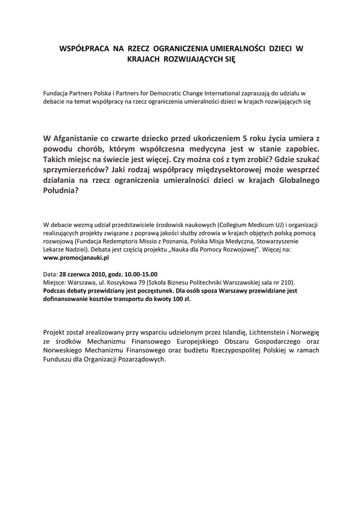 WSPÓŁPRACA NA RZECZ OGRANICZENIA UMIERALNOŚCI DZIECI W KRAJACH ROZWIJAJĄCYCH SIĘ Fundacja Partners Polska i Partners for Democratic Change International zapraszają do udziału w debacie na temat współpracy na rzecz ograniczenia umieralności dzieci w krajach rozwijających się W Afganistanie co czwarte dziecko przed ukooczeniem 5 roku życia umiera z powodu chorób, którym współczesna medycyna jest w stanie zapobiec. Takich miejsc na świecie jest więcej. Czy można coś z tym zrobid? Gdzie szukad sprzymierzeoców? Jaki rodzaj współpracy międzysektorowej może wesprzed działania na rzecz ograniczenia umieralności dzieci w krajach Globalnego Południa? W debacie wezmą udział przedstawiciele środowisk naukowych (Collegium Medicum UJ) i organizacji realizujących projekty związane z poprawą jakości służby zdrowia w krajach objętych polską pomocą rozwojową (Fundacja Redemptoris Missio z Poznania, Polska Misja Medyczna, Stowarzyszenie Lekarze Nadziei). Debata jest częścią projektu „Nauka dla Pomocy Rozwojowej”. Więcej na: www.promocjanauki.pl Data: 28 czerwca 2010, godz. 10.00-15.00 Miejsce: Warszawa, ul. Koszykowa 79 (Szkoła Biznesu Politechniki Warszawskiej sala nr 210). Podczas debaty przewidziany jest poczęstunek. Dla osób spoza Warszawy przewidziane jest dofinansowanie kosztów transportu do kwoty 100 zł. Projekt został zrealizowany przy wsparciu udzielonym przez Islandię, Lichtenstein i Norwegię ze środków Mechanizmu Finansowego Europejskiego Obszaru Gospodarczego oraz Norweskiego Mechanizmu Finansowego oraz budżetu Rzeczypospolitej Polskiej w ramach Funduszu dla Organizacji Pozarządowych.
