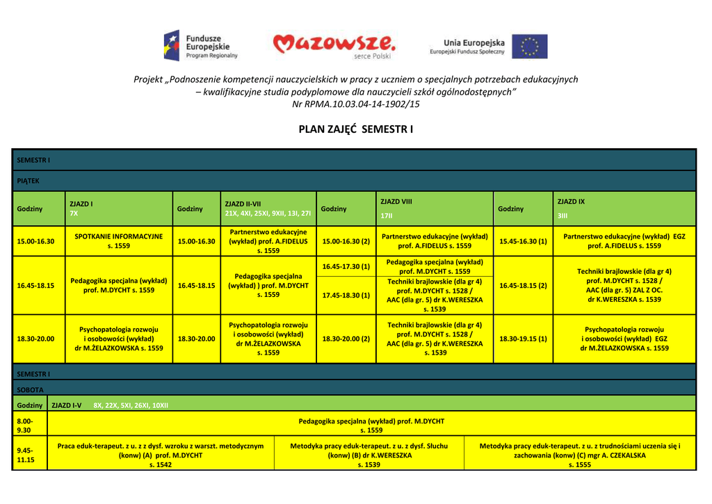 Projekt „Podnoszenie kompetencji nauczycielskich w pracy z uczniem o specjalnych potrzebach edukacyjnych – kwalifikacyjne studia podyplomowe dla nauczycieli szkół ogólnodostępnych” Nr RPMA.10.03.04-14-1902/15 PLAN ZAJĘĆ SEMESTR I SEMESTR I PIĄTEK ZJAZD I 7X Godziny 15.00-16.30 Godziny SPOTKANIE INFORMACYJNE s. 1559 15.00-16.30 ZJAZD II-VII 21X, 4XI, 25XI, 9XII, 13I, 27I Partnerstwo edukacyjne (wykład) prof. A.FIDELUS s. 1559 Godziny 15.00-16.30 (2) 16.45-17.30 (1) 16.45-18.15 18.30-20.00 Pedagogika specjalna (wykład) prof. M.DYCHT s. 1559 Psychopatologia rozwoju i osobowości (wykład) dr M.ŻELAZKOWSKA s. 1559 16.45-18.15 18.30-20.00 Pedagogika specjalna (wykład) ) prof. M.DYCHT s. 1559 Psychopatologia rozwoju i osobowości (wykład) dr M.ŻELAZKOWSKA s. 1559 17.45-18.30 (1) 18.30-20.00 (2) ZJAZD VIII Godziny 17II Partnerstwo edukacyjne (wykład) prof. A.FIDELUS s. 1559 ZJAZD IX 3III 15.45-16.30 (1) Partnerstwo edukacyjne (wykład) EGZ prof. A.FIDELUS s. 1559 Pedagogika specjalna (wykład) prof. M.DYCHT s. 1559 Techniki brajlowskie (dla gr 4) prof. M.DYCHT s. 1528 / AAC (dla gr. 5) dr K.WERESZKA s. 1539 16.45-18.15 (2) Techniki brajlowskie (dla gr 4) prof. M.DYCHT s. 1528 / AAC (dla gr. 5) ZAL Z OC. dr K.WERESZKA s. 1539 Techniki brajlowskie (dla gr 4) prof. M.DYCHT s. 1528 / AAC (dla gr. 5) dr K.WERESZKA s. 1539 18.30-19.15 (1) Psychopatologia rozwoju i osobowości (wykład) EGZ dr M.ŻELAZKOWSKA s. 1559 SEMESTR I SOBOTA Godziny ZJAZD I-V 8X, 22X, 5XI, 26XI, 10XII 8.009.30 9.4511.15 Pedagogika specjalna (wykład) prof. M.DYCHT s. 1559 Praca eduk-terapeut. z u. z z dysf. wzroku z warszt. metodycznym (konw) (A) prof. M.DYCHT s. 1542 Metodyka pracy eduk-terapeut. z u. z dysf. Słuchu (konw) (B) dr K.WERESZKA s. 1539 Metodyka pracy eduk-terapeut. z u. z trudnościami uczenia się i zachowania (konw) (C) mgr A. CZEKALSKA s. 1555 Projekt „Podnoszenie kompetencji nauczycielskich w pracy z uczniem o specjalnych potrzebach edukacyjnych – kwalifikacyjne studia podyplomowe dla nauczycieli szkół ogólnodostępnych” Nr RPMA.10.03.04-14-1902/15 ZJAZD I-V 8X, 22X, 5XI, 26XI, 10XII GRUPY 1-10 W ramach przedmiotów: Zajęcia korekcyjno-kompensacyjne w szkole (ćw.), Techniki twórczego uczenia się, zapamiętywania, motywowania (warszt.), Gry i zabawy ruchowe w terapii pedagogicznej (ćw.), Jak radzić sobie z trudnym rodzicem (warszt.), Techniki plastyczne w edukacji i terapii osób z niepełnosprawnością intelektualną i z wieloraką niepełnosprawnością (ćw.), Orientacja przestrzenna i bezpieczne poruszanie się osób z dysfunkcją wzroku (ćw.), Strategie wspomagające integrację społeczną uczniów (ćw.), Konstruowanie indywidualnych programów edukacyjno-terapeutycznych i projektów edukacyjnych w pracy z uczniem z trudnościami rozwoju i adaptacji (ćw.) – ZALICZENIE Z OCENĄ NA 5 ZJEŹDZIE. Godziny GRUPA 1 GRUPA 2 GRUPA 3 GRUPA 4 GRUPA 5 GRUPA 6 GRUPA 7 GRUPA 8 GRUPA 9 GRUPA 10 11.3013.00 Techniki brajlowskie (ćw) prof. M.DYCHT s. 1528 AAC (ćw) dr K.WERESZKA s. 1539 Zajęcia korkomp. w szkole (ćw) mgr A.CZEKALSKA s. 1545 Techniki twórczego uczenia się (warszt) mgr L.KURCIŃSKA s. 1542 Gry i zabawy ruchowe w terapii ped. (ćw) dr I.GĄTAREK s. 1555 Jak radzić sobie z trudnym rodzicem (warszt) dr M.CIECHOMSKI s. 1540 Techniki plastyczne w eduk. i terapii (ćw) dr K.KRAWIECKA s. 1544 Orientacja przestrzenna (ćw) mgr J.KWAPISZ s. 1543 Konstruowanie IPE-T (ćw) mgr B.SAPIEJEWSKADĄBROWSKA s. 1559 Strategie wspomagające integrację społeczną uczniów (ćw) mgr J.DĄBROWSKI s. 1529 13.1514.45 Strategie wspomagające integrację społeczną uczniów (ćw) mgr J.DĄBROWSKI s. 1529 Techniki brajlowskie (ćw) prof. M.DYCHT s. 1528 AAC (ćw) dr K.WERESZKA s. 1539 Zajęcia kor-komp. w szkole (ćw) mgr A.CZEKALSKA s. 1545 Techniki twórczego uczenia się (warszt) mgr L.KURCIŃSKA s. 1542 Gry i zabawy ruchowe w terapii ped. (ćw) dr I.GĄTAREK s. 1555 Jak radzić sobie z trudnym rodzicem (warszt) dr M.CIECHOMSKI s. 1540 Techniki plastyczne w eduk. i terapii (ćw) dr K.KRAWIECKA s. 1544 Orientacja przestrzenna (ćw) mgr J.KWAPISZ s. 1543 Konstruowanie IPE-T (ćw) mgr B.SAPIEJEWSKADĄBROWSKA s. 1559 15.0016.30 Konstruowanie IPE-T (ćw) mgr B.SAPIEJEWSKADĄBROWSKA s. 1559 Strategie wspomagające integrację społeczną uczniów (ćw) mgr J.DĄBROWSKI s. 1529 Techniki brajlowskie (ćw) prof. M.DYCHT s. 1528 AAC (ćw) dr K.WERESZKA s. 1539 Zajęcia kor-komp. w szkole (ćw) mgr A.CZEKALSKA s. 1545 Techniki twórczego uczenia się (warszt) mgr L.KURCIŃSKA s. 1542 Gry i zabawy ruchowe w terapii ped. (ćw) dr I.GĄTAREK s. 1555 Jak radzić sobie z trudnym rodzicem (warszt) dr M.CIECHOMSKI s. 1540 Techniki plastyczne w eduk. i terapii (ćw) dr K.KRAWIECKA s. 1544 Orientacja przestrzenna (ćw) mgr J.KWAPISZ s. 1543 Projekt „Podnoszenie kompetencji nauczycielskich w pracy z uczniem o specjalnych potrzebach edukacyjnych – kwalifikacyjne studia podyplomowe dla nauczycieli szkół ogólnodostępnych” Nr RPMA.10.03.04-14-1902/15 16.4518.15 Orientacja przestrzenna (ćw) mgr J.KWAPISZ s. 1543 Konstruowanie IPE-T (ćw) mgr B.SAPIEJEWSKADĄBROWSKA s. 1559 Strategie wspomagające integrację społeczną uczniów (ćw) mgr J.DĄBROWSKI s. 1529 Techniki brajlowskie (ćw) prof. M.DYCHT s. 1528 AAC (ćw) dr K.WERESZKA s. 1539 Zajęcia kor-komp. w szkole (ćw) mgr A.CZEKALSKA s. 1545 Techniki twórczego uczenia się (warszt) mgr L.KURCIŃSKA s. 1542 Gry i zabawy ruchowe w terapii ped. (ćw) dr I.GĄTAREK s. 1555 Jak radzić sobie z trudnym rodzicem (warszt) dr M.CIECHOMSKI s. 1540 Techniki plastyczne w eduk. i terapii (ćw) dr K.KRAWIECKA s. 1544 18.3020.00 Techniki plastyczne w eduk. i terapii (ćw) dr K.KRAWIECKA s. 1544 Orientacja przestrzenna (ćw) mgr J.KWAPISZ s. 1543 Konstruowanie IPE-T (ćw) mgr B.SAPIEJEWSKADĄBROWSKA s. 1559 Strategie wspomagające integrację społeczną uczniów (ćw) mgr J.DĄBROWSKI s. 1529 Techniki brajlowskie (ćw) prof. M.DYCHT s. 1528 AAC (ćw) dr K.