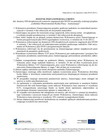 Załącznik nr 2 do zapytania z dnia 09.03.2015 r. ISTOTNE POSTANOWIENIA UMOWY dot. dostawy 850 dwupłytowych zestawów nagranych płyt DVD5 na potrzeby realizacji projektu „Lubelskie Obserwatorium Rynku Pracy – kontynuacja” 1. Wykonawca przedstawi Zamawiającemu projekty graficzne nadruków na materiałach promocyjnych w terminie 4 dni roboczych od otrzymania materiałów. 2. Zamawiający ma prawo do wnoszenia uwag i poprawek, które muszą zostać uwzględnione, a wybrany projekt przedstawiony w terminie 2 dni roboczych do akceptacji. 3. Dane, które znajdą się na płytach zostaną dostarczone Wykonawcy przez Zamawiającego w formie przygotowanych płyt DVD (egzemplarze wzorcowe), w terminie do 31.03.2015 r. 4. Wykonawca zobowiązuje się dostarczyć 850 dwupłytowych zestawów nagranych płyt DVD5 w terminie 7 dni roboczych od zaakceptowania projektu graficznego nadruków i/lub otrzymania od Wykonawcy płyt DVD z przygotowanymi danymi. 5. Wykonawca zobowiąże się do przeniesienia na Zamawiającego całości majątkowych praw autorskich do projektów graficznych. 6. Warunkiem wystawienia faktury VAT przez Wykonawcę jest zaakceptowanie i przyjęcie bez zastrzeżeń przedmiotu zamówienia przez Zamawiającego potwierdzone protokołem odbioru. 7. Zapłata wynagrodzenia nastąpi na podstawie faktury wystawionej przez Wykonawcę na wskazany przez niego rachunek bankowy, w terminie 14 dni od dnia wystawienia przez Wykonawcę faktury VAT Zamawiającemu, przy czym Wykonawca zobowiązuje się do dostarczenia Zamawiającemu faktury w ciągu 7 dni od daty jej wystawienia. 8. Dniem zapłaty należności jest dzień obciążenia rachunku Zamawiającego. 9. Zamawiający zastrzega sobie możliwość żądania wystawienia przez Wykonawcę dowolnej liczby faktur w dowolnym zestawieniu asortymentowym obejmującym niniejszy przedmiot zamówienia. 10. W przypadku rażącego naruszenia postanowień umowy, Zamawiający może odstąpić od umowy w trybie natychmiastowym. 11. Za opóźnienie w wykonaniu przedmiotu zamówienia oraz opóźnienie w usunięciu braków ilościowych lub wad Zamawiający może naliczyć Wykonawcy kary umowne w wysokości 0,5% wynagrodzenia umownego brutto za każdy dzień opóźnienia odpowiednio za niewykonane elementy zamówienia opisane w załączniku nr 1. 12. W wypadku niewykonania lub odstąpienia od umowy, jak również w sytuacji jej nienależytego wykonania z przyczyn leżących po stronie Wykonawcy, Zamawiający może naliczyć Wykonawcy karę umowną w wysokości 10% wartości wynagrodzenia brutto. 13. Strony dopuszczają możliwość dochodzenia na zasadach ogólnych odszkodowania przekraczającego wysokość kar umownych. Projekt współfinansowany jest ze środków Unii Europejskiej w ramach Europejskiego Funduszu Społecznego (85%) oraz ze środków krajowych w ramach budżetu państwa (15%)