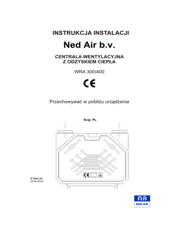 INSTRUKCJA INSTALACJI CENTRALA WENTYLACYJNA Z ODZYSKIEM CIEPŁA WRA 300/400 Przechowywać w pobliżu urządzenia Kraj: PL 25.08.2003r Spis treści: 1 Informacje ogólne 1.1 Wersje 2 Gwarancja i odpowiedzialność producenta 2.1 Odpowiedzialność 2.2 Gwarancja 3 Instalacja 3.1 Warunki instalacji 3.2 Przepisy 3.3 Zawieszanie rekuperatora 3.4 Podłączanie kanałów wentylacyjnych 3.5 Podłączanie odpływu skroplin 3.6 Podłączenia elektryczne 3.6.1 Regulacja obrotów 3.6.2 Czujnik pożarowy 3.6.3 Zasilanie sieciowe 3.7 Bypass 4 Regulacja przepływu powietrza 5 Dane techniczne 5.1 Dane urządzenia 5.2 Parametry energetyczne WRA 400 5.3 Parametry energetyczne WRA 300 6 Konserwacja 6.1 Konserwacja przez użytkownika 6.2 Konserwacja przez instalatora 7 Części serwisowe 8 Raport pomiarowy instalacji WRA 1. Informacje ogólne Zakupili Państwo centralę wentylacyjną nawiewno-wywiewną z odzyskiem ciepła wyprodukowaną przez Ned Air b.v., w dalszej części instrukcji nazywaną w skrócie rekuperatorem WRA. Dziękujemy za wybranie naszego produktu. Poświęciliśmy dużo uwagi, aby zagwarantować jego trwałość i jakość. Nie zapomnieliśmy także o wygodzie użytkowania i łatwości konserwacji. Rekuperator WRA jest częścią systemu wentylacyjnego, obejmującego centralnie umieszczony moduł nawiewno-wywiewny, przełącznik do obsługi urządzenia, system kanałów wentylacyjnych i zaworów (anemostatów). Przy projektowaniu systemu założono, że instalacja będzie użytkowana przez 24 godziny na dobę. Aby zapewnić jak najmniejsze zużycie energii, zastosowano energooszczędne silniki elektryczne na prąd stały. Niniejsza instrukcja stanowi źródło informacji dla instalatora, aby zapewnić zainstalowanie i konserwację urządzenia w należyty sposób. Prosimy o uważne przeczytanie instrukcji przed instalacją i pierwszym uruchomieniem urządzenia. W korespondencji należy zawsze podawać typ, numer zamówienia i datę umieszczoną na tabliczce znamionowej. Instrukcja instalacji WRA 1.1 Wersje Rekuperator WRA jest przeznaczony do usuwania zużytego powietrza z pomieszczeń i doprowadzania świeżego powietrza z zewnątrz. Rekuperator WRA jest dostępny w 8 wersjach: 1. WRA 300 L; złącza kanałów prowadzących do wnętrza budynku umieszczone po lewej stronie urządzenia, a złącza kanałów dachowych po prawej. 2. WRA 300 R; złącza kanałów prowadzących do wnętrza budynku umieszczone po prawej stronie urządzenia, a złącza kanałów dachowych po lewej. 3. WRA 300 LB; złącza kanałów prowadzących do wnętrza budynku umieszczone po lewej stronie urządzenia, a złącza kanałów dachowych po prawej. Urządzenie jest wyposażone w automatycznie sterowany bypass. 4. WRA 300 RB; złącza kanałów prowadzących do wnętrza budynku umieszczone po prawej stronie urządzenia, a złącza kanałów dachowych po lewej. Urządzenie jest wyposażone w automatycznie sterowany bypass. 5. WRA 400 L; złącza kanałów prowadzących do wnętrza budynku umieszczone po lewej stronie urządzenia, a złącza kanałów dachowych po prawej. 6. WRA 400 R; złącza kanałów prowadzących do wnętrza budynku umieszczone po prawej stronie urządzenia, a złącza kanałów dachowych po lewej. 7. WRA 400 LB; złącza kanałów prowadzących do wnętrza budynku umieszczone po lewej stronie urządzenia, a złącza kanałów dachowych po prawej. Urządzenie jest wyposażone w automatycznie sterowany bypass. 8. WRA 400 RB; złącza kanałów prowadzących do wnętrza budynku umieszczone po prawej stronie urządzenia, a złącza kanałów dachowych po lewej. Urządzenie jest wyposażone w automatycznie sterowany bypass. Za pomocą dołączonego uchwytu montażowego można zawiesić urządzenie na ścianie. Urządzenie jest dostarczane gotowe do podłączenia i z dołączoną instrukcją instalacji i uchwytem montażowym. Lewa Rys. 1: Przyłącza powietrza w wersji lewej i prawej WZ = do pomieszczeń BZ = na zewnątrz 1 = Wywiew z pomieszczeń 2 = Nawiew do pomieszczeń 3 = Odprowadzanie na zewnątrz (wyrzutnia) 4 = Doprowadzanie z zewnątrz (czerpnia) Instrukcja instalacji WRA Prawa 2 Gwarancja i odpowiedzialność producenta 2.1 Odpowiedzialność Rekuperator WRA został zaprojektowany i wyprodukowany do stosowania w systemach wentylacji zrównoważonej. Używanie go do jakichkolwiek innych celów będzie traktowane jako użytkowanie niezgodnie z przeznaczeniem i może prowadzić do uszkodzeń rekuperatora lub urazów, za które producent nie odpowiada. Stanowczo nie należy podłączać do tego systemu okapów kuchennych. 2.2 Gwarancja Ned Air b.v. nieustannie dąży do zapewnienia optymalnej jakości stosowanych materiałów i metod wytwarzania swoich produktów. Instalację należy wykonać zgodnie z obowiązującymi przepisami oraz dołączonymi instrukcjami Ned Air b.v. dotyczącymi montażu i konserwacji. Producent udziela gwarancji na rekuperator WRA przez okres jednego roku od dnia zainstalowania rekuperatora. Biorąc pod uwagę upływ czasu pomiędzy datą produkcji a datą zakupu można przyjąć, co pozostawia się jednak do wyłącznego uznania Ned Air b.v., że sprzedaż nastąpiła maksymalnie 6 miesięcy od daty produkcji. Roszczenia gwarancyjne można zgłaszać tylko w przypadku wad materiałowych lub konstrukcyjnych, które powstały w okresie gwarancyjnym. W przypadku zgłoszenia roszczeń gwarancyjnych nie można demontować rekuperatora WRA bez pisemnej zgody producenta. Części zamienne są objęte gwarancją tylko wtedy, jeśli zostały dostarczone przez producenta i zainstalowane przez autoryzowanego instalatora. Używanie rekuperatora WRA bez filtrów nie podlega gwarancji i skraca żywotność urządzenia. Gwarancja nie obowiązuje w następujących przypadkach: Wykonanie instalacji niezgodnie z instrukcją instalacji i obowiązującymi przepisami. Uszkodzenia powstałe wskutek nieprawidłowego podłączenia, niewłaściwego użytkowania lub zanieczyszczenia wentylato