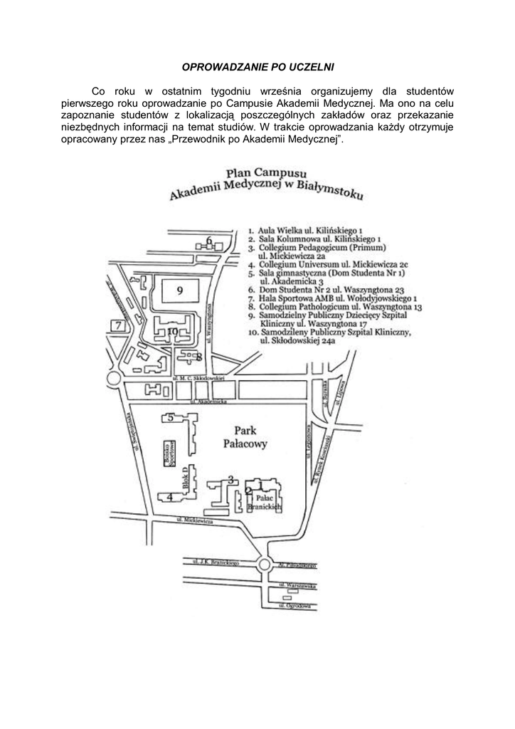 OPROWADZANIE PO UCZELNI Co roku w ostatnim tygodniu września organizujemy dla studentów pierwszego roku oprowadzanie po Campusie Akademii Medycznej. Ma ono na celu zapoznanie studentów z lokalizacją poszczególnych zakładów oraz przekazanie niezbędnych informacji na temat studiów. W trakcie oprowadzania każdy otrzymuje opracowany przez nas „Przewodnik po Akademii Medycznej”. 1. • • • • • • • Pałac Branickich Aula Magna Dziekanaty Dział ds. studenckich Biblioteka Rektorat Kasa uczelniana Studium filozofii i psychologii człowieka (przedmioty: Filozofia, Psychologia, Etyka Zawodowa) 2. Lewe skrzydło Pałacu Branickich • Zakład Biologii (przedmioty: Biologia z genetyką, Botanika Farmaceutyczna) • Sala kolumnowa (wykłady: Biologia z genetyką, Botanika Farmaceutyczna, Chemia analityczna II, Farmakologia, Bromatologia) • Siedziba główna AZS (tu możesz wykupić legitymacje AZS) • Siedziba Chóru akademickiego • Biuro rekrutacji Prawe skrzydło Pałacu Branickich • Zakład Bromatologii A: 3. Collegium Primum I piętro: • Zakład Chemii Organicznej • Zakład Biochemii II piętro: • Zakład Chemii Nieorganicznej i Analitycznej • Zakład Chemii Fizycznej • Zakład Fizjologii • Sala wykładowa 218 (wykłady: Chemia Organiczna, Farmakognozja, Technologia Postaci Leku, Biofarmacja) • Sala wykładowa 223 (wykłady: Chemia Nieorganiczna i Analityczna, Biofizyka, Chemia Fizyczna, Fizjologia, Chemia leków, Farmakognozja, Technologia Postaci Leku, Biochemia, Immunologia) • Hol przed salą 223 – gablota Młodej Farmacji B: • Zakład Zdrowia Publicznego (Socjologia) C: I piętro: • Zakład Biofizyki II piętro: • Sale ćwiczeniowe Studium Języków Obcych • • Zakład Chemii i Analizy leków Zakład Syntezy i Technologii Środków Leczniczych • Zakład Farmakognozji D: E: 4. • • • • • • • • • Collegium Uniwersum Zakład Matematyki i Informatyki Użytkowej Zakład Zdrowia Publicznego Zakład Analizy Instrumentalnej (Chemia Analityczna II) Zakład Patofizjologii Zakład Toksykologii Zakład Farmacji Stosowanej (Technologia Postaci Leku) Zakład Farmakologii Studium Języków Obcych Sala wykładowa [beczka] (wykłady: Matematyka, Historia Farmacji, Patofizjologia, Synteza i Technologia Środków Leczniczych) • Klub Herkulesy 5. • • • • • • • • Dom Studenta nr 1 Studium Wychowania Fizycznego i Sportu Sala gimnastyczna i Sala tenisa stołowego Przychodnia Akademicka SAFF SCR Radiosupeł Klub Co nie co Siedziba Organizacji Studenckich XERO 6. Dom Studenta nr 2 7. Hala Sportowa AMB 8. Collegium Pathologicum • Sala wykładowa (Toksykologia) • Siedziba Klubu Uczelnianego Akademickiego Związku Sportowego AMB 9. DSK • Sala wykładowa (Mikrobiologia) 10. „Łącznik” PSK-DSK (blok E) • Zakład mikrobiologii (V piętro) • Zakład Immunologii (II piętro)