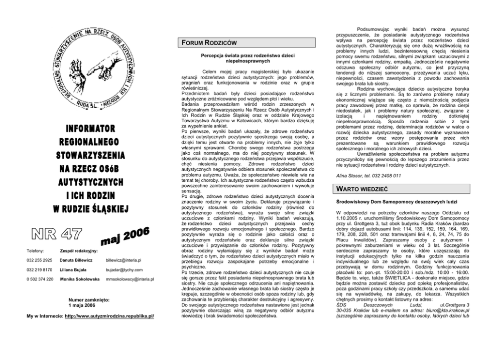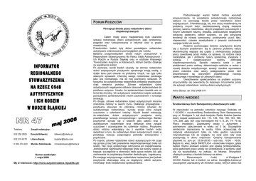 FORUM RODZICÓW Percepcja świata przez rodzeństwo dzieci niepełnosprawnych Telefony: Zespół redakcyjny: 032 255 2925 Danuta Billewicz [email protected] 032 219 8170 Liliana Bujała [email protected] 0 502 374 220 Monika Sokołowska [email protected] Numer zamknięto: 1 maja 2006 My w Internecie: http://www.autyzmirodzina.republika.pl/ Celem mojej pracy magisterskiej było ukazanie sytuacji rodzeństwa dzieci autystycznych: jego problemów, pragnień oraz funkcjonowania w rodzinie oraz w grupie rówieśniczej. Przedmiotem badań były dzieci posiadające rodzeństwo autystyczne zróżnicowane pod względem płci i wieku. Badania przeprowadziłam wśród rodzin zrzeszonych w Regionalnym Stowarzyszeniu Na Rzecz Osób Autystycznych i Ich Rodzin w Rudzie Śląskiej oraz w oddziale Krajowego Towarzystwa Autyzmu w Katowicach, którym bardzo dziękuję za wypełnienie ankiet. Po pierwsze, wyniki badań ukazały, że zdrowe rodzeństwo dzieci autystycznych pozytywnie spostrzega swoją osobę, a dzięki temu jest otwarte na problemy innych, nie żyje tylko własnymi sprawami. Chorobę swego rodzeństwa postrzega jako coś normalnego, ma do niej pozytywny stosunek. W stosunku do autystycznego rodzeństwa przejawia współczucie, chęć niesienia pomocy. Zdrowe rodzeństwo dzieci autystycznych negatywnie odbiera stosunek społeczeństwa do problemu autyzmu. Uważa, że społeczeństwo niewiele wie na temat tej choroby. Ich autystyczne rodzeństwo często wzbudza powszechne zainteresowanie swoim zachowaniem i wywołuje sensację. Po drugie, zdrowe rodzeństwo dzieci autystycznych docenia znaczenie rodziny w swoim życiu. Deklaruje przywiązanie i pozytywny stosunek do członków rodziny (również do autystycznego rodzeństwa), wyraża swoje silne związki uczuciowe z członkami rodziny. Wyniki badań wskazują, że rodzeństwo dzieci autystycznych przejawia cechy prawidłowego rozwoju emocjonalnego i społecznego. Bardzo pozytywnie wyraża się o rodzinie jako całości oraz o autystycznym rodzeństwie oraz deklaruje silne związki uczuciowe i przywiązanie do członków rodziny. Pozytywny obraz rodziny wyłaniający się z wyników badań może świadczyć o tym, że rodzeństwo dzieci autystycznych miało w przebiegu rozwoju zaspokajane potrzeby emocjonalne i psychiczne. Po trzecie, zdrowe rodzeństwo dzieci autystycznych nie czuje się gorsze przez fakt posiadania niepełnosprawnego brata lub siostry. Nie czuje społecznego odrzucenia ani napiętnowania. Jednocześnie zachowanie własnego brata lub siostry często je krępuje, szczególnie w obecności osób spoza rodziny lub, gdy zachowania te przybierają charakter destrukcyjny i agresywny. Do swojego autystycznego rodzeństwa nastawione jest jednak pozytywnie obarczając winą za negatywny odbiór autyzmu niewiedzę i brak świadomości społeczeństwa. Podsumowując wyniki badań można wysunąć przypuszczenie, że posiadanie autystycznego rodzeństwa wpływa na percepcję świata przez rodzeństwo dzieci autystycznych. Charakteryzują się one dużą wrażliwością na problemy innych ludzi, bezinteresowną chęcią niesienia pomocy swemu rodzeństwu, silnymi związkami uczuciowymi z innymi członkami rodziny, empatią. Jednocześnie negatywnie odczuwa społeczny odbiór autyzmu, co jest przyczyną tendencji do niższej samooceny, przeżywania uczuć lęku, niepewności, czasem zawstydzenia z powodu zachowania swojego brata lub siostry. Rodzina wychowująca dziecko autystyczne boryka się z licznymi problemami. Są to zarówno problemy natury ekonomicznej wiążące się często z niemożnością podjęcia pracy zawodowej przez matkę, co sprawia, że rodzina cierpi niedostatek, jak i problemy natury społecznej, związane z izolacją i napiętnowaniem rodziny dotkniętej niepełnosprawnością. Sposób radzenia sobie z tymi problemami przez rodzinę, determinacja rodziców w walce o rozwój dziecka autystycznego, zasady moralne wyznawane przez rodziców oraz wzory postępowania przez nich prezentowane są warunkiem prawidłowego rozwoju społecznego i moralnego ich zdrowych dzieci. Uwrażliwienie społeczeństwa na problem autyzmu przyczyniłoby się pewnością do lepszego zrozumienia przez nie sytuacji rodzeństwa i rodziny dzieci autystycznych. Alina Stosor, tel. 032 2408 011 WARTO WIEDZIEĆ Środowiskowy Dom Samopomocy deszczowych ludzi W odpowiedzi na potrzeby członków naszego Oddziału od 1.10.2005 r. uruchomiliśmy Środowiskowy Dom Samopomocy przy ul. Grottgera 3, tuż obok budynku Radia Kraków (bardzo dobry dojazd autobusami linii: 114, 139, 152, 159, 164, 169, 179, 208, 228, 501 oraz tramwajami linii 4, 8, 24, 74, 75 do Placu Inwalidów). Zapraszamy osoby z autyzmem i pokrewnymi zaburzeniami w wieku od 3 lat. Szczególnie serdecznie zapraszamy te osoby, które uczęszczają do instytucji edukacyjnych tylko na kilka godzin nauczania indywidualnego lub ze względu na swój wiek cały czas przebywają w domu rodzinnym. Godziny funkcjonowania placówki to: pon.-pt. 15:00-20:00 i sob./ndz. 10:00 - 16:00. Będzie to, więc, także ŚWIETLICA - doskonałe miejsce, gdzie będzie można zostawić dziecko pod opieką profesjonalistów, poza godzinami pracy szkoły czy przedszkola, a samemu udać się na wywiadówkę, na zakupy, do lekarza. Wszystkich chętnych prosimy o kontakt listowny na adres: ŚDS Deszczowych Ludzi, ul.Grottgera 3 30-035 Kraków lub e-mailem na adres: [email protected] (szczególnie zapraszamy do kontaktu osoby, których dzieci lub podopieczni miałyby być stałymi rezydentami przez 5-7 dni w tygodniu). Wyszukała: DB (test pochodzi ze strony internetowej KTA Kraków) Ciemna strona szczepionek? Rodzice w Polsce coraz częściej chcą opóźnić moment szczepienia dziecka lub sprzeciwiają się szczepieniom - ocenia "Metropol". Argumentem rodziców jest obawa, że szczepionki mogą mieć wiele skutków ubocznych. Gdy niedawno ukazała się książka Iana Sinclaira "Szczepienia - ukrywane fakty", na forach inter