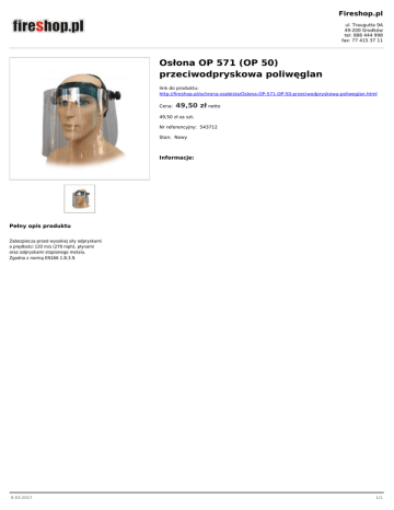 Fireshop.pl ul. Traugutta 9A 49-200 Grodków tel: 888 444 998 fax: 77 415 37 11 Osłona OP 571 (OP 50) przeciwodpryskowa poliwęglan link do produktu: http://fireshop.pl/ochrona-osobista/Oslona-OP-571-OP-50-przeciwodpryskowa-poliweglan.html Cena: 49,50 zł netto 49,50 zł za szt. Nr referencyjny: 543712 Stan: Nowy Informacje: Pełny opis produktu Zabezpiecza przed wysokiej siły odpryskami o prędkości 120 m/s (270 mph), płynami oraz odpryskami stopionego metalu. Zgodna z normą EN166 1.B.3.9. 9-03-2017 1/1
