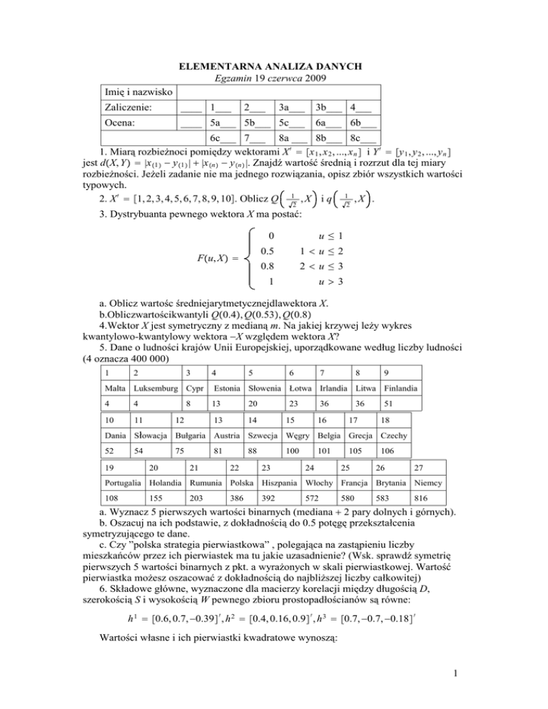 ELEMENTARNA ANALIZA DANYCH Egzamin 19 czerwca 2009