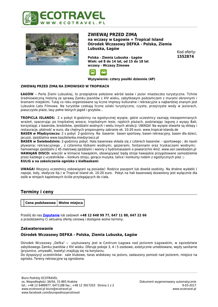 ZWIEWAJ PRZED ZIMĄ na wczasy w Łagowie + Tropical Island Ośrodek Wczasowy DEFKA - Polska, Ziemia Lubuska, Łagów Polska › Ziemia Lubuska › Łagów Wiek: od 8 do 14 lat, od 15 do 18 lat wczasy › Wczasy Zimowe Kod oferty: 1552874 Wyżywienie: cztery posiłki dziennie (4P) ZWIEWAJ PRZED ZIMĄ NA ZIMOWISKO W TROPIKACH ŁAGÓW – Perła Ziemi Lubuskiej, to przepięknie położone wśród lasów i jezior miasteczko turystyczne. Tchnie średniowieczną historią za sprawą Zamku Joanitów z XIV wieku, zabytkowym podzamczem z murami obronnymi i bramami miejskimi. Tutaj co roku organizowane są liczne imprezy kulturalne i rekreacyjne a najbardziej znanym jest Lubuskie Lato Filmowe. Na turystów czekają liczne szlaki turystyczne, czyste, przejrzyste wody w jeziorach, piaszczyste plaże, lasy pełne leśnych jagód i grzybów... TROPICLA ISLANDS: 2 x pobyt 4-godzinny na egzotycznej wyspie, gdzie uczestnicy zaznają niezapomnianych wrażeń, spacerując po tropikalnej wiosce, tropikalnym lesie, rajskich plażach, podziwiając lagunę z wyspy Bali, korzystając z basenów, brodzików, zjeżdżalni wodnych i wielu innych atrakcji. UWAGA! Na wyspie otwarte są sklepy i restauracje, płatność w euro, dla chętnych proponujemy zabranie ok. 10-20 euro. www.tropical-islands.de BASEN w Międzyrzeczu: 2 x pobyt 2-godzinny. Na basenie: basen sportowy, basen rekreacyjny, basen dla dzieci, jacuzzi, zjeżdżalnia www.kasztelanka.miedzyrzecz.pl BASEN w Świebodzinie: 2-godzinny pobyt. Hala basenowa składa się z czterech basenów: - sportowego ; do nauki pływania; rekreacyjnego , z czterema łóżkami wodnymi, gejzerami, fontannami oraz tryskaczami wodnymi; hamownego zjeżdżalni z 45 metrowej zjeżdżalni i wanny z hydromasażem o powierzchni 4m2. www.osir.swiebodzin.pl HAWAJAN DISCO: wieczór w klimacie hawajskim, obowiązywać będą stroje hawajskie przygotowane samodzielnie przez każdego z uczestników – konkurs stroju, gorąca muzyka, tańce i konkursy rodem z egzotycznych plaż … KULIG a na zakończenie ognisko z kiełbaskami UWAGA! Wszyscy uczestnicy zobowiązani są posiadać: Rodzice paszport lub dowód osobisty. Na drobne wydatki ( napoje, lody, słodycze itp.) w Tropical Island ok. 10-20 euro. Pobyt na hali basenowej dozwolony jest wyłącznie dla osób w strojach kąpielowych ściśle przylegających do ciała. Terminy i ceny Cena podstawowa Wolne miejsca Prześlij do nas Zapytanie lub zadzwoń +48 12 648 99 77, 647 11 88, 647 22 66 a przedstawimy Ci aktualnę ofertę cenową i dostępne wolne terminy. Zakwaterowanie Ośrodek Wczasowy DEFKA - Polska, Ziemia Lubuska, Łagów Ośrodek Wczasowy „Defka” – usytuowany jest w Centrum Łagowa nad jeziorem Łagowskim, w sąsiedztwie zabytkowego Zamku Joanitów z XIV wieku. Oferuje pokoje 3, 4 i 5 osobowe, estetycznie umeblowane, węzły sanitarne (prysznice, umywalki, toalety) znajdują się na korytarzu. Do dyspozycji uczestników: sale klubowe, taras widokowy na jezioro, zadaszony pomost nad jeziorem, miejsce na ognisko. Tereny rekreacyjne są ogrodzone. Biuro Podróży ECOTRAVEL os. Niepodległości 3A/5A, 31-865 Kraków tel.: +48 12 6489977, 6471188 fax.: +48 12 3917203 Strona 1 z 2 www.ecotravel.pl [email protected] www.facebook.com/biuropodrozyecotravel Dokument wygenerowany automatycznie 9-03-2017 www.ecotravel.pl Wyżywienie cztery posiłki dziennie (4P) W sali restauracyjnej ośrodka, trzy posiłki dziennie + dodatek podwieczorkowy . Świadczenia rozpoczynać się będą kolacją w dniu przyjazdu, a kończyć obiadem w dniu wyjazdu + suchy prowiant na drogę powrotną. Na czas wycieczek do Tropical Islands, dzieci otrzymają suchy prowiant za kolację, obiad zjedzą po powrocie do ośrodka Transport Przyjazdy/Odjazdy Cena zawiera - zakwaterowanie w O.W. "Defka", - wyżywienie: trzy posiłki dziennie + dodatek podwieczorkowy, - transport (patrz tabela z miastami i dopłatami), według wybranego pakietu - realizację programu wymienionego w ofercie: TROPICLA ISLANDS 2 x pobyt 4-godzinn, BASEN w Międzyrzeczu 2 x pobyt 2-godzinny, BASEN w Świebodzinie 2-godzinny pobyt, - ubezpieczenie: od NNW i KL, Cena nie zawiera - świadczeń nie zawartych w ofercie, - dopłat do transport z niektórych miast (patrz tabela wyjazdowa). Galeria Biuro Podróży ECOTRAVEL os. Niepodległości 3A/5A, 31-865 Kraków tel.: +48 12 6489977, 6471188 fax.: +48 12 3917203 Strona 2 z 2 www.ecotravel.pl [email protected] www.facebook.com/biuropodrozyecotravel Dokument wygenerowany automatycznie 9-03-2017 www.ecotravel.pl