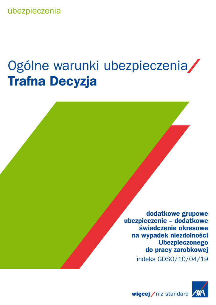 ubezpieczenia Ogólne warunki ubezpieczenia Trafna Decyzja dodatkowe grupowe ubezpieczenie – dodatkowe świadczenie okresowe na wypadek niezdolności Ubezpieczonego do pracy zarobkowej indeks GDSO/10/04/19 Ogólne warunki dodatkowego grupowego ubezpieczenia – dodatkowe świadczenie okresowe na wypadek niezdolności Ubezpieczonego do pracy zarobkowej INDEKS GDSO/10/04/19 Ogólne warunki dodatkowego grupowego ubezpieczenia – dodatkowe świadczenie okresowe na wypadek niezdolności Ubezpieczonego do pracy zarobkowej („OWUD”) mają zastosowanie do umów dodatkowych zawieranych pomiędzy AXA a Właścicielami polis. Jest to rozszerzenie zakresu ubezpieczenia umowy podstawowej zawartej na podstawie Ogólnych warunków grupowego ubezpieczenia Trafna Decyzja. Wiemy, jak istotną rzeczą jest pełne zrozumienie warunków umowy, dlatego przygotowaliśmy przewodnik „Co to dla Ciebie oznacza?”, zawierający czytelne podsumowanie najistotniejszych zagadnień. Dodatkowo, słowa wyróżnione pogrubioną kursywą zostały zdefiniowane na końcu dokumentu. Spis treści Poszczególne zagadnienia zostały opisane w następującej kolejności: I. Twoje ubezpieczenie 3 Kto może zostać ubezpieczony w ramach umowy dodatkowej Co AXA ubezpiecza i za co odpowiada W jaki sposób zawierana jest umowa dodatkowa Na jaki czas zawierana jest umowa ubezpieczenia W jakim czasie trwa odpowiedzialność AXA Suma ubezpieczenia Wysokość składki indywidualnej z tytułu umowy dodatkowej Opłacanie składki z tytułu umowy dodatkowej II. Świadczenie ubezpieczeniowe 4 W jaki sposób obliczamy wysokości świadczeń Dokumenty potrzebne do wypłaty świadczenia ubezpieczeniowego III. Za co AXA nie odpowiada 5 Kiedy świadczenie nie zostanie wypłacone IV. Rezygnacja, wypowiedzenie, rozwiązanie umowy ubezpieczenia 6 Kiedy można zrezygnować z umowy dodatkowej Kiedy można wypowiedzieć umowę dodatkową Kiedy umowa dodatkowa ulegnie rozwiązaniu V. Definicje Co oznaczają poszczególne pojęcia Postanowienia końcowe 6 I. TWOJE UBEZPIECZENIE Ogólne warunki dodatkowego grupowego ubezpieczenia – dodatkowe świadczenie okresowe na wypadek niezdolności Ubezpieczonego do pracy zarobkowej (OWUD) Co to dla Ciebie oznacza? Kto może zostać ubezpieczony w ramach umowy dodatkowej? Umową dodatkową mogą być objęci wyłącznie pracownicy ubezpieczeni w ramach umowy podstawowej Trafna Decyzja. Sprawdź w kolumnie obok, czy wszystkie te osoby spełniają warunki dotyczące ich wieku. §1 Ubezpieczonym w ramach umowy dodatkowej może być wyłącznie Ubezpieczony w ramach umowy podstawowej, który w dniu podpisania wniosku ubezpieczeniowego spełnia łącznie następujące warunki: 1) ma ukończony 18. rok życia; 2) nie ukończył 55. roku życia – w przypadku gdy Ubezpieczony jest mężczyzną albo 50. roku życia – w przypadku gdy Ubezpieczony jest kobietą. Co AXA ubezpiecza i za co odpowiada? Ubezpieczenie ma na celu wesprzeć Twoich Pracowników, jeżeli z powodu nieszczęśliwego wypadku staną się niezdolni do wykonywania pracy zarobkowej. §2 1. Przedmiotem ubezpieczenia jest zdrowie Ubezpieczonego. 2. Zakres ubezpieczenia obejmuje niezdolność Ubezpieczonego do pracy zarobkowej w następstwie nieszczęśliwego wypadku zaistniałego w okresie odpowiedzialności AXA. W jaki sposób zawierana jest umowa dodatkowa? Zasady i tryb zawarcia tej umowy są takie same jak dla umowy podstawowej. Sprawdź szczegóły w OWU Trafna Decyzja. §3 1. Umowa dodatkowa może być zawarta wyłącznie jako rozszerzenie zakresu umowy podstawowej: jednocześnie z umową podstawową lub w każdą rocznicę polisy. 2. Umowa dodatkowa zawierana jest w tym samym trybie co umowa podstawowa, na zasadach określonych w umowie podstawowej. Na jaki czas zawierana jest umowa ubezpieczenia? Umowa dodatkowa zawierana jest na 1 rok i ulega automatycznemu przedłużaniu na kolejny roczny okres. Jeżeli nie chcesz, aby umowa uległa przedłużeniu, powinieneś nas o tym pisemnie poinformować. Pamiętaj, że możesz to uczynić najpóźniej na 2 miesiące przed upływem okresu, na jaki umowa ta została zawarta. Umowa dodatkowa nie może funkcjonować bez umowy podstawowej, dlatego można ją przedłużać maksymalnie do końca obowiązywania umowy podstawowej. §4 Umowa dodatkowa zawierana jest na okres 1 roku, licząc od daty rozpoczęcia ochrony, i może być przedłużana na kolejny okres na tych samych zasadach co umowa podstawowa. W jakim czasie trwa odpowiedzialność AXA? §5 W okresie zawieszenia opłacania składki, ochrona z umowy dodatkowej nie jest udzielana. Ochrona wygasa w przypadkach i terminach określonych w umowie podstawowej, a także w przypadku rozwiązania lub odstąpienia od umowy dodatkowej, oraz dodatkowo, w stosunku do danego Ubezpieczonego, w związku z przekroczeniem przez niego określonego wieku, wypłatą świadczenia z tytułu tej umowy, a także w przypadku jego śmierci. Początek ochrony ubezpieczeniowej 1. Odpowiedzialność AXA z tytułu udzielania ochrony ubezpieczeniowej rozpoczyna się w dacie rozpoczęcia ochrony, nie wcześniej jednak niż w dniu opłacenia składki łącznej. 2. AXA ponosi odpowiedzialność z tytułu udzielania ochrony ubezpieczeniowej w okresie obowiązywania umowy dodatkowej, z zastrzeżeniem postanowień ust. 3 niniejszego paragrafu. Zawieszenie ochrony ubezpieczeniowej 3. AXA nie ponosi odpowiedzialności z tytułu udzielania ochrony ubezpieczeniowej w okresie zawieszenia opłacania składki łącznej, zgodnie z § 22 OWU. Wygaśnięcie ochrony ubezpieczeniowej 4. Odpowiedzialność AXA z tytułu udzielania ochrony ubezpieczeniowej wygasa z dniem: 1) rozwiązania umowy podstawowej lub dodatkowej; 2) odstąpienia od umowy podstawowej lub umowy dodatkowej przez Właściciela polisy; 3) w stosunku do danego Ubezpieczonego: a) z upływem ostatniego dnia roku umowy dodatkowej, w którym ten Ubezpieczony ukończył 64 lata – gdy Ubezpieczony jest mężczyzną albo 59 lat – w