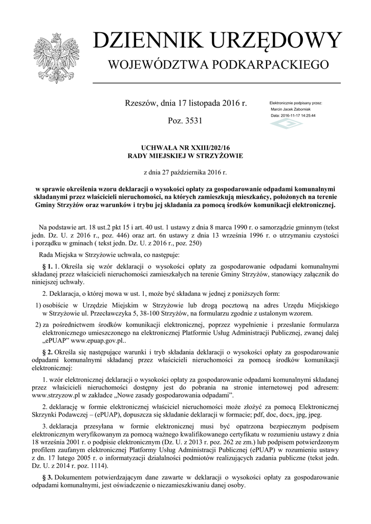 DZIENNIK URZĘDOWY WOJEWÓDZTWA PODKARPACKIEGO Rzeszów, dnia 17 listopada 2016 r. Elektronicznie podpisany przez: Marcin Jacek Zaborniak Poz. 3531 Data: 2016-11-17 14:25:44 UCHWAŁA NR XXIII/202/16 RADY MIEJSKIEJ W STRZYŻOWIE z dnia 27 października 2016 r. w sprawie określenia wzoru deklaracji o wysokości opłaty za gospodarowanie odpadami komunalnymi składanymi przez właścicieli nieruchomości, na których zamieszkują mieszkańcy, położonych na terenie Gminy Strzyżów oraz warunków i trybu jej składania za pomocą środków komunikacji elektronicznej. Na podstawie art. 18 ust.2 pkt 15 i art. 40 ust. 1 ustawy z dnia 8 marca 1990 r. o samorządzie gminnym (tekst jedn. Dz. U. z 2016 r., poz. 446) oraz art. 6n ustawy z dnia 13 września 1996 r. o utrzymaniu czystości i porządku w gminach ( tekst jedn. Dz. U. z 2016 r., poz. 250) Rada Miejska w Strzyżowie uchwala, co następuje: § 1. 1. Określa się wzór deklaracji o wysokości opłaty za gospodarowanie odpadami komunalnymi składanej przez właścicieli nieruchomości zamieszkałych na terenie Gminy Strzyżów, stanowiący załącznik do niniejszej uchwały. 2. Deklaracja, o której mowa w ust. 1, może być składana w jednej z poniższych form: 1) osobiście w Urzędzie Miejskim w Strzyżowie lub drogą pocztową na adres Urzędu Miejskiego w Strzyżowie ul. Przecławczyka 5, 38-100 Strzyżów, na formularzu zgodnie z ustalonym wzorem. 2) za pośrednictwem środków komunikacji elektronicznej, poprzez wypełnienie i przesłanie formularza elektronicznego umieszczonego na elektronicznej Platformie Usług Administracji Publicznej, zwanej dalej „ePUAP” www.epuap.gov.pl.. § 2. Określa się następujące warunki i tryb składania deklaracji o wysokości opłaty za gospodarowanie odpadami komunalnymi składanej przez właścicieli nieruchomości za pomocą środków komunikacji elektronicznej: 1. wzór elektronicznej deklaracji o wysokości opłaty za gospodarowanie odpadami komunalnymi składanej przez właścicieli nieruchomości dostępny jest do pobrania na stronie internetowej pod adresem: www.strzyzow.pl w zakładce „Nowe zasady gospodarowania odpadami”. 2. deklarację w formie elektronicznej właściciel nieruchomości może złożyć za pomocą Elektronicznej Skrzynki Podawczej – (ePUAP), dopuszcza się składanie deklaracji w formacie; pdf, doc, docx, jpg, jpeg. 3. deklaracja przesyłana w formie elektronicznej musi być opatrzona bezpiecznym podpisem elektronicznym weryfikowanym za pomocą ważnego kwalifikowanego certyfikatu w rozumieniu ustawy z dnia 18 września 2001 r. o podpisie elektronicznym (Dz. U. z 2013 r. poz. 262 ze zm.) lub podpisem potwierdzonym profilem zaufanym elektronicznej Platformy Usług Administracji Publicznej (ePUAP) w rozumieniu ustawy z dn. 17 lutego 2005 r. o informatyzacji działalności podmiotów realizujących zadania publiczne (tekst jedn. Dz. U. z 2014 r. poz. 1114). § 3. Dokumentem potwierdzającym dane zawarte w deklaracji o wysokości opłaty za gospodarowanie odpadami komunalnymi, jest oświadczenie o niezamieszkiwaniu danej osoby. Dziennik Urzędowy Województwa Podkarpackiego –2– Poz. 3531 § 4. Wykonanie uchwały powierza się Burmistrzowi Strzyżowa a nadzór nad wykonaniem uchwały powierza się Komisji ds. Infrastruktury, Wsi i Rolnictwa. § 5. Uchwała wchodzi w życie po upływie 14 dni od dnia jej ogłoszenia w Dzienniku Urzędowym Województwa Podkarpackiego. Przewodnicząca Rady Miejskiej w Strzyżowie mgr Wioletta Drozd Dziennik Urzędowy Województwa Podkarpackiego –3– Poz. 3531 Dziennik Urzędowy Województwa Podkarpackiego –4– Poz. 3531 Dziennik Urzędowy Województwa Podkarpackiego –5– Poz. 3531