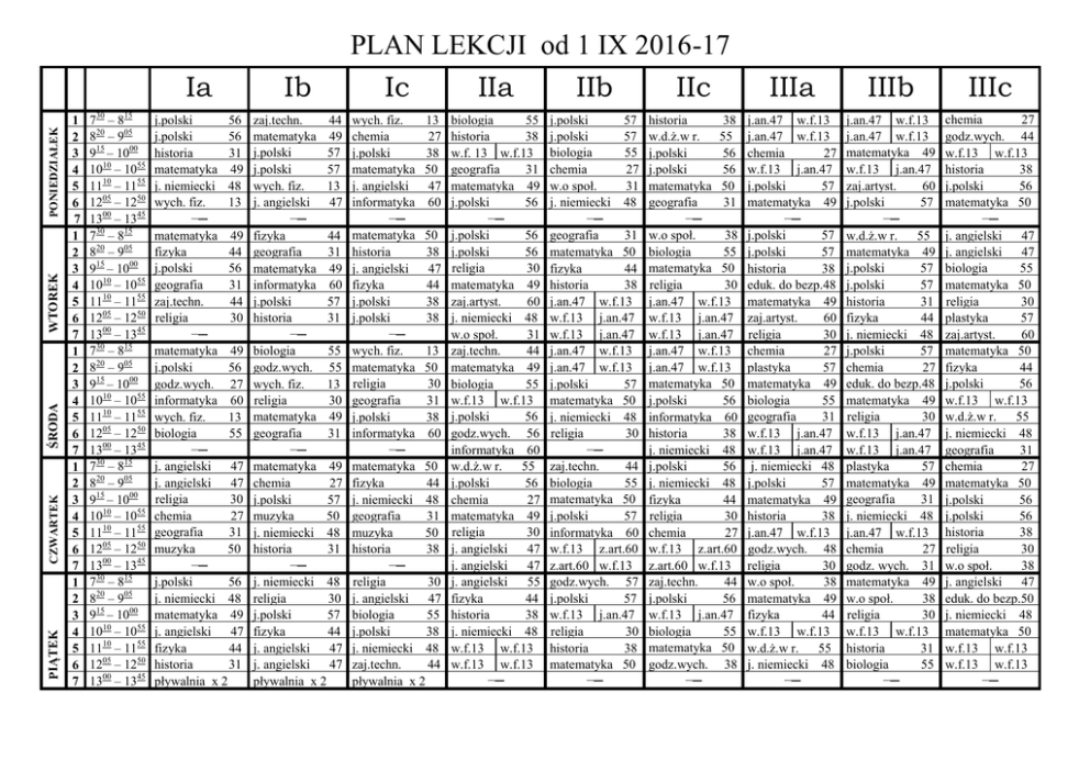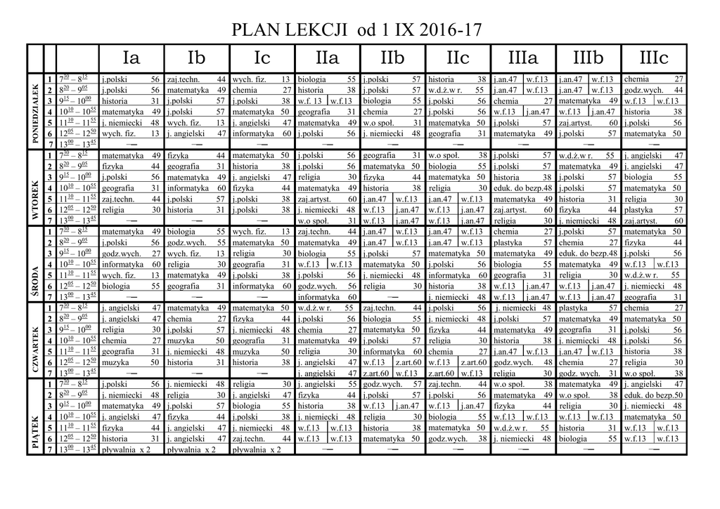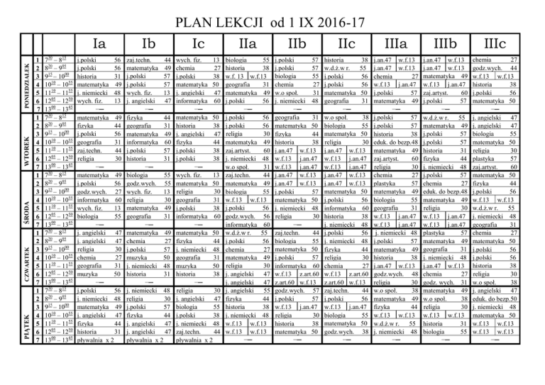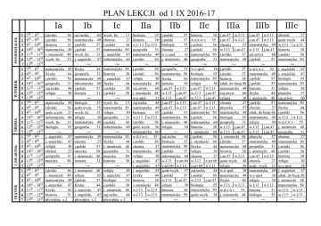 PONIEDZIAŁEK WTOREK ŚRODA CZWARTEK PIĄTEK 1 2 3 4 5 6 7 1 2 3 4 5 6 7 1 2 3 4 5 6 7 1 2 3 4 5 6 7 1 2 3 4 5 6 7 730 – 815 820 – 905 915 – 1000 1010 – 1055 1110 – 1155 1205 – 1250 1300 – 1345 730 – 815 820 – 905 915 – 1000 1010 – 1055 1110 – 1155 1205 – 1250 1300 – 1345 730 – 815 820 – 905 915 – 1000 1010 – 1055 1110 – 1155 1205 – 1250 1300 – 1345 730 – 815 820 – 905 915 – 1000 1010 – 1055 1110 – 1155 1205 – 1250 1300 – 1345 730 – 815 820 – 905 915 – 1000 1010 – 1055 1110 – 1155 1205 – 1250 1300 – 1345 Ia Ib j.polski 56 j.polski 56 historia 31 matematyka 49 j. niemiecki 48 wych. fiz. 13 −─ matematyka 49 fizyka 44 j.polski 56 geografia 31 zaj.techn. 44 religia 30 −─ matematyka 49 j.polski 56 godz.wych. 27 informatyka 60 wych. fiz. 13 biologia 55 −─ j. angielski 47 j. angielski 47 religia 30 chemia 27 geografia 31 muzyka 50 −─ j.polski 56 j. niemiecki 48 matematyka 49 j. angielski 47 fizyka 44 historia 31 pływalnia x 2 zaj.techn. 44 matematyka 49 j.polski 57 j.polski 57 wych. fiz. 13 j. angielski 47 −─ fizyka 44 geografia 31 matematyka 49 informatyka 60 j.polski 57 historia 31 −─ biologia 55 godz.wych. 55 wych. fiz. 13 religia 30 matematyka 49 geografia 31 −─ matematyka 49 chemia 27 j.polski 57 muzyka 50 j. niemiecki 48 historia 31 −─ j. niemiecki 48 religia 30 j.polski 57 fizyka 44 j. angielski 47 j. angielski 47 pływalnia x 2 PLAN LEKCJI od 1 IX 2016-17 Ic IIa IIb IIc wych. fiz. 13 chemia 27 j.polski 38 matematyka 50 j. angielski 47 informatyka 60 −─ matematyka 50 historia 38 j. angielski 47 fizyka 44 j.polski 38 j.polski 38 −─ wych. fiz. 13 matematyka 50 religia 30 geografia 31 j.polski 38 informatyka 60 −─ matematyka 50 fizyka 44 j. niemiecki 48 geografia 31 muzyka 50 historia 38 −─ religia 30 j. angielski 47 biologia 55 j.polski 38 j. niemiecki 48 zaj.techn. 44 pływalnia x 2 biologia 55 historia 38 w.f. 13 w.f.13 geografia 31 matematyka 49 j.polski 56 −─ j.polski 56 j.polski 56 religia 30 matematyka 49 zaj.artyst. 60 j. niemiecki 48 w.o społ. 31 zaj.techn. 44 matematyka 49 biologia 55 w.f.13 w.f.13 j.polski 56 godz.wych. 56 informatyka 60 w.d.ż.w r. 55 j.polski 56 chemia 27 matematyka 49 religia 30 j. angielski 47 j. angielski 47 j. angielski 55 fizyka 44 historia 38 j. niemiecki 48 w.f.13 w.f.13 w.f.13 w.f.13 −─ j.polski 57 j.polski 57 biologia 55 chemia 27 w.o społ. 31 j. niemiecki 48 −─ geografia 31 matematyka 50 fizyka 44 historia 38 j.an.47 w.f.13 w.f.13 j.an.47 w.f.13 j.an.47 j.an.47 w.f.13 j.an.47 w.f.13 j.polski 57 matematyka 50 j. niemiecki 48 religia 30 −─ zaj.techn. 44 biologia 55 matematyka 50 j.polski 57 informatyka 60 w.f.13 z.art.60 z.art.60 w.f.13 godz.wych. 57 j.polski 57 w.f.13 j.an.47 religia 30 historia 38 matematyka 50 −─ historia 38 w.d.ż.w r. 55 j.polski 56 j.polski 56 matematyka 50 geografia 31 −─ w.o społ. 38 biologia 55 matematyka 50 religia 30 j.an.47 w.f.13 w.f.13 j.an.47 w.f.13 j.an.47 j.an.47 w.f.13 j.an.47 w.f.13 matematyka 50 j.polski 56 informatyka 60 historia 38 j. niemiecki 48 j.polski 56 j. niemiecki 48 fizyka 44 religia 30 chemia 27 w.f.13 z.art.60 z.art.60 w.f.13 zaj.techn. 44 j.polski 56 w.f.13 j.an.47 biologia 55 matematyka 50 godz.wych. 38 −─ IIIa IIIb IIIc j.an.47 w.f.13 j.an.47 w.f.13 chemia 27 w.f.13 j.an.47 j.polski 57 matematyka 49 −─ j.polski 57 j.polski 57 historia 38 eduk. do bezp.48 matematyka 49 zaj.artyst. 60 religia 30 chemia 27 plastyka 57 matematyka 49 biologia 55 geografia 31 w.f.13 j.an.47 w.f.13 j.an.47 j. niemiecki 48 j.polski 57 matematyka 49 historia 38 j.an.47 w.f.13 godz.wych. 48 religia 30 w.o społ. 38 matematyka 49 fizyka 44 w.f.13 w.f.13 w.d.ż.w r. 55 j. niemiecki 48 −─ j.an.47 w.f.13 j.an.47 w.f.13 matematyka 49 w.f.13 j.an.47 zaj.artyst. 60 j.polski 57 −─ w.d.ż.w r. 55 matematyka 49 j.polski 57 j.polski 57 historia 31 fizyka 44 j. niemiecki 48 j.polski 57 chemia 27 eduk. do bezp.48 matematyka 49 religia 30 w.f.13 j.an.47 w.f.13 j.an.47 plastyka 57 matematyka 49 geografia 31 j. niemiecki 48 j.an.47 w.f.13 chemia 27 godz. wych. 31 matematyka 49 w.o społ. 38 religia 30 w.f.13 w.f.13 historia 31 biologia 55 −─ chemia 27 godz.wych. 44 w.f.13 w.f.13 historia 38 j.polski 56 matematyka 50 −─ j. angielski 47 j. angielski 47 biologia 55 matematyka 50 religia 30 plastyka 57 zaj.artyst. 60 matematyka 50 fizyka 44 j.polski 56 w.f.13 w.f.13 w.d.ż.w r. 55 j. niemiecki 48 geografia 31 chemia 27 matematyka 50 j.polski 56 j.polski 56 historia 38 religia 30 w.o społ. 38 j. angielski 47 eduk. do bezp.50 j. niemiecki 48 matematyka 50 w.f.13 w.f.13 w.f.13 w.f.13 −─