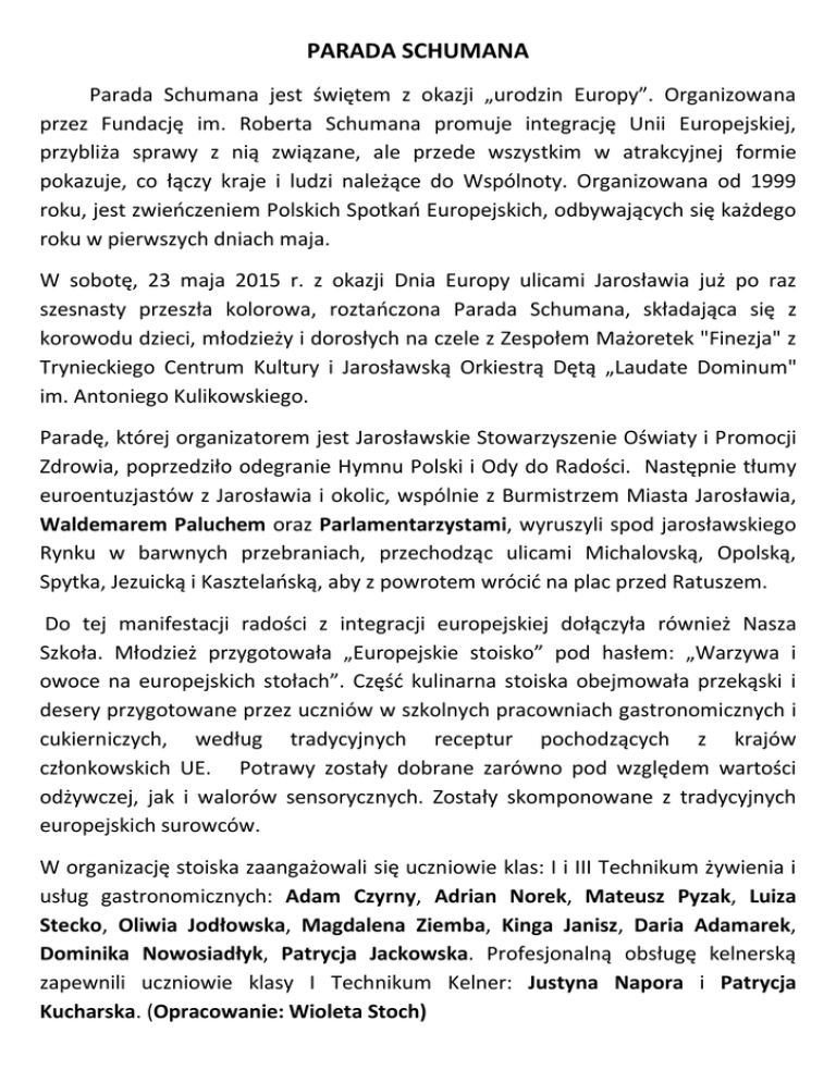 PARADA SCHUMANA Parada Schumana jest świętem z okazji „urodzin Europy”. Organizowana przez Fundację im. Roberta Schumana promuje integrację Unii Europejskiej, przybliża sprawy z nią związane, ale przede wszystkim w atrakcyjnej formie pokazuje, co łączy kraje i ludzi należące do Wspólnoty. Organizowana od 1999 roku, jest zwieńczeniem Polskich Spotkań Europejskich, odbywających się każdego roku w pierwszych dniach maja. W sobotę, 23 maja 2015 r. z okazji Dnia Europy ulicami Jarosławia już po raz szesnasty przeszła kolorowa, roztańczona Parada Schumana, składająca się z korowodu dzieci, młodzieży i dorosłych na czele z Zespołem Mażoretek "Finezja" z Trynieckiego Centrum Kultury i Jarosławską Orkiestrą Dętą „Laudate Dominum" im. Antoniego Kulikowskiego. Paradę, której organizatorem jest Jarosławskie Stowarzyszenie Oświaty i Promocji Zdrowia, poprzedziło odegranie Hymnu Polski i Ody do Radości. Następnie tłumy euroentuzjastów z Jarosławia i okolic, wspólnie z Burmistrzem Miasta Jarosławia, Waldemarem Paluchem oraz Parlamentarzystami, wyruszyli spod jarosławskiego Rynku w barwnych przebraniach, przechodząc ulicami Michalovską, Opolską, Spytka, Jezuicką i Kasztelańską, aby z powrotem wrócić na plac przed Ratuszem. Do tej manifestacji radości z integracji europejskiej dołączyła również Nasza Szkoła. Młodzież przygotowała „Europejskie stoisko” pod hasłem: „Warzywa i owoce na europejskich stołach”. Część kulinarna stoiska obejmowała przekąski i desery przygotowane przez uczniów w szkolnych pracowniach gastronomicznych i cukierniczych, według tradycyjnych receptur pochodzących z krajów członkowskich UE. Potrawy zostały dobrane zarówno pod względem wartości odżywczej, jak i walorów sensorycznych. Zostały skomponowane z tradycyjnych europejskich surowców. W organizację stoiska zaangażowali się uczniowie klas: I i III Technikum żywienia i usług gastronomicznych: Adam Czyrny, Adrian Norek, Mateusz Pyzak, Luiza Stecko, Oliwia Jodłowska, Magdalena Ziemba, Kinga Janisz, Daria Adamarek, Dominika Nowosiadłyk, Patrycja Jackowska. Profesjonalną obsługę kelnerską zapewnili uczniowie klasy I Technikum Kelner: Justyna Napora i Patrycja Kucharska. (Opracowanie: Wioleta Stoch)