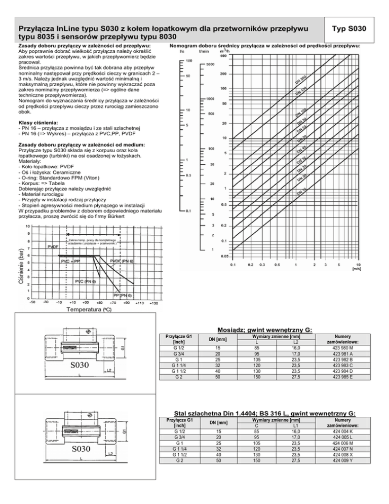 Przyłącza InLine typu S030 z kołem łopatkowym dla przetworników przepływu typu 8035 i sensorów przepływu typu 8030 Zasady doboru przyłączy w zależności od przepływu: Aby poprawnie dobrać wielkość przyłącza należy określić zakres wartości przepływu, w jakich przepływomierz będzie pracował. Średnica przyłącza powinna być tak dobrana aby przepływ nominalny następował przy prędkości cieczy w granicach 2 – 3 m/s. Należy jednak uwzględnić wartość minimalną i maksymalną przepływu, które nie powinny wykraczać poza zakres nominalny przepływomierza (=> ogólne dane techniczne przepływomierza). Nomogram do wyznaczania średnicy przyłącza w zależności od prędkości przepływu cieczy przez rurociąg zamieszczono obok. Typ S030 Nomogram doboru średnicy przyłącza w zależności od prędkości przepływu: Klasy ciśnienia: - PN 16 – przyłącza z mosiądzu i ze stali szlachetnej - PN 16 (=> Wykres) – przyłącza z PVC,PP, PVDF Zasady doboru przyłączy w zależności od medium: Przyłącze typu S030 składa się z korpusu oraz koła łopatkowego (turbinki) na osi osadzonej w łożyskach. Materiały: - Koło łopatkowe: PVDF - Oś i łożyska: Ceramiczne - O-ring: Standardowo FPM (Viton) - Korpus: => Tabela Dobierając przyłącze należy uwzględnić - Materiał rurociągu - Przyjęty w instalacji rodzaj przyłączy - Stopień agresywności medium płynącego w instalacji W przypadku problemów z doborem odpowiedniego materiału przyłacza, proszę zwrócić się do firmy Bürkert Mosiądz; gwint wewnętrzny G: Przyłącze G1 [inch] G 1/2 G 3/4 G1 G 1 1/4 G 1 1/2 G2 DN [mm] 15 20 25 32 40 50 Wymiary zmienne [mm] L L2 85 16,0 95 17,0 105 23,5 120 23,5 130 23,5 150 27,5 Numery zamówieniowe: 423 980 M 423 981 A 423 982 B 423 983 C 423 984 D 423 985 E Stal szlachetna Din 1.4404; BS 316 L, gwint wewnętrzny G: Przyłącze G1 [inch] G 1/2 G 3/4 G1 G 1 1/4 G 1 1/2 G2 DN [mm] 15 20 25 32 40 50 Wymiary zmienne [mm] C L1 85 16,0 95 17,0 105 23,5 120 23,5 130 23,5 150 27,5 Numery zamówieniowe: 424 004 K 424 005 L 424 006 M 424 007 N 424 008 X 424 009 Y Przyłącza InLine typu S030 z kołem łopatkowym dla przetworników przepływu typu 8035 i sensorów przepływu typu 8030 Typ S030 Stal szlachetna Din 1.4404; BS 316 L, przyłącze do wspawania: Przyłącze DN [mm] Do wspawania Do wspawania Do wspawania Do wspawania Do wspawania Do wspawania 15 20 25 32 40 50 Wymiary zmienne [mm] L ∅D 84 21,3 94 26,9 104 33,7 119 42,4 129 48,3 149 60,3 Numery zamówieniowe: 424 028 J 424 029 K 424 030 Q 424 031 D 424 032 E 424 033 F Stal szlachetna Din 1.4404; BS 316 L, przyłącze Tri-Clamp: Przyłącze DN [mm] Tri-Clamp Tri-Clamp Tri-Clamp Tri-Clamp Tri-Clamp Tri-Clamp 15 20 25 32 40 50 Wymiary zmienne [mm] L ∅D 84 21,3 94 26,9 104 33,7 119 42,4 129 48,3 149 60,3 Numery zamówieniowe: 424 028 J 424 029 K 424 030 Q 424 031 D 424 032 E 424 033 F Stal szlachetna Din 1.4404; BS 316 L, przyłącze kołnierzowe: Przyłącze DN [mm] I Kołnierzowe Kołnierzowe Kołnierzowe Kołnierzowe Kołnierzowe Kołnierzowe 15 20 25 32 40 50 23,5 28,5 28,5 31,0 36,0 41,0 Wymiary zmienne [mm] J K M N (Nx∅) 4 x1 4 65,0 95,0 45,0 4 x1 4 75,0 105,0 58,0 4 x1 4 85,0 115,0 68,0 4 x1 8 100,0 140,0 78,0 4 x1 8 110,0 150,0 88,0 4 x1 8 125,0 165,0 102,0 L Numery zamówieniowe: 130 150 160 180 200 230 424 028 J 424 029 K 424 030 Q 424 031 D 424 032 E 424 033 F PVC, PP, PVDF; przyłącze do wklejenia: Przyłącze DN [mm] Kołnierzowe Kołnierzowe Kołnierzowe Kołnierzowe Kołnierzowe Kołnierzowe 15 20 25 32 40 50 Numery zamówieniowe: Wymiary zmienne [mm] ∅D 20 25 32 40 50 63 L 128 144 160 168 188 212 L1 90 100 110 110 120 130 L3 96 106 116 116 127 136 PVC 423 938 N 423 939 P 423 940 U 423 941 R 423 942 J 423 943 K PP 423 956 Q 423 957 R 423 958 S 423 959 T 423 960 Y 423 961 M PVDF 423 968 U 423 969 V 423 970 S 423 971 P 423 972 Q 423 973 R PVC, PP, PVDF; przyłącze do wspawania (PVC – do wklejenia): Przyłącze DN [mm] ∅D Do wklejenia Do wklejenia Do wklejenia Do wklejenia Do wklejenia Do wklejenia 15 20 25 32 40 50 20 25 32 40 50 63 Do wspawania Do wspawania Do wspawania Do wspawania Do wspawania Do wspawania 15 20 25 32 40 50 20 25 32 40 50 63 Do wspawania Do wspawania Do wspawania Do wspawania Do wspawania Do wspawania 15 20 25 32 40 50 20 25 32 40 50 63 Wymiary zmienne [mm] L Wykonanie: PVC 90 100 110 110 120 130 Wykonanie: PP 85 92 95 100 106 110 Wykonanie: PVDF 85 92 95 100 106 110 L2 Numery zamówieniowe: 16,5 20,0 23,0 27,5 30,0 37,0 423 944 L 423 945 M 423 946 N 423 947 P 423 948 Y 423 949 Z 14,0 16,0 18,0 20,0 23,0 27,0 423 962 N 423 963 P 423 964 Q 423 965 R 423 966 J 423 967 K 14,0 16,0 18,0 20,0 23,0 27,0 423 974 J 423 975 K 423 976 L 423 977 M 423 978 W 423 979 X