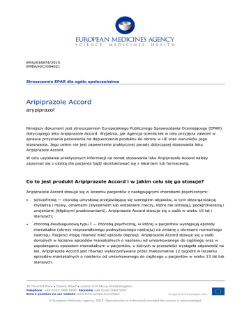 EMA/634874/2015 EMEA/H/C/004021 Streszczenie EPAR dla ogółu społeczeństwa Aripiprazole Accord arypiprazol Niniejszy dokument jest streszczeniem Europejskiego Publicznego Sprawozdania Oceniającego (EPAR) dotyczącego leku Aripiprazole Accord. Wyjaśnia, jak Agencja oceniła lek w celu przyjęcia zaleceń w sprawie przyznania pozwolenia na dopuszczenie produktu do obrotu w UE oraz warunków jego stosowania. Jego celem nie jest zapewnienie praktycznej porady dotyczącej stosowania leku Aripiprazole Accord. W celu uzyskania praktycznych informacji na temat stosowania leku Aripiprazole Accord należy zapoznać się z ulotką dla pacjenta bądź skontaktować się z lekarzem lub farmaceutą. Co to jest produkt Aripiprazole Accord i w jakim celu się go stosuje? Aripiprazole Accord stosuje się w leczeniu pacjentów z następującymi chorobami psychicznymi: • schizofrenią — chorobą umysłową przejawiającą się szeregiem objawów, w tym dezorganizacją myślenia i mowy, omamami (słyszeniem lub widzeniem rzeczy, które nie istnieją), podejrzliwością i urojeniami (błędnymi przekonaniami). Aripiprazole Accord stosuje się u osób w wieku 15 lat i starszych; • chorobą dwubiegunową typu I — chorobą psychiczną, w której u pacjentów występują epizody maniakalne (okresy nieprawidłowego podwyższonego nastroju) na zmianę z okresami normalnego nastroju. Pacjenci mogę również mieć epizody depresji. Aripiprazole Accord stosuje się u osób dorosłych w leczeniu epizodów maniakalnych o nasileniu od umiarkowanego do ciężkiego oraz w zapobieganiu epizodom maniakalnym u pacjentów, u których w przeszłości wystąpiła odpowiedź na lek. Aripiprazole Accord jest również wykorzystywany przez maksymalnie 12 tygodni w leczeniu epizodów maniakalnych o nasileniu od umiarkowanego do ciężkiego u pacjentów w wieku 13 lat lub starszych. 30 Churchill Place ● Canary Wharf ● London E14 5EU ● United Kingdom Telephone +44 (0)20 3660 6000 Facsimile +44 (0)20 3660 5555 Send a question via our website www.ema.europa.eu/contact An agency of the European Union © European Medicines Agency, 2015. Reproduction is authorised provided the source is acknowledged. Aripiprazole Accord zawiera substancję czynną arypiprazol i jest lekiem generycznym. Oznacza to, że Aripiprazole Accord jest podobny do leku referencyjnego o nazwie Abilify, który jest już dopuszczony do obrotu w Unii Europejskiej (UE). Więcej informacji na temat leków generycznych znajduje się w dokumencie z pytaniami i odpowiedziami tutaj. Jak stosować produkt Aripiprazole Accord? Aripiprazole Accord jest dostępny w postaci tabletek (5, 10, 15 i 30 mg), które wydaje się wyłącznie z przepisu lekarza. W przypadku schizofrenii u osób dorosłych zalecana dawka początkowa leku wynosi 10 lub 15 mg na dobę, po czym stosuje się dawkę podtrzymującą 15 mg raz na dobę. U pacjentów w wieku 15–17 lat dawka początkowa wynosi 2 mg na dobę (przy stosowaniu produktu zawierającego arypiprazol w postaci płynnej), po czym dawkę zwiększa się stopniowo do zalecanej dawki 10 mg raz na dobę. W leczeniu epizodów maniakalnych w chorobie dwubiegunowej zalecana dawka początkowa leku dla osób dorosłych wynosi 15 mg raz na dobę w monoterapii lub w skojarzeniu z innymi lekami. U osób dorosłych należy kontynuować przyjmowanie tej samej dawki, aby zapobiegać epizodom maniakalnym. W leczeniu epizodów maniakalnych u pacjentów w wieku 13–17 lat dawka początkowa wynosi 2 mg na dobę (przy stosowaniu produktu zawierającego arypiprazol w postaci płynnej), po czym dawkę zwiększa się stopniowo do zalecanej dawki 10 mg raz na dobę. Leczenie nie powinno trwać dłużej niż 12 tygodni. Dawkę należy dostosować w przypadku pacjentów przyjmujących określone inne leki wpływające na sposób rozkładania leku Aripiprazole Accord w organizmie. Więcej informacji znajduje się w charakterystyce produktu leczniczego (także część EPAR). Jak działa produkt Aripiprazole Accord? Substancja czynna produktu Aripiprazole Accord, arypiprazol, jest lekiem przeciwpsychotycznym. Jego dokładny mechanizm działania jest nieznany, ale wiadomo, że wiąże się on z kilkoma różnymi receptorami na powierzchni komórek nerwowych w mózgu. Zaburza to przesyłanie sygnałów pomiędzy komórkami mózgu przez „neuroprzekaźniki” — związki chemiczne umożliwiające komórkom nerwowym komunikowanie się ze sobą. Uważa się, że działanie arypiprazolu polega głównie na tym, że jest on „częściowym agonistą” receptorów neuroprzekaźników dopaminy i 5-hydroksytryptaminy (zwanej też serotoniną). Oznacza to, że arypiprazol działa jak dopamina i 5-hydroksytryptamina, aktywując te receptory, jednak w mniejszym stopniu niż neuroprzekaźniki. Ze względu na to, że dopamina i 5hydroksytryptamina odgrywają rolę w schizofrenii i chorobie afektywnej dwubiegunowej, arypiprazol pomaga w normalizacji aktywności mózgu, zmniejszając objawy psychotyczne lub maniakalne i zapobiegając ich nawrotom. Jak badano produkt Aripiprazole Accord? Ponieważ produkt Aripiprazole Accord jest lekiem generycznym, badania u pacjentów ograniczono do testów mających określić, czy lek jest biorównoważny w stosunku do leku referencyjnego o nazwie Abilify. Dwa leki są biorównoważne, gdy doprowadzają do wystąpienia jednakowego stężenia substancji czynnej w organizmie. Aripiprazole Accord EMA/634874/2015 Strona 2/3 Jakie korzyści i ryzyko wiążą się ze stosowaniem produktu Aripiprazole Accord? Ponieważ lek Aripiprazole Accord jest lekiem generycznym, biorównoważnym w stosunku do leku referencyjnego, uznaje się, że z jego stosowaniem wiążą się takie same korzyści i ryzyko, jak w przypadku leku referencyjnego. Na jakiej podstawie zatwierdza się produkt Aripiprazole Accord? Komitet ds. Produktów Leczniczych Stosowanych u Ludzi (CHMP) Agencji uznał, że — zgodnie z wymogami UE — wykazano, że lek Aripip