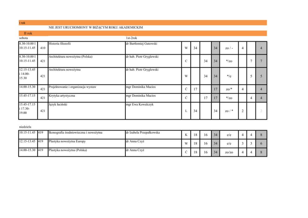 I rok NIE JEST URUCHOMIONY W BIŻĄCYM ROKU AKADEMICKIM II rok sobota 1st-2rok 8.30-10.00 I 10.15-11.45 410 8.30-10.00 I 10.15-11.45 421 12.15-13.45 i 14.0015.30 14.00-15.30 15.45-17.15 15.45-17.15 i 17.3019.00 Historia filozofii dr Bartłomiej Gutowski W Architektura nowożytna (Polska) Architektura nowożytna 421 34 zo / - 4 4 dr hab. Piotr Gryglewski C 34 34 */zo 7 7 W 34 34 */e 5 5 17 zo/* 17 */zo 34 zo / * 2 dr hab. Piotr Gryglewski 421 421 34 Projektowanie i organizacja wystaw mgr Dominika Macios Ć Krytyka artystyczna mgr Dominika Macios Ć Język łaciński mgr Ewa Kowalczyk 421 17 17 4 4 4 4 L 34 2 K 18 16 34 e/e 4 4 8 W 18 16 34 e/e 3 3 6 Ć 18 16 34 zo/zo 4 4 8 niedziela 10.15-11.45 419 Ikonografia średniowieczna i nowożytna dr Izabela Przepałkowska 12.15-13.45 419 Plastyka nowożytna Europy dr Anna Czyż 14.00-15.30 419 Plastyka nowożytna (Polska) dr Anna Czyż 15.45-17.15 417 i 17.3019.00 terminy zajęć 19.10; 09.11; 23.11; 07.12 oraz 21.12 Sztuka i kultura Bizancjum dr Justyna Sprutta 15.45-17.15 417 i 17.3019.00 (terminy zajęć: 22.02; 08.03; 22.03; 12.04) Historia ikony i sztuki cerkiewnej 14 marca (sobota) 23 maja (sobota) 10.00-13.15 Muzeum Narodowe - sztuka nowożytna dr Izabela Przepałkowska Nowożytna architektura Warszawy dr hab. Zbigniew Bania, prof. UKSW W 17 17 e/* 3 3 dr Justyna Sprutta W 17 17 */e 3 3 Ć 4 4 */z 1 1 Ć 4 4 */z 2 2 Ć 4 4 */z 1 1 16 34 352 zo/zo 1 34 2 60 dr Anna Czyż 23 maja (sobota) 14.15-15.45 i 16:0017.30 Rezydencja Jana III w Wilanowie e-learning III rok sobota Język angielski mgr Monika Nowosielska L 18 1 24 10.15-11.45 419 i 12.1513.45 Sztuka wieku XIX prof. dr hab. Andrzej K. Olszewski 10.15-11.45 419 i 12.1513.45 Sztuka pierwszej połowy XX wieku 14.00-15.30 410 Sztuka po 1945 dr Bartłomiej Gutowski 15.45-17.15 417 Sztuka nowoczesna mgr Marta Kowalewska 17.30-19.00 420 Seminarium sztuka współczesna i nowoczesna dr Katarzyna Chrudzimska-Uhera 23 maja (sobota) 10.00-13.15 Współczesna architektura Warszawy dr Piotr Lasek 14 marca (sobota) 10.15-11.45 i 12.1513.45 oraz 18 kwietnia (sobota) 10.15-11.45 i 12.1513.45 Sztuka współczesna (CSW, MSN, Zachęta) W 36 36 e/* 34 34 */e 6 6 prof. dr hab. Andrzej K. Olszewski W 6 6 W 18 16 34 zo/zo 3 3 6 Ć 18 16 34 zo/zo 5 5 10 S 18 16 34 zo/zo 6 6 12 Ć 4 4 */z 2 2 Ć 8 8 */z 3 3 mgr Marta Kowalewska niedziela 8.30-10.00 417 / 418 10.15-11.45 418 Lektorat kontynuacja angielski / włoski Seminarium Plastyka i ikonografia nowożytna oraz sztuka cerkiewna i ormiańska mgr Sławomir Zasuński / mgr Małgorzata Maliszewska prof. dr hab. Waldemar Deluga L 18 16 34 zo/e 1 2 3 S 18 16 34 zo/zo 6 6 12 Łazienki Królewskie 23 maja (sobota) 14.15-15.45 i 16:0017.30 dr Przemysław Nowogórski Ć 4 4 Przygotowanie pracy licencjackiej */z 2 2 -/Zal 10 10 27 45 48 256 SPECJALIZACJA RYNEK DZIEŁ SZTUKI IV rok sobota Seminarium Sztuka współczesna i nowoczesna prof. dr hab. Andrzej K. Olszewski 10.15-11.45 417 Seminarium Architektura X-XIX w. dr hab. Zbigniew Bania, prof. UKSW 12.15-13.45 417 dr hab. Zbigniew Bania, prof. UKSW 15.45-17.15 410 Wykład monograficzny "Architektura Hiszpanii V XVIII wieku" Wykład monograficzny "Wybrane problemy sztuki Art Deco" Historia estetyki i doktryn artystycznych 17.30-19.00 417 Rynek dzieł sztuki współczesnej mgr Marta Kowalewska 8.30-10.00 419 14.00-15.30 419 prof. dr hab. Andrzej K. Olszewski dr Bartłomiej Gutowski S 18 16 34 zo/zo 7 7 14 S 18 16 34 zo/zo 7 7 14 W 18 16 34 z/z 5 5 10 W 18 16 34 z/z 5 5 10 W 18 16 34 zo/zo 3 3 6 17 17 */zo 6 6 4 4 z 0 0 0 4 4 */z 0 2 2 16 34 zo/zo 7 7 14 17 za / * 5 C Szkolenie BHP Nowe technologie w badaniach historii sztuki dr Rafał Zapłata Seminarium Plastyka i ikonografia nowożytna oraz sztuka cerkiewna i ormiańska Rynek dzieł sztuki dawnej prof. dr hab. Waldemar Deluga W niedziela 10.15-11.45 420 12.15-13.45; 421 14.00-15.30 w dniach 7.XII, 21.XII, 18.I, 01.II S 18 W 17 dr Magdalena Białonowska 5 12.15-13.45 421 Rzeczoznawstwo* dr Magdalena Białonowska TERMIN DO UZGODNIE NIA Przygotowywanie publikacji do druku dr Magdalena Gutowska V rok SPECJALIZACJA OCHRONA DÓBR KULTURY W 17 17 */zo 6 6 W 4 4 */z 1 1 39 50 60 267 sobota Seminarium Sztuka współczesna i nowoczesna prof. dr hab. Andrzej K. Olszewski 10.15-11.45 417 Seminarium Architektura X-XIX w. dr hab. Zbigniew Bania, prof. UKSW 15.45-17.15 420 Wykład monograficzny "Zakopane przełomu XIX/XX w. dr Katarzyna Chrudzimska-Uhera jako narodowa i artystyczna Arkadia: fakty i mity" 8.30-10.00 419 S 18 16 34 zo/zo 7 7 14 S 18 16 34 zo/zo 7 7 14 W 18 16 34 z/z 5 5 10 S 18 16 34 zo/zo 7 7 14 W 18 16 34 z/z 5 5 10 34 34 */e 4 4 8 z/* 17 */zo niedziela 10.15-11.45 420 12.15-13.45 420 Seminarium Plastyka i ikonografia nowożytna oraz prof. dr hab. Waldemar Deluga sztuka cerkiewna i ormiańska Wykład monograficzny "Wybrane zagadnienia z historii prof. dr hab. Waldemar Deluga grafiki europejskiej: kontekst przemian ikonograficznych od średniowiecza po współczesność" 14.00-15.30 418 Ochrona i konserwacja zabytków dr Małgorzata Korpała 15.45-19.00 418 (terminy spotkań 19 X i 23 XI) Ochrona zabytków w polityce ogólnopolskiej i regionalnej mgr Margerita Szulińska 15.45-19.00 418 (terminy spotkań od 22.II do 12.IV, zaliczenia 26.IV) Dokumentacja, finansowanie i inwentaryzacja zabytków mgr Margerita Szulińska W K K 8 17 2 2 2 2 23 maja 14.15-15.45 i 16:0017.30 Pomnik historii – wyjazd studyjny do Żyrardowa 18 kwietnia (sobota) 14.15-15.45 i 16:0017.30 UNESCO – Starówka, wartościowanie i wyjątkowa uniwersalna wartość zabytku. TERMIN DO UZGODNIE NIA Zarządzanie projektami w instytucjach kultury mgr Margerita Szulińska Ć 4 4 */z 1 1 Ć 4 4 */z 1 1 4 z/* 0 */zo mgr Margerita Szulińska dr Magdalena Gutowska K Przygotowanie pracy mgr 4 241 2 2 14 35 53 14 60 Zajęcia z podanymi datami dziennymi odbywają się w ternie *Zajęcia z Rzeczoznawsta mają charakter łączony - 22 lutego i 8 marca oraz 14 czerwca w budynku WNHiS oraz 14 marca, 18 kwietnia i 23 