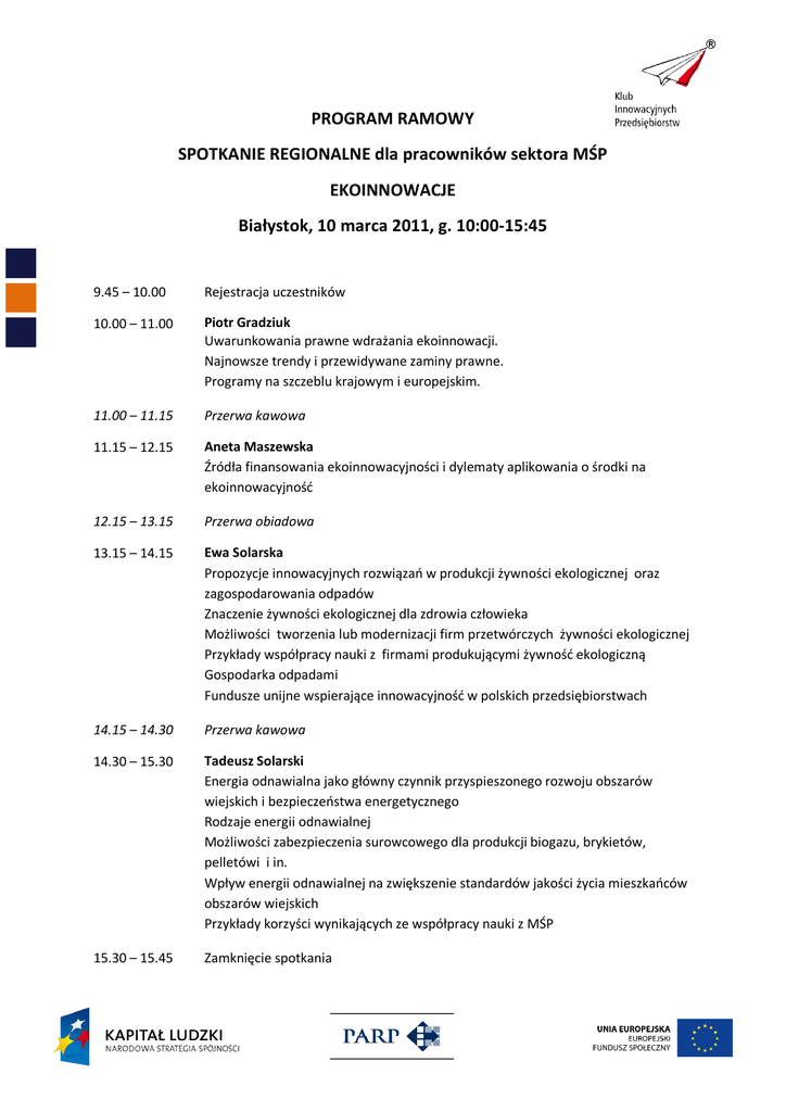 PROGRAM RAMOWY SPOTKANIE REGIONALNE dla pracowników sektora MŚP EKOINNOWACJE Białystok, 10 marca 2011, g. 10:00-15:45 9.45 – 10.00 Rejestracja uczestników 10.00 – 11.00 Piotr Gradziuk Uwarunkowania prawne wdrażania ekoinnowacji. Najnowsze trendy i przewidywane zaminy prawne. Programy na szczeblu krajowym i europejskim. 11.00 – 11.15 Przerwa kawowa 11.15 – 12.15 Aneta Maszewska Źródła finansowania ekoinnowacyjności i dylematy aplikowania o środki na ekoinnowacyjność 12.15 – 13.15 Przerwa obiadowa 13.15 – 14.15 Ewa Solarska Propozycje innowacyjnych rozwiązań w produkcji żywności ekologicznej oraz zagospodarowania odpadów Znaczenie żywności ekologicznej dla zdrowia człowieka Możliwości tworzenia lub modernizacji firm przetwórczych żywności ekologicznej Przykłady współpracy nauki z firmami produkującymi żywność ekologiczną Gospodarka odpadami Fundusze unijne wspierające innowacyjność w polskich przedsiębiorstwach 14.15 – 14.30 Przerwa kawowa 14.30 – 15.30 Tadeusz Solarski Energia odnawialna jako główny czynnik przyspieszonego rozwoju obszarów wiejskich i bezpieczeństwa energetycznego Rodzaje energii odnawialnej Możliwości zabezpieczenia surowcowego dla produkcji biogazu, brykietów, pelletówi i in. Wpływ energii odnawialnej na zwiększenie standardów jakości życia mieszkańców obszarów wiejskich Przykłady korzyści wynikających ze współpracy nauki z MŚP 15.30 – 15.45 Zamknięcie spotkania PRELEGENCI: MIEJSCE SPOTKANIA: Piotr Gradziuk Doktor nauk ekonomicznych, wykładowca oraz kierownik wielu projektów związanych z ekoinnowacjami, rozwojem przedsiębiorczości i marketingiem produktów z obszarów wiejskich. Autor wielu publikacji m.in. na temat odnawialnych źródeł energii. Hotel Branicki ul. Zamenhofa 25, 15-435 Białystok Aneta Maszewska Ekspert i konsultant, koordynator programu ds. MŚP w Krajowym Punkcie Kontaktowym Programów Badawczych UE (IPPT PAN). Ekspert Poznańskiego Parku NaukowoTechnologicznego. Członek Grupy Roboczej ds. opracowania nowego programu wsparcia dla innowacyjnych MŚP. Ewa Solarska Profesor doktor habilitowany, wykładowca, a także ekspert w Lubelskim Parku NaukowoTechnologicznym oraz w Lubelskim Klubie Biznesu w zakresie współpracy z przedsiębiorstwami Specjalista w zakresie ekologicznej żywności, doświadczona we współpracy z przedsiębiorstwami. Źródło: http://maps.google.pl/ Organizator spotkania zapewnia poczęstunek w trakcie przerw kawowych oraz lunch. Tadeusz Solarski Doktor inżynier techniki rolniczej, ekspert posiadający 15 lat doświadczenia zawodowego w pracy w firmach lub instytucjach wspierających rozwój przedsiębiorczości. Specjalizuje się w temacie energii odnawialnych, szczególnie w biogazowniach. Spotkanie jest organizowane w ramach projektu „Rozwój zasobów ludzkich poprzez promowanie wiedzy, transfer i upowszechnianie innowacji”, współfinansowanego przez Unię Europejską w ramach środków Europejskiego Funduszu Społecznego.