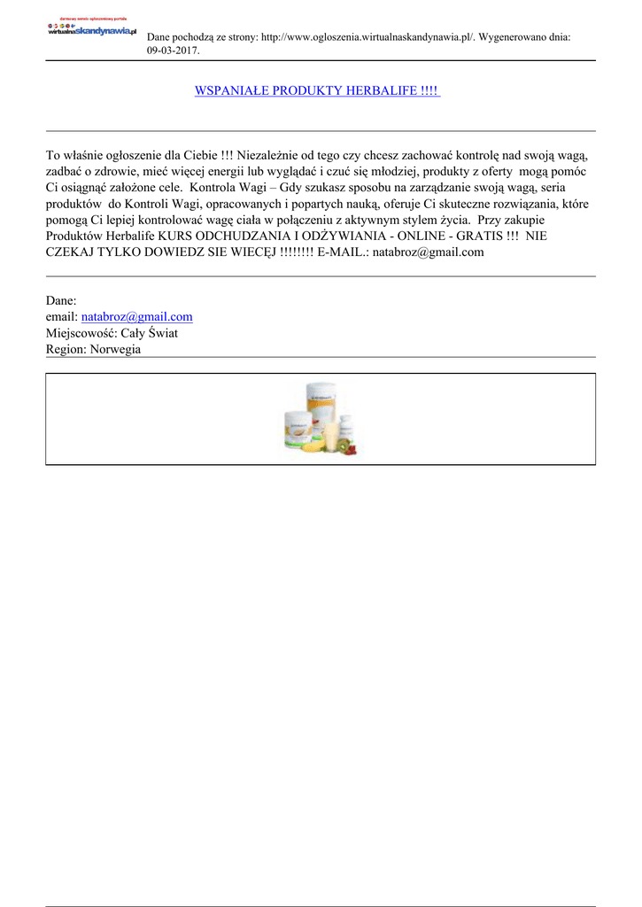 Dane pochodzą ze strony: http://www.ogloszenia.wirtualnaskandynawia.pl/. Wygenerowano dnia: 09-03-2017. WSPANIAŁE PRODUKTY HERBALIFE !!!! To właśnie ogłoszenie dla Ciebie !!! Niezależnie od tego czy chcesz zachować kontrolę nad swoją wagą, zadbać o zdrowie, mieć więcej energii lub wyglądać i czuć się młodziej, produkty z oferty mogą pomóc Ci osiągnąć założone cele. Kontrola Wagi – Gdy szukasz sposobu na zarządzanie swoją wagą, seria produktów do Kontroli Wagi, opracowanych i popartych nauką, oferuje Ci skuteczne rozwiązania, które pomogą Ci lepiej kontrolować wagę ciała w połączeniu z aktywnym stylem życia. Przy zakupie Produktów Herbalife KURS ODCHUDZANIA I ODŻYWIANIA - ONLINE - GRATIS !!! NIE CZEKAJ TYLKO DOWIEDZ SIE WIECĘJ !!!!!!!! E-MAIL.: [email protected] Dane: email: [email protected] Miejscowość: Cały Świat Region: Norwegia