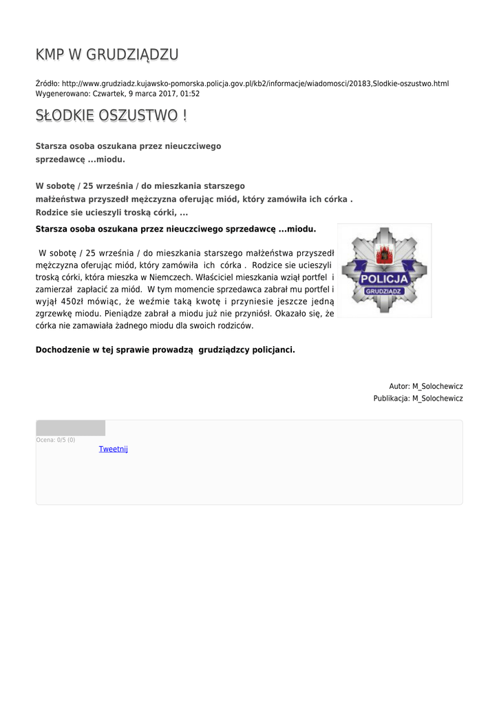 KMP W GRUDZIĄDZU Źródło: http://www.grudziadz.kujawsko-pomorska.policja.gov.pl/kb2/informacje/wiadomosci/20183,Slodkie-oszustwo.html Wygenerowano: Czwartek, 9 marca 2017, 01:52 SŁODKIE OSZUSTWO ! Starsza osoba oszukana przez nieuczciwego sprzedawcę ...miodu. W sobotę / 25 września / do mieszkania starszego małżeństwa przyszedł mężczyzna oferując miód, który zamówiła ich córka . Rodzice sie ucieszyli troską córki, ... Starsza osoba oszukana przez nieuczciwego sprzedawcę ...miodu. W sobotę / 25 września / do mieszkania starszego małżeństwa przyszedł mężczyzna oferując miód, który zamówiła ich córka . Rodzice sie ucieszyli troską córki, która mieszka w Niemczech. Właściciel mieszkania wziął portfel i zamierzał zapłacić za miód. W tym momencie sprzedawca zabrał mu portfel i wyjął 450zł mówiąc, że weźmie taką kwotę i przyniesie jeszcze jedną zgrzewkę miodu. Pieniądze zabrał a miodu już nie przyniósł. Okazało się, że córka nie zamawiała żadnego miodu dla swoich rodziców. Dochodzenie w tej sprawie prowadzą grudziądzcy policjanci. Autor: M_Solochewicz Publikacja: M_Solochewicz Ocena: 0/5 (0) Tweetnij