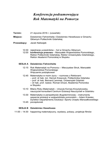 Konferencja podsumowująca Rok Matematyki na Pomorzu Termin: 21 stycznia 2016 r. (czwartek) Miejsce: Dziedziniec Fahrenheita i Dziedziniec Heweliusza w Gmachu Głównym Politechniki Gdańskiej Prowadzący: Jacek Naliwajek 10:30 rejestracja uczestników – hol w Gmachu Głównym 12:00 konferencja prasowa – Marszałek Województwa Pomorskiego, Rektor Politechniki Gdańskiej, Rektor Uniwersytetu Gdańskiego, Rektor Akademii Pomorskiej w Słupsku SESJA A Dziedziniec Fahrenheita 12:15 Rok Matematyki na Pomorzu – Mieczysław Struk, Marszałek Województwa Pomorskiego Wręczenie podziękowań 12:45 Matematyka w moim życiu – rozmowa z Rektorami – prof. dr hab. inż. Henryk Krawczyk, Politechnika Gdańska – prof. dr hab. Bernard Lammek, Uniwersytet Gdański – dr hab. prof. nadzw. Roman Drozd, Akademia Pomorska w Słupsku 13:10 Bilans Roku Matematyki – Urszula Kornas-Krzyżykowska, nauczyciel konsultant Centrum Edukacji Nauczycieli w Gdańsku 13:30 Matematyka w perspektywie długoterminowej – instrumenty wsparcia edukacji w województwie pomorskim – Adam Krawiec, Dyrektor Departamentu Edukacji i Sportu Urzędu Marszałkowskiego 13:45 poczęstunek SESJA B Dziedziniec Heweliusza 11:00 – 14:30 happening matematyczny, wystawy, pokazy, projekcje filmów